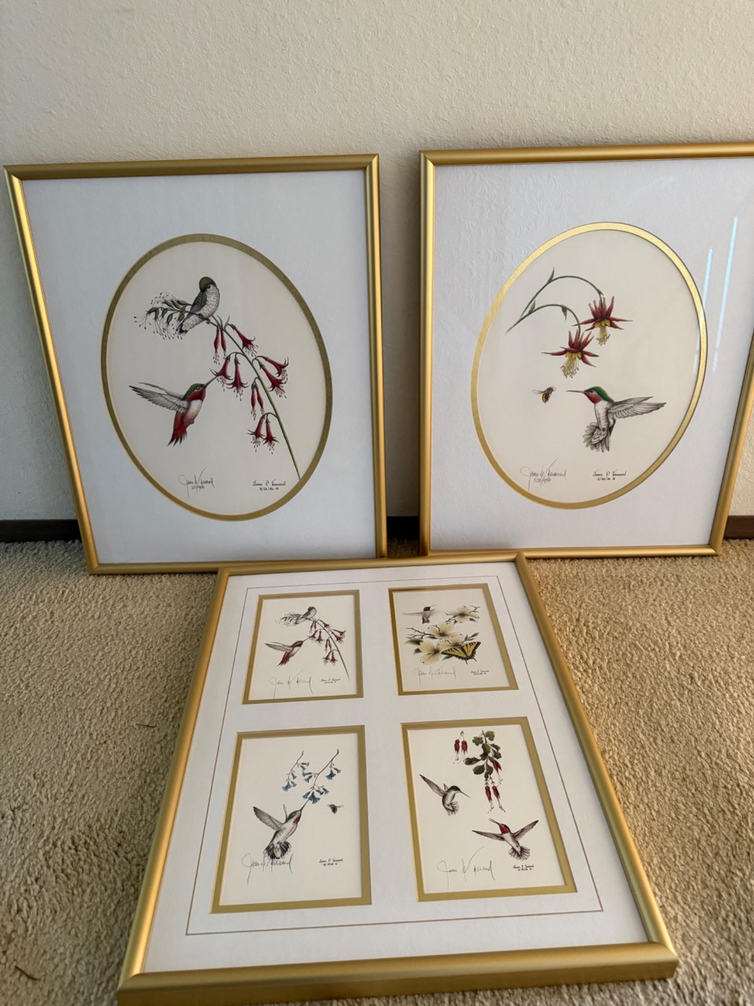 James P. Townsend Signed & Dated Hummingbird & Butterfly Prints – Set of 3 Beautiful set of three framed prints featuring hummingbirds and a butterfly, each signed and dated by artist James P. Townsend. The delicate artwork showcases these graceful creatures interacting with vibrant floral elements, all framed in elegant gold-tone frames with matching matting for a sophisticated presentation. Each piece measures 20” W x 16” T. Perfect for bird and nature lovers, these pieces bring a touch of elegance and charm to any home décor.