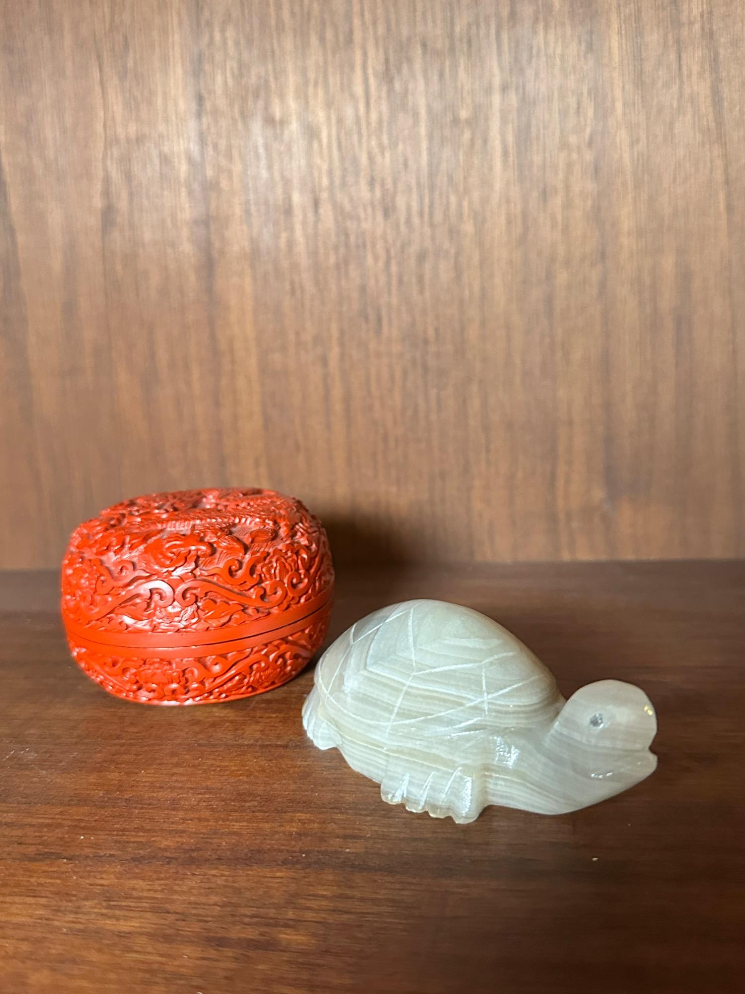 Chinese Cinnabar Lacquer Box & Carved Stone Turtle Figurine This Chinese cinnabar lacquer box features an intricately carved design with rich red tones, showcasing traditional craftsmanship. The box is perfect for storing small keepsakes or as a decorative accent piece. Accompanying it is a hand-carved stone turtle figurine in a soft white hue with delicate etchings. Together, these two unique pieces make a wonderful addition to any collection of Asian-inspired art and décor.