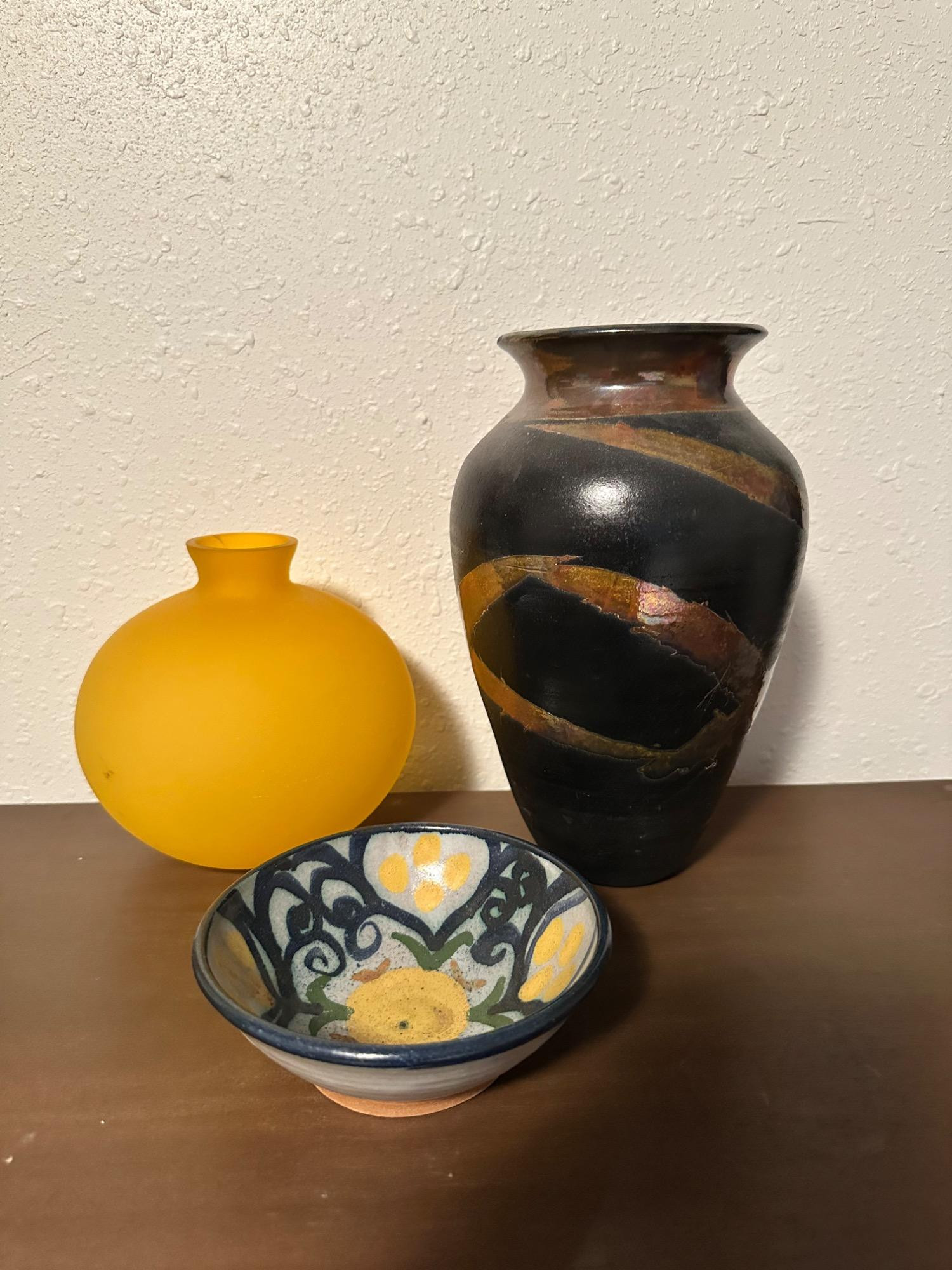 Lot # 59 - Handcrafted Yellow Glass Vase Set & Pottery Bowl