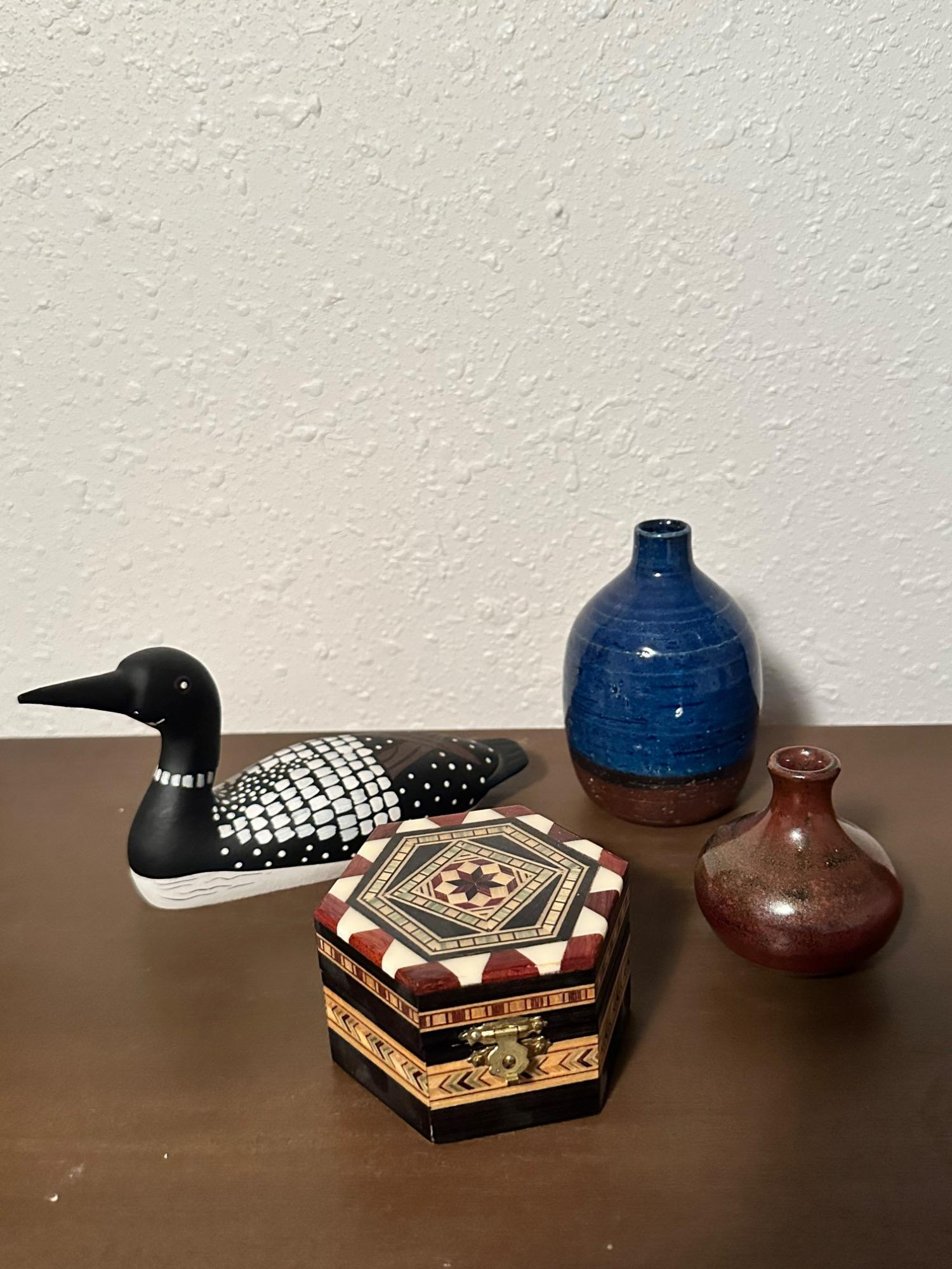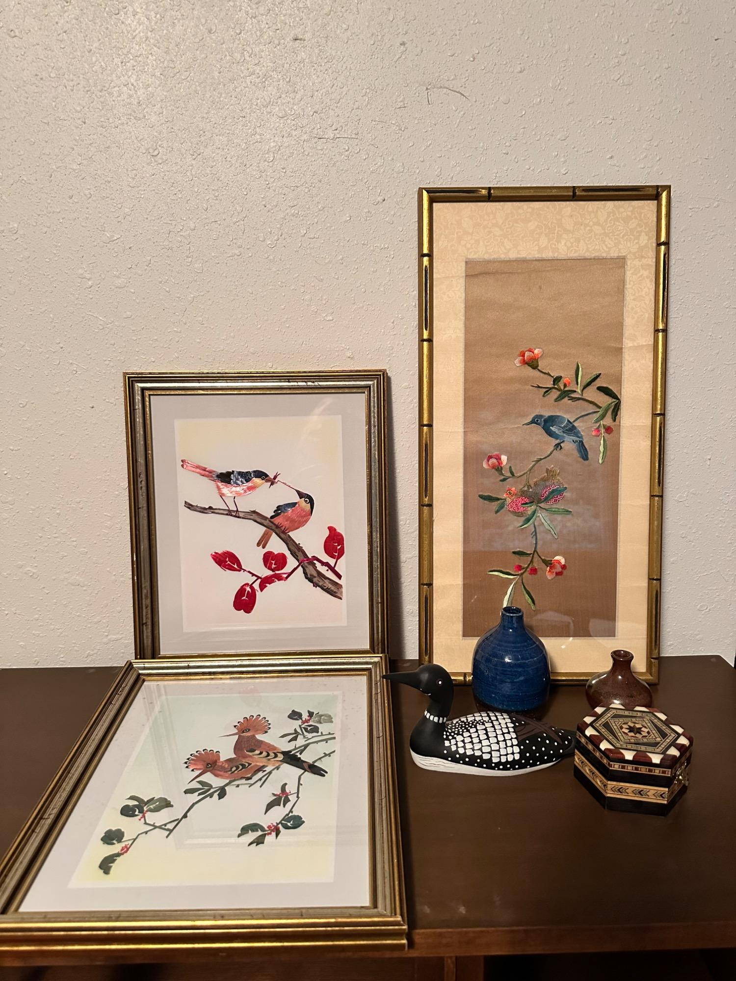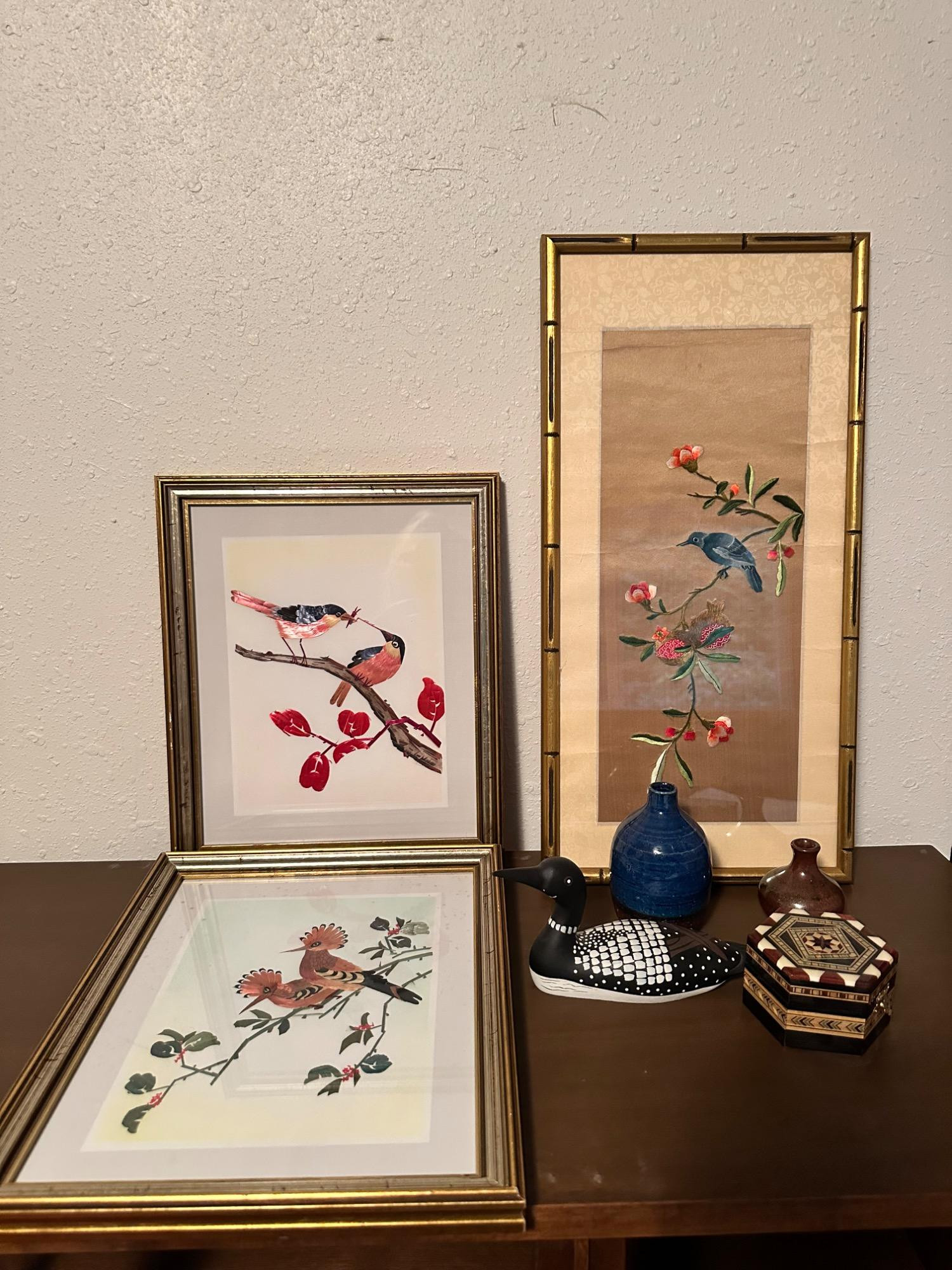 Bird Artwork & Collectible Decorative Pieces Asian Inspired. Add charm and elegance to your collection with this delightful set of vintage bird artwork and collectible decor items. The set includes three beautifully framed bird-themed prints, each showcasing exquisite detail and vibrant colors. Additionally, the collection includes a Decorative Ceramic Duck, painted with intricate details in black and white, and a Handcrafted Wooden Box, beautifully adorned with inlaid designs, perfect for storage or display. This collection is perfect for bird lovers and those with a passion for unique, vintage pieces.