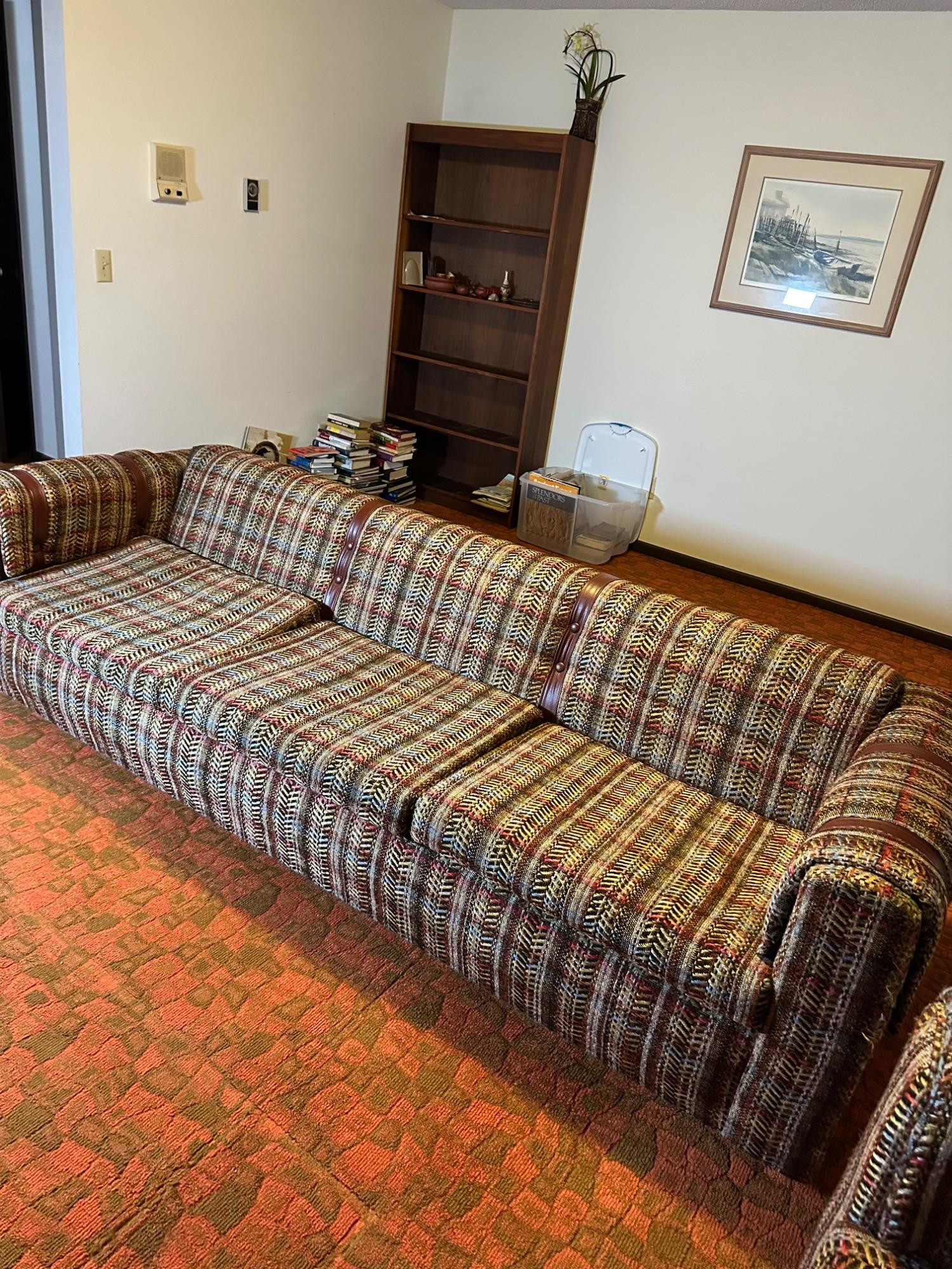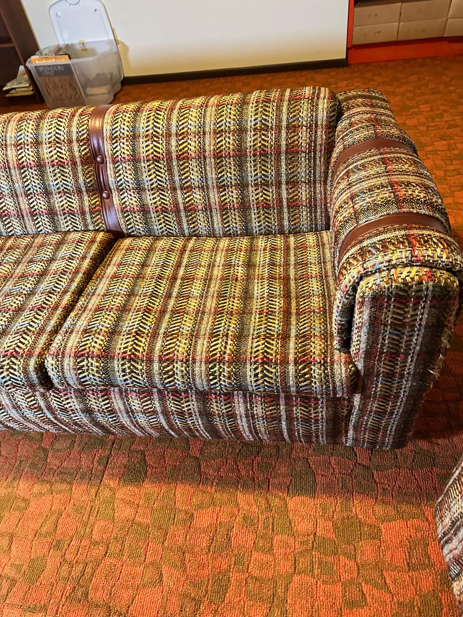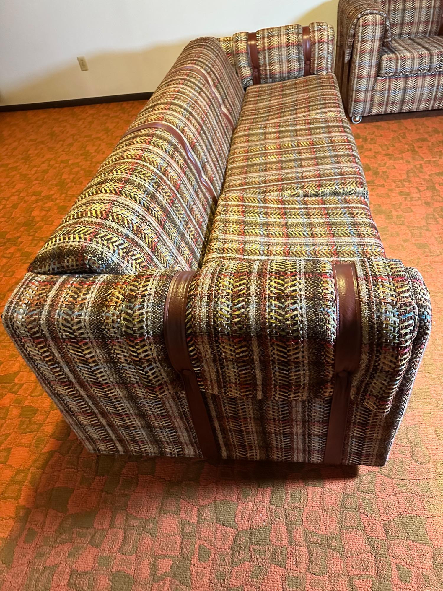 Vintage Style Sofa (91” x 33” D x 27” T) w/ Classic Plaid Upholstery vinyl straps with nailhead trim This vintage style sofa, measuring 91” W x 33” D x 27” T, offers a spacious and comfortable seating option with its timeless plaid upholstery in rich red, green, and brown tones. The sofa’s classic design complements the loveseat in Lot 66, making them a perfect pair for a coordinated living room or lounge area. With its sturdy frame and plush cushions, this sofa offers both style and comfort. Whether you’re furnishing a new space or looking to update your current one, this piece is ideal for creating a cohesive and welcoming environment. Bidding on this lot is an agreement that: (1.) You will have 2 capable, able-bodied persons to lift and load at a minimum. (2.) You will bring a hand truck and/or any other tools needed to remove this item. If these steps are not followed your item will be forfeited and no refund given.
