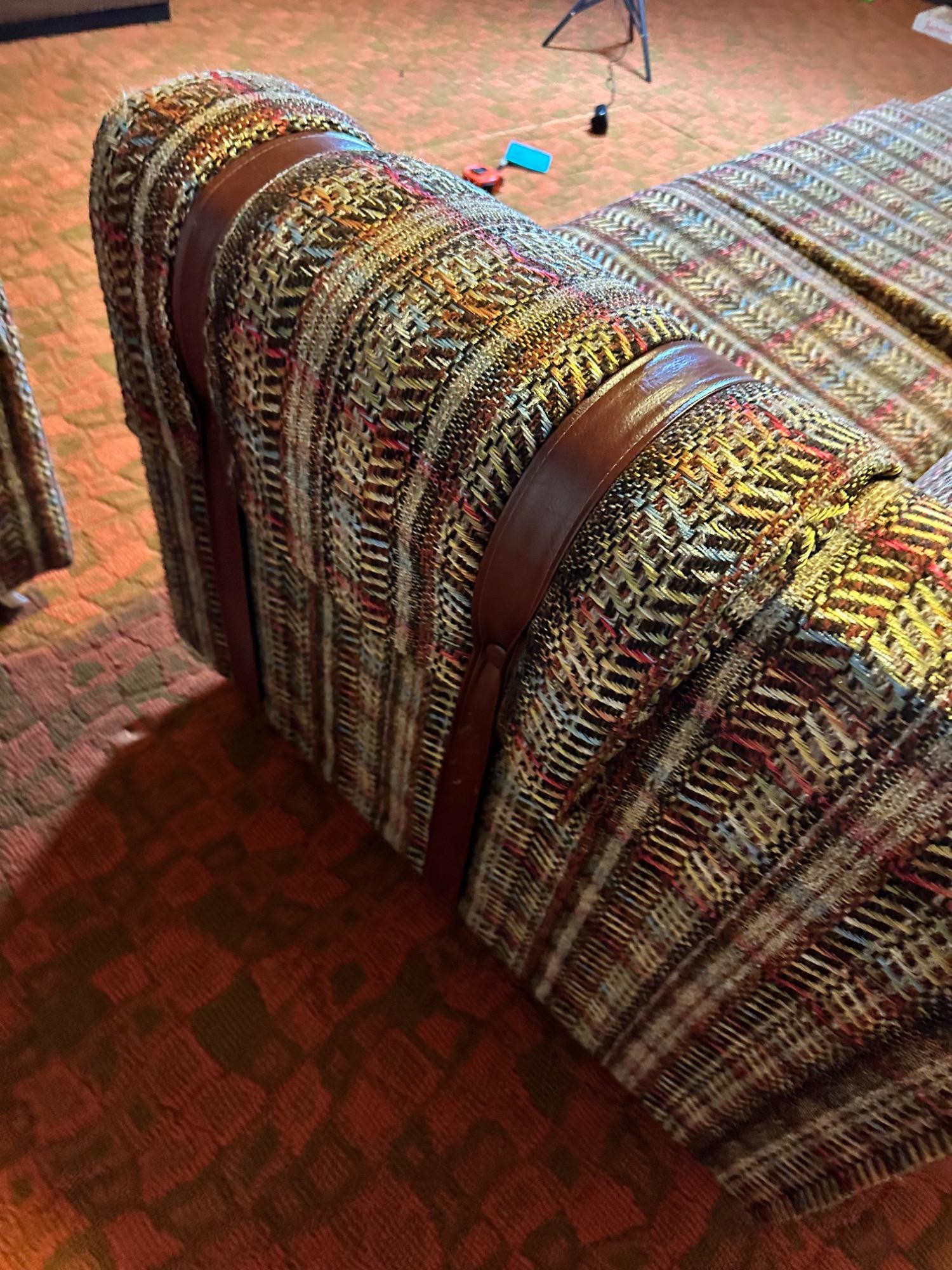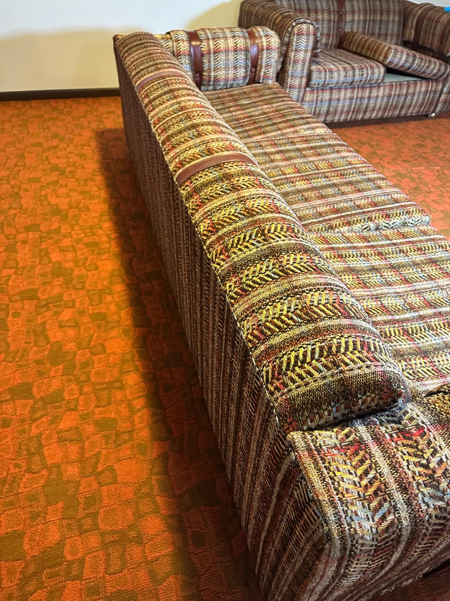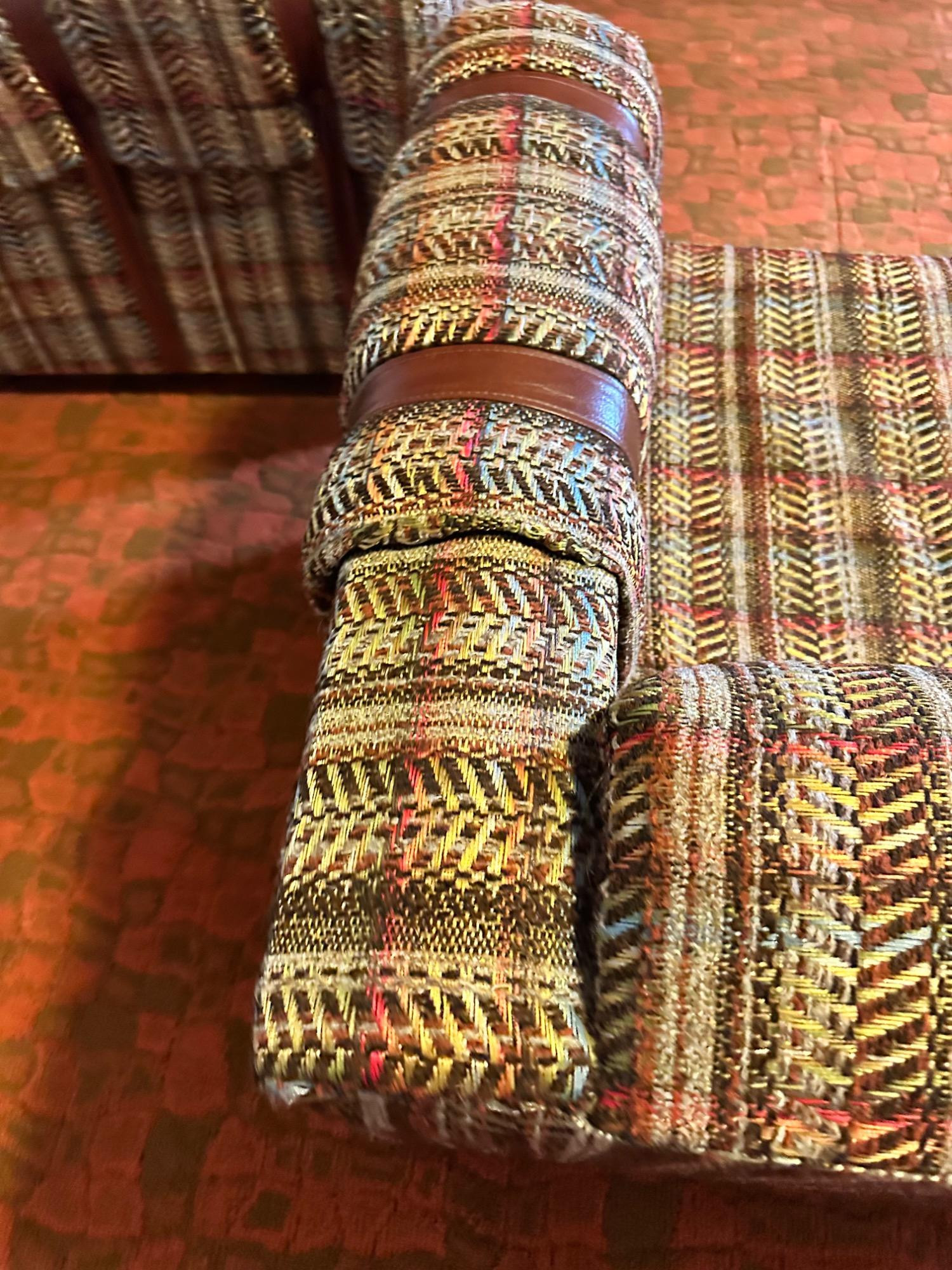 Vintage Style Sofa (91” x 33” D x 27” T) w/ Classic Plaid Upholstery vinyl straps with nailhead trim This vintage style sofa, measuring 91” W x 33” D x 27” T, offers a spacious and comfortable seating option with its timeless plaid upholstery in rich red, green, and brown tones. The sofa’s classic design complements the loveseat in Lot 66, making them a perfect pair for a coordinated living room or lounge area. With its sturdy frame and plush cushions, this sofa offers both style and comfort. Whether you’re furnishing a new space or looking to update your current one, this piece is ideal for creating a cohesive and welcoming environment. Bidding on this lot is an agreement that: (1.) You will have 2 capable, able-bodied persons to lift and load at a minimum. (2.) You will bring a hand truck and/or any other tools needed to remove this item. If these steps are not followed your item will be forfeited and no refund given.