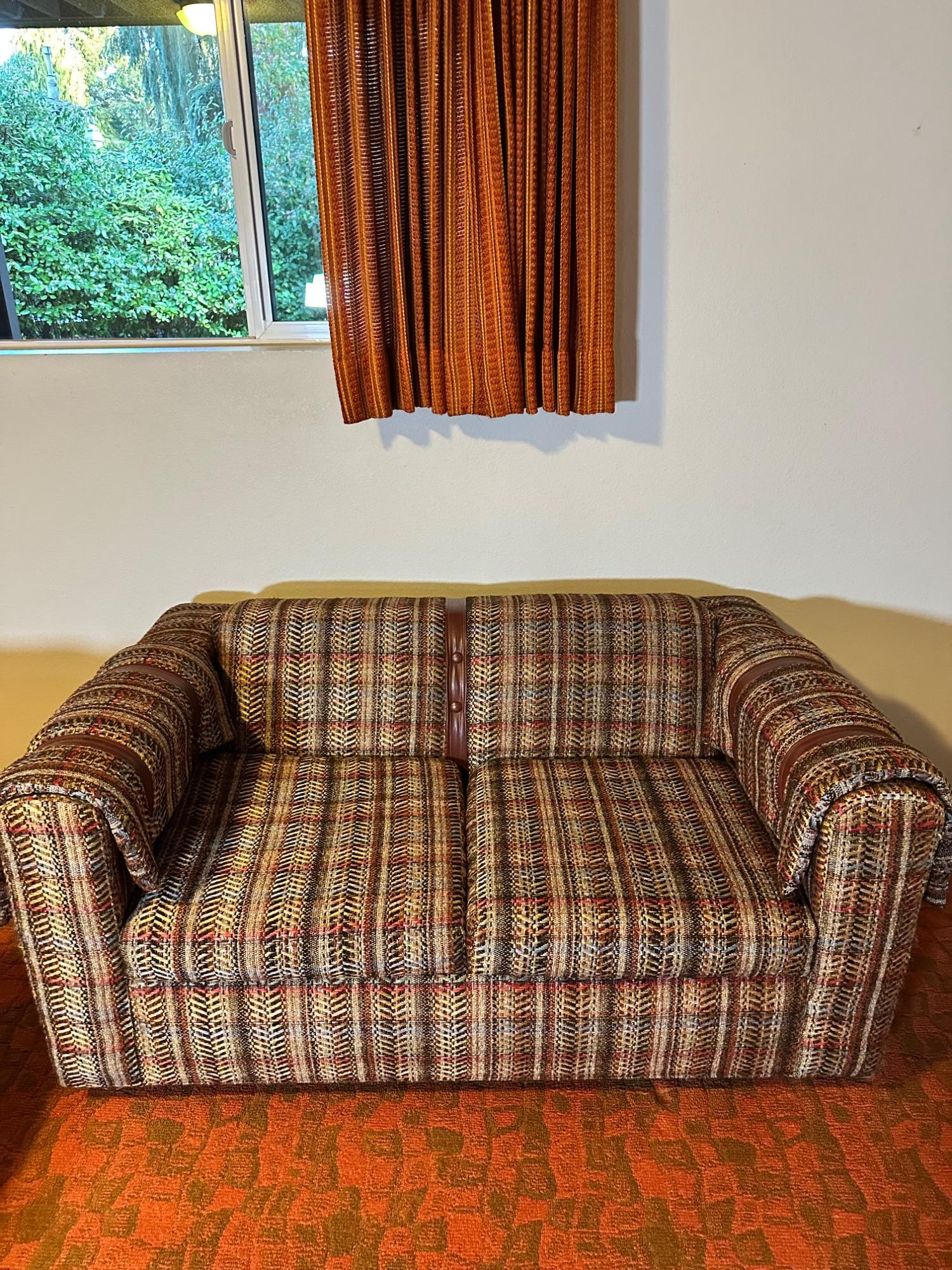 Vintage Loveseat – Matching Sofa in Lot 65, Classic Plaid Upholstery This vintage loveseat, measuring 58” W x 33” D x 27” T, features a classic plaid upholstery in shades of red, green, and brown, providing a stylish and comfortable seating option. Perfect for smaller spaces, this loveseat complements the matching sofa in Lot 65, creating a cohesive look in any room. The loveseat offers sturdy construction and plush cushions for relaxation or entertaining. Its timeless design and durable materials make it a great addition to any vintage or retro-inspired interior. Combine it with the matching sofa for a complete seating arrangement. Very good condition- vinyl straps with nailhead trim. Bidding on this lot is an agreement that: (1.) You will have 2 capable, able-bodied persons to lift and load at a minimum. (2.) You will bring a hand truck and/or any other tools needed to remove this item. If these steps are not followed your item will be forfeited and no refund given.