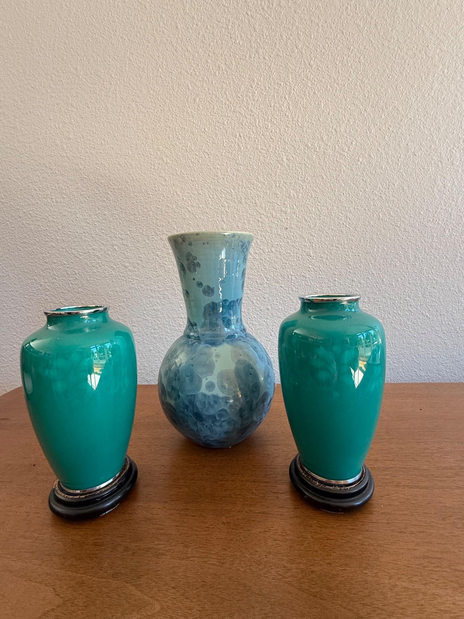 Signed Crystalline Glazed Vase (9.5”) & Pair of Japanese Cloisonné Vases with Wooden Stands (7”) This exquisite lot features three beautiful vases, each with unique characteristics: A signed crystalline glazed vase measuring 9.5”, with a stunning glaze finish that creates a visually captivating effect. The vibrant colors and intricate design make it a standout piece for any collection. A pair of Japanese Cloisonné floral vases, each standing 7” tall, with a green and aqua color scheme. These vases are accompanied by wooden stands for display. Though no maker’s mark is visible, they are believed to potentially be from Ando, known for its fine cloisonné work. Their age is unknown, adding to their mysterious allure. Perfect for collectors of fine Asian art, these vases bring elegance and color to any space.