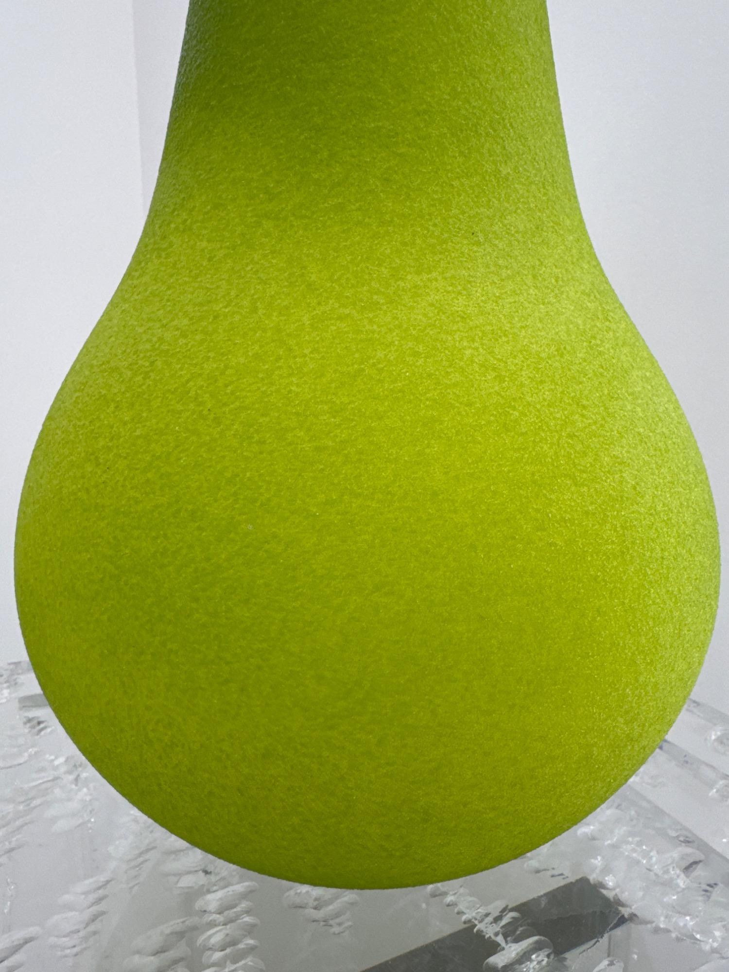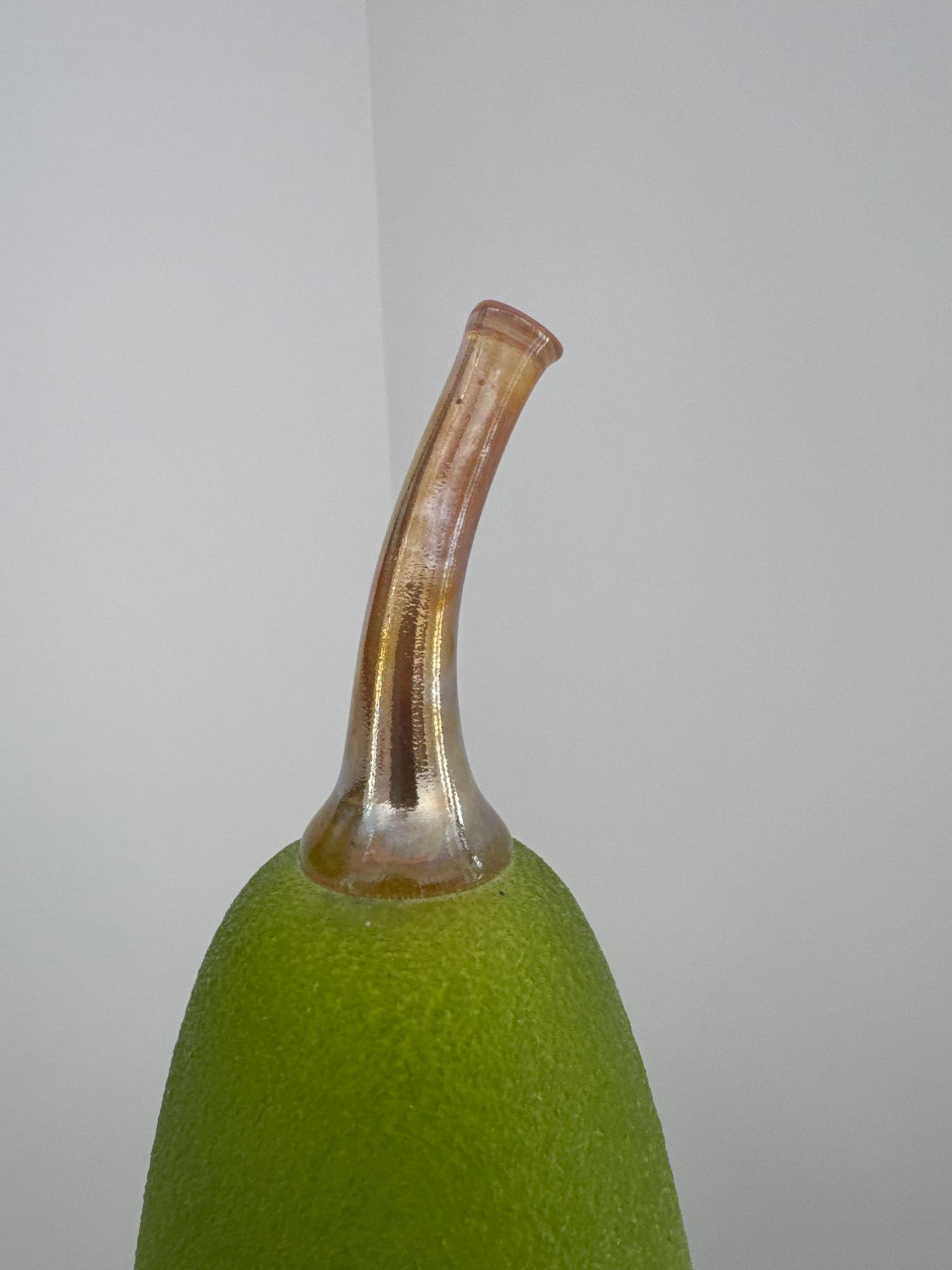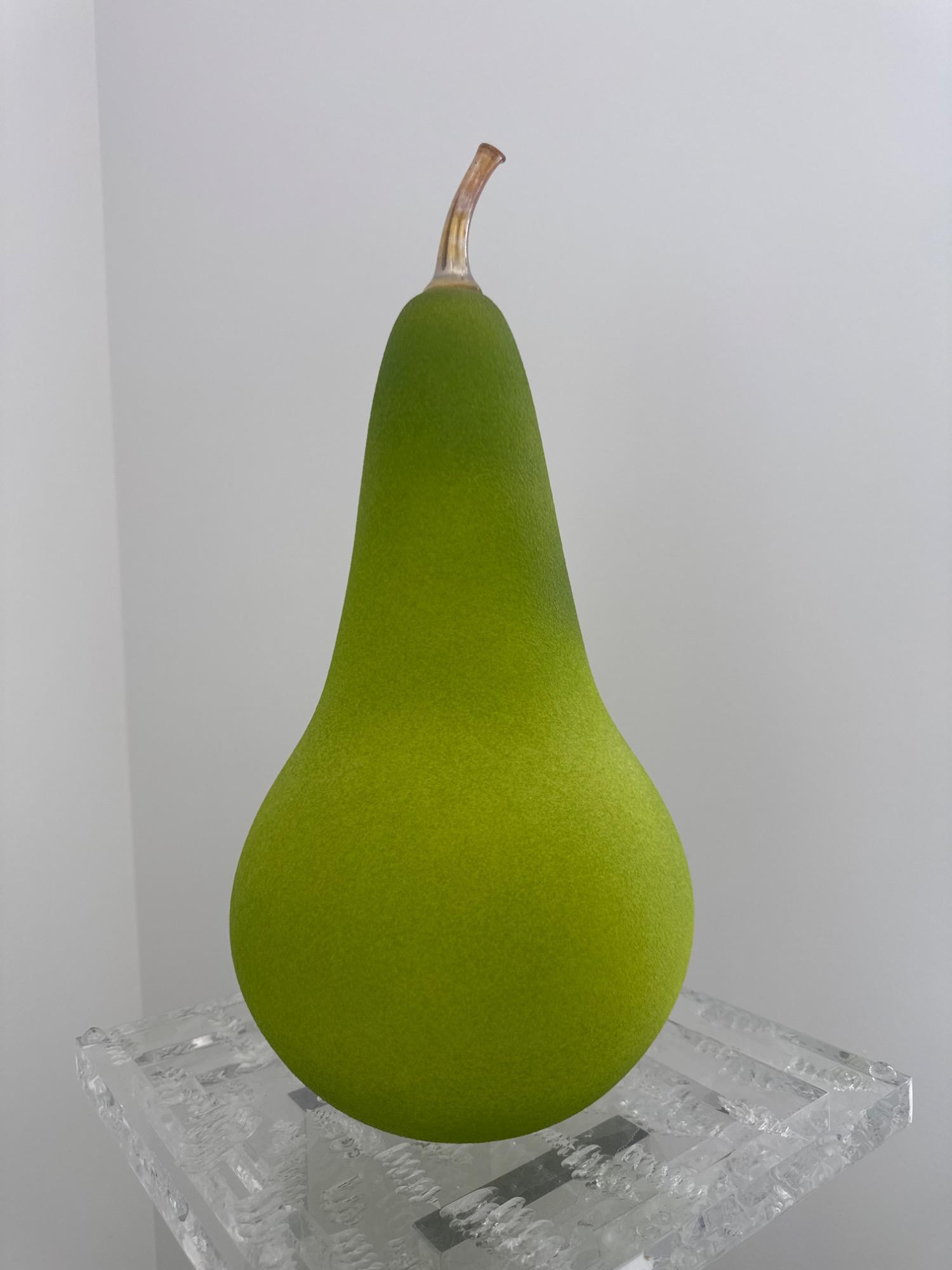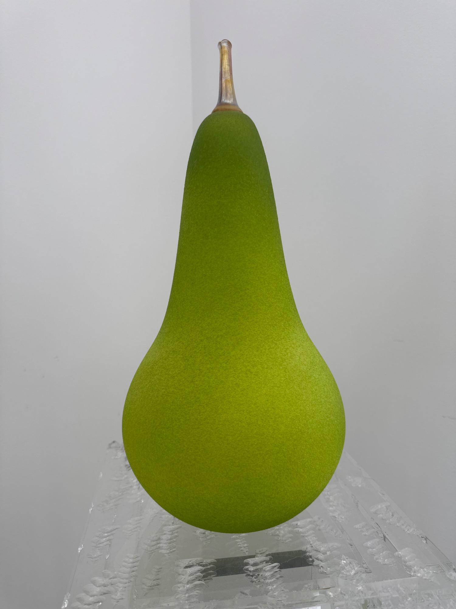 For more than 50 years, glass artist Robert Adamson has pursued a love of hand-blown glass. Robert turned his vision of glass-making into a highly successful studio and training ground for young glass artists in the Pacific Northwest, when he founded the nationally known art glass company, Glass Eye Studio, in 1978. In the late 90s, Adamson finished construction of his own glass facility, Island Art Glass on Whidbey Island (https://islandglassart.com/), where he continues to explore sculptural directions in contemporary art glass, including blown, cast and deeply carved forms. Adamson has exhibited his handblown and carved glass all across the United States and is represented in numerous private and public collections, including the renowned Corning Museum in Corning, New York. For auction is a hand blown bright green Pear with a bronze colored stem. Signed Robert Adamson in script. Gorgeous piece of Art Glass. Sandblasted finish. Stem end is glossy. Size: 17 inches high by by 9 inches wide. Stand is 42" H x 12" W Condition: Overall Excellent - no nicks or chips(see photos). Retail - $750.00 Dimensions are approximate.