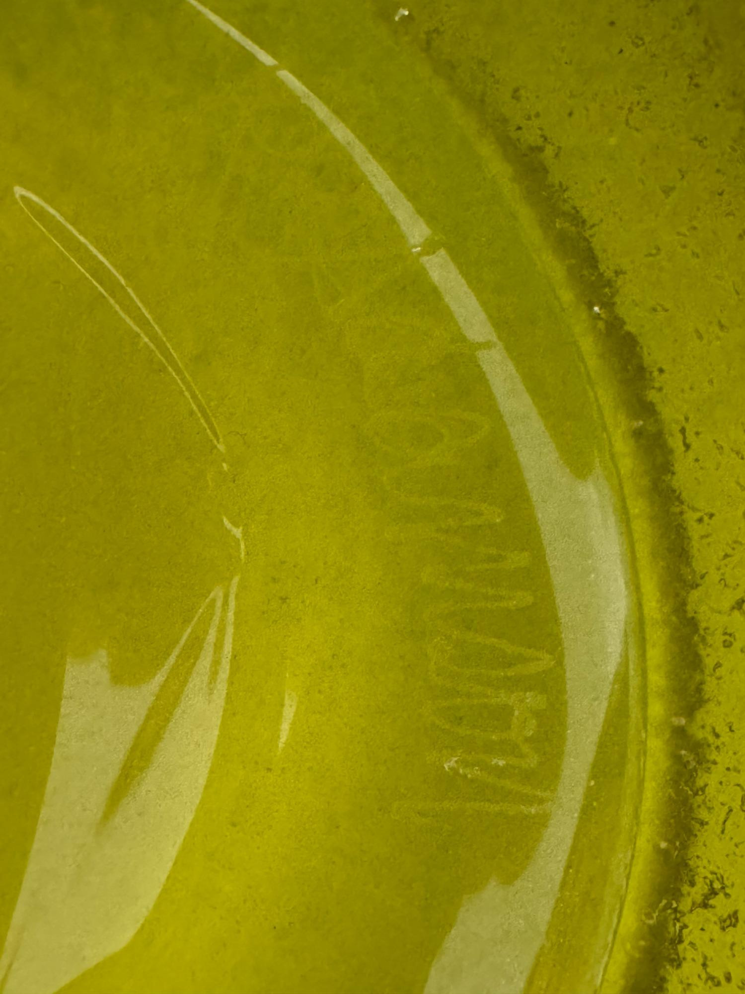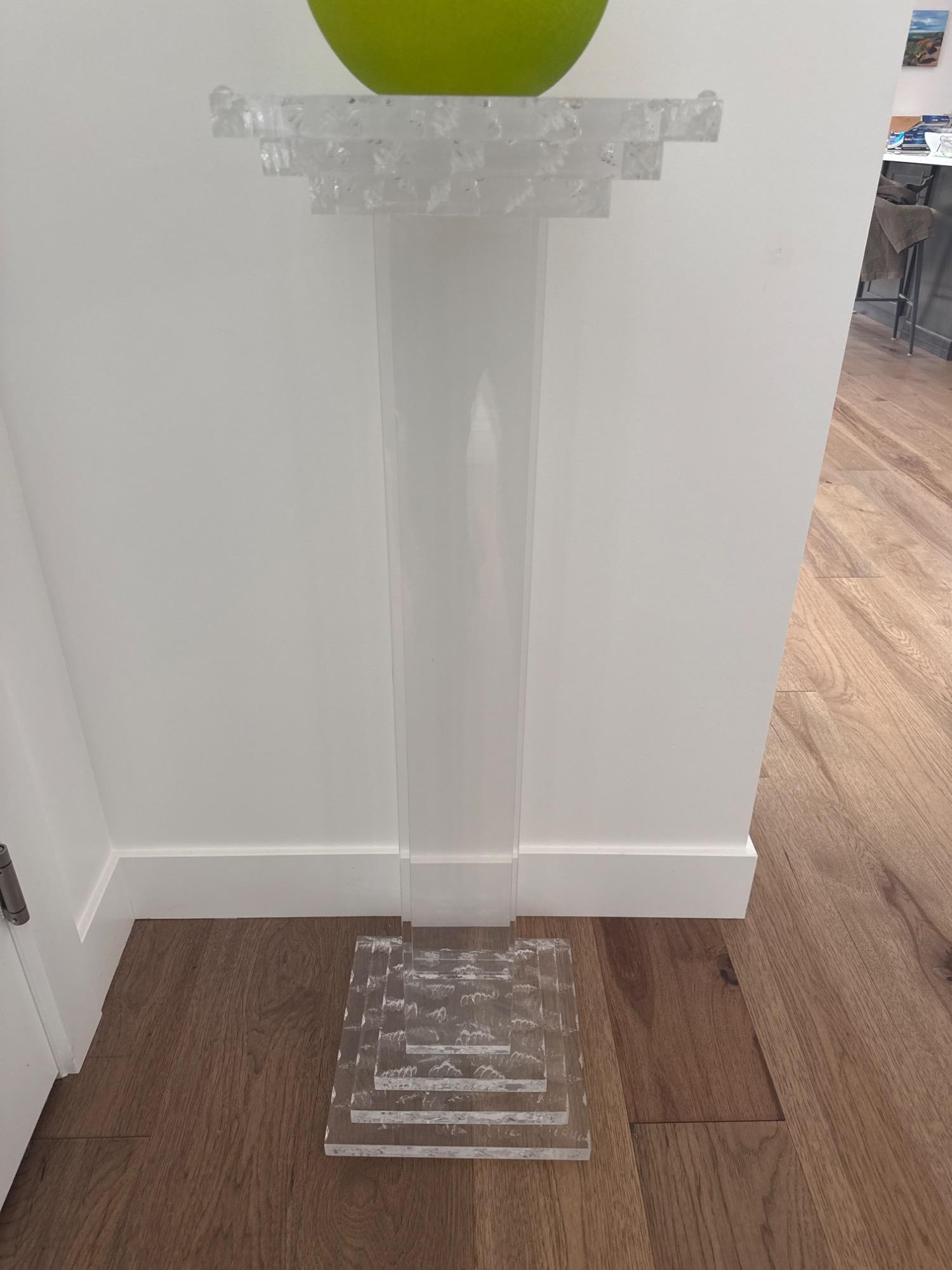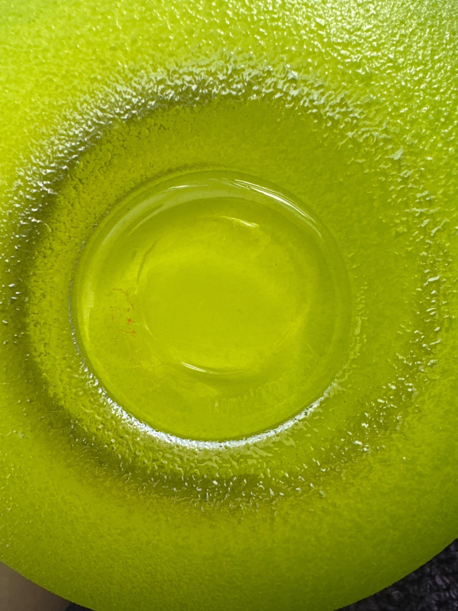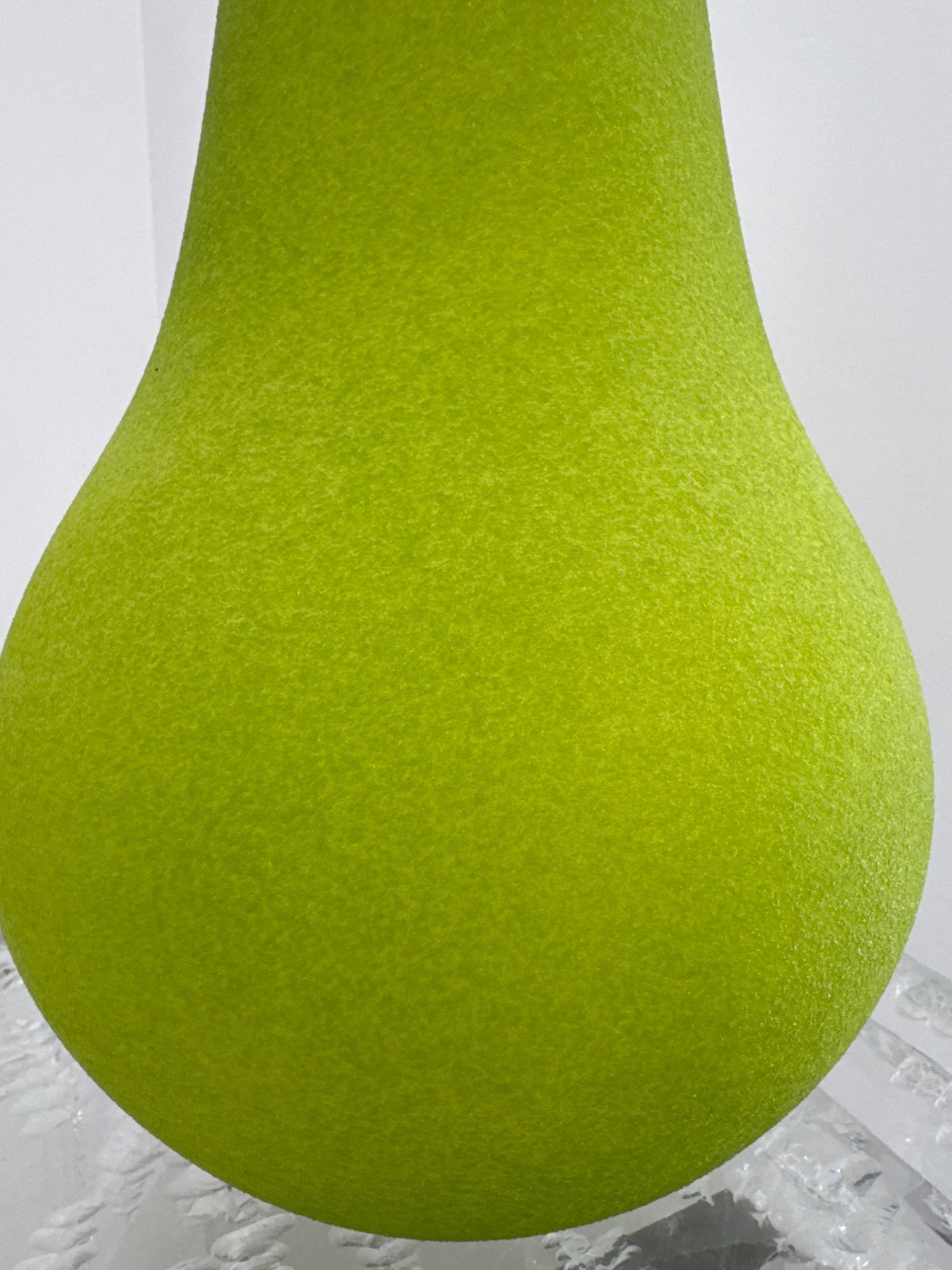 For more than 50 years, glass artist Robert Adamson has pursued a love of hand-blown glass. Robert turned his vision of glass-making into a highly successful studio and training ground for young glass artists in the Pacific Northwest, when he founded the nationally known art glass company, Glass Eye Studio, in 1978. In the late 90s, Adamson finished construction of his own glass facility, Island Art Glass on Whidbey Island (https://islandglassart.com/), where he continues to explore sculptural directions in contemporary art glass, including blown, cast and deeply carved forms. Adamson has exhibited his handblown and carved glass all across the United States and is represented in numerous private and public collections, including the renowned Corning Museum in Corning, New York. For auction is a hand blown bright green Pear with a bronze colored stem. Signed Robert Adamson in script. Gorgeous piece of Art Glass. Sandblasted finish. Stem end is glossy. Size: 17 inches high by by 9 inches wide. Stand is 42" H x 12" W Condition: Overall Excellent - no nicks or chips(see photos). Retail - $750.00 Dimensions are approximate.