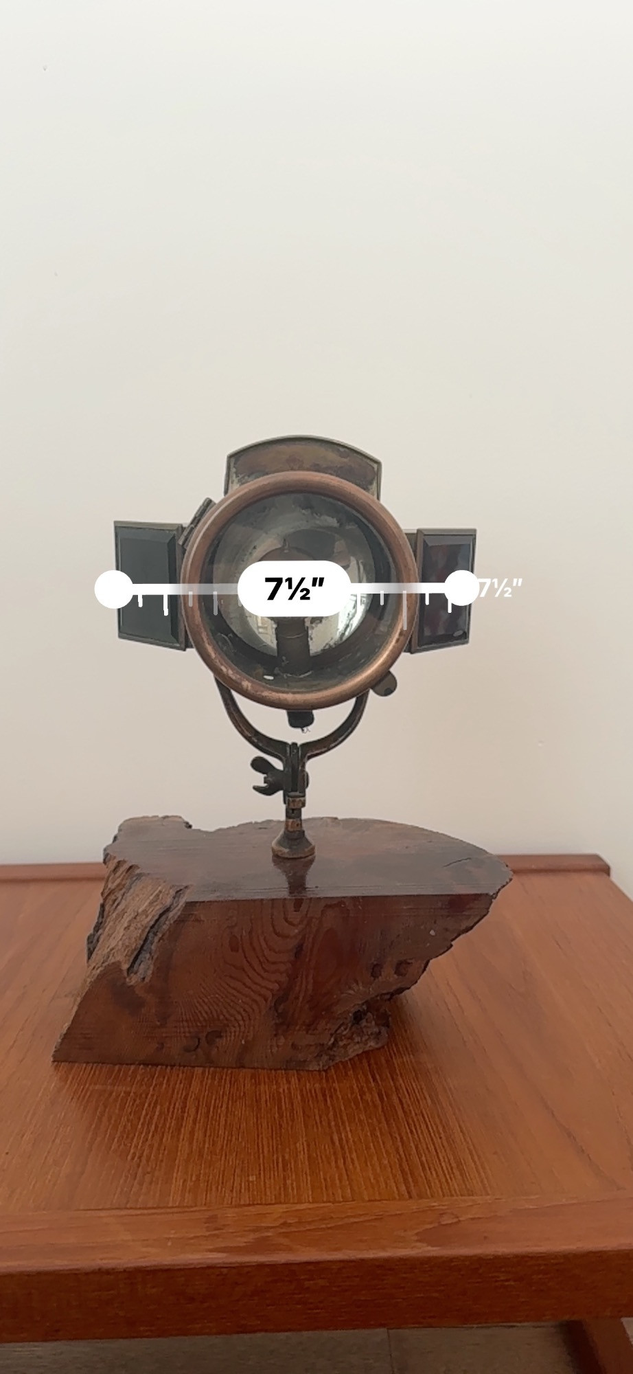 "Baby Grands" Acetylene Searchlights combining Port, Head, and Starboard lights. Copper and Brass construction with 3 1/2 inch diameter lens, red and green square side lenses, with adjustable stirrup mount. Retail $850.00 Dimensions are approximate. Condition - In great condition. No visible chips or breaks. There is a dent on the backside as seen in picture. See pictures of condition issues found.