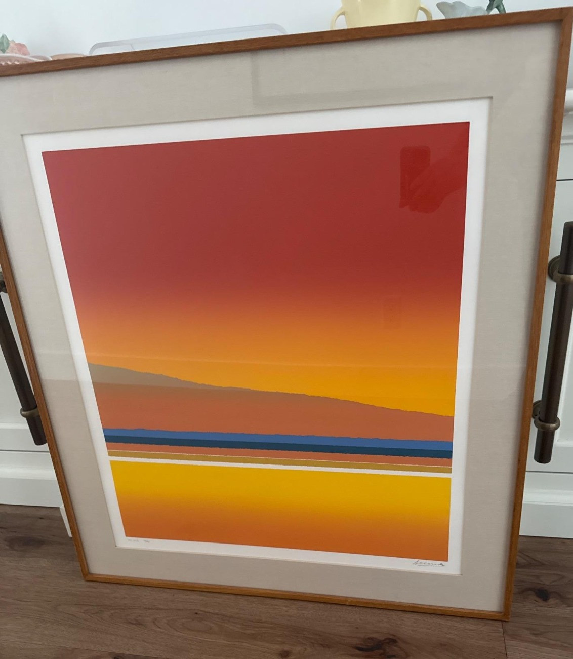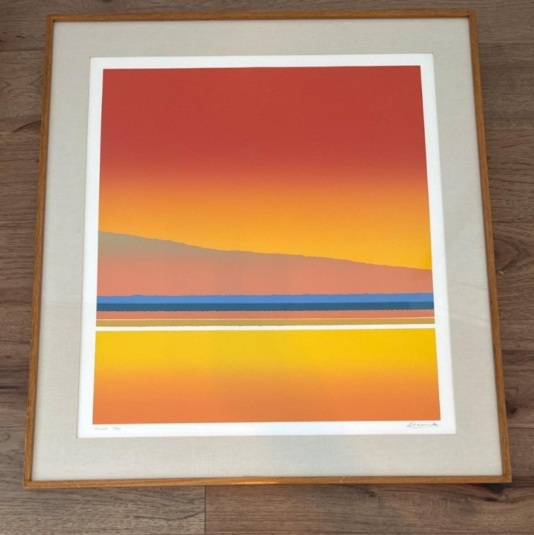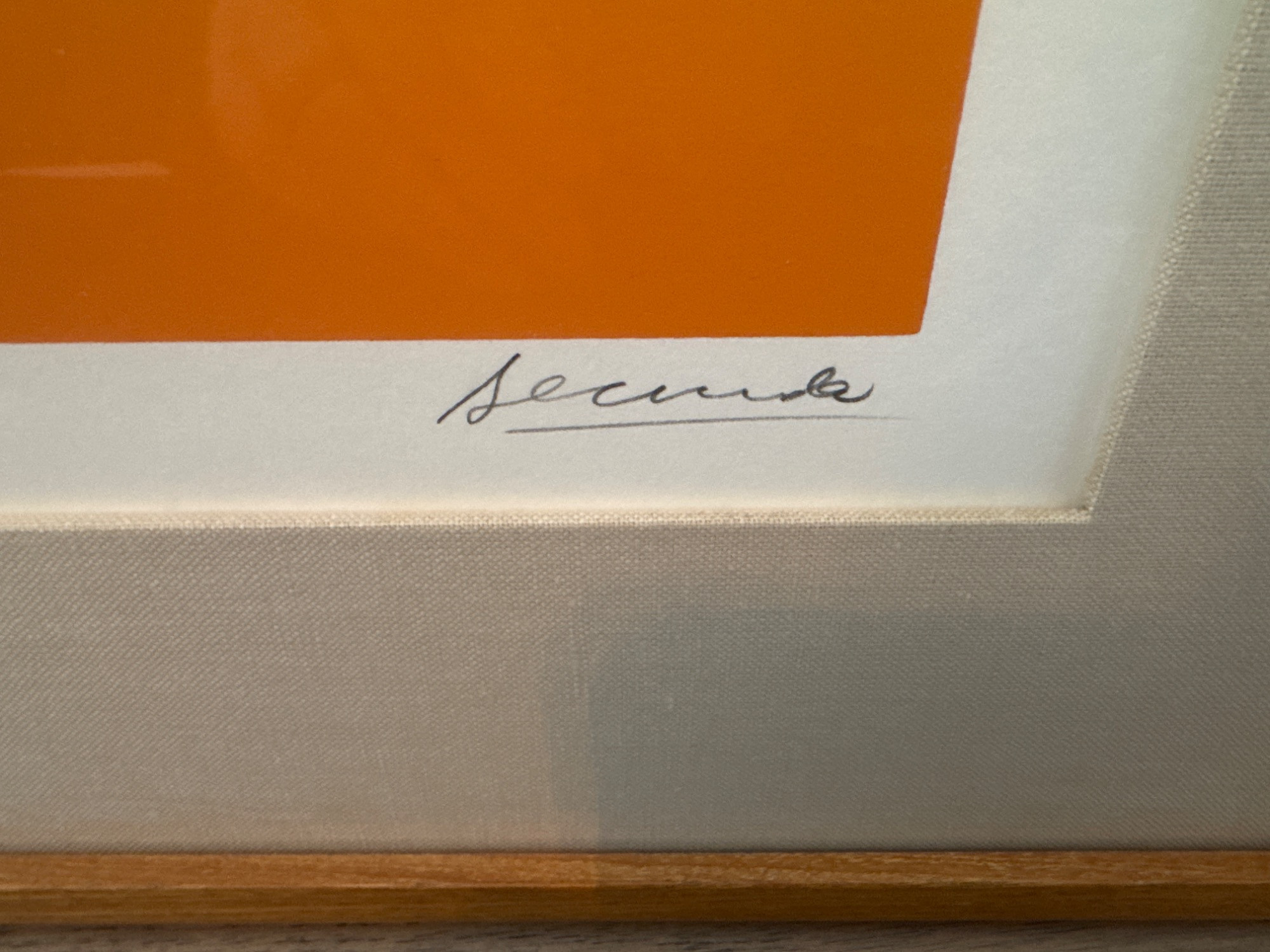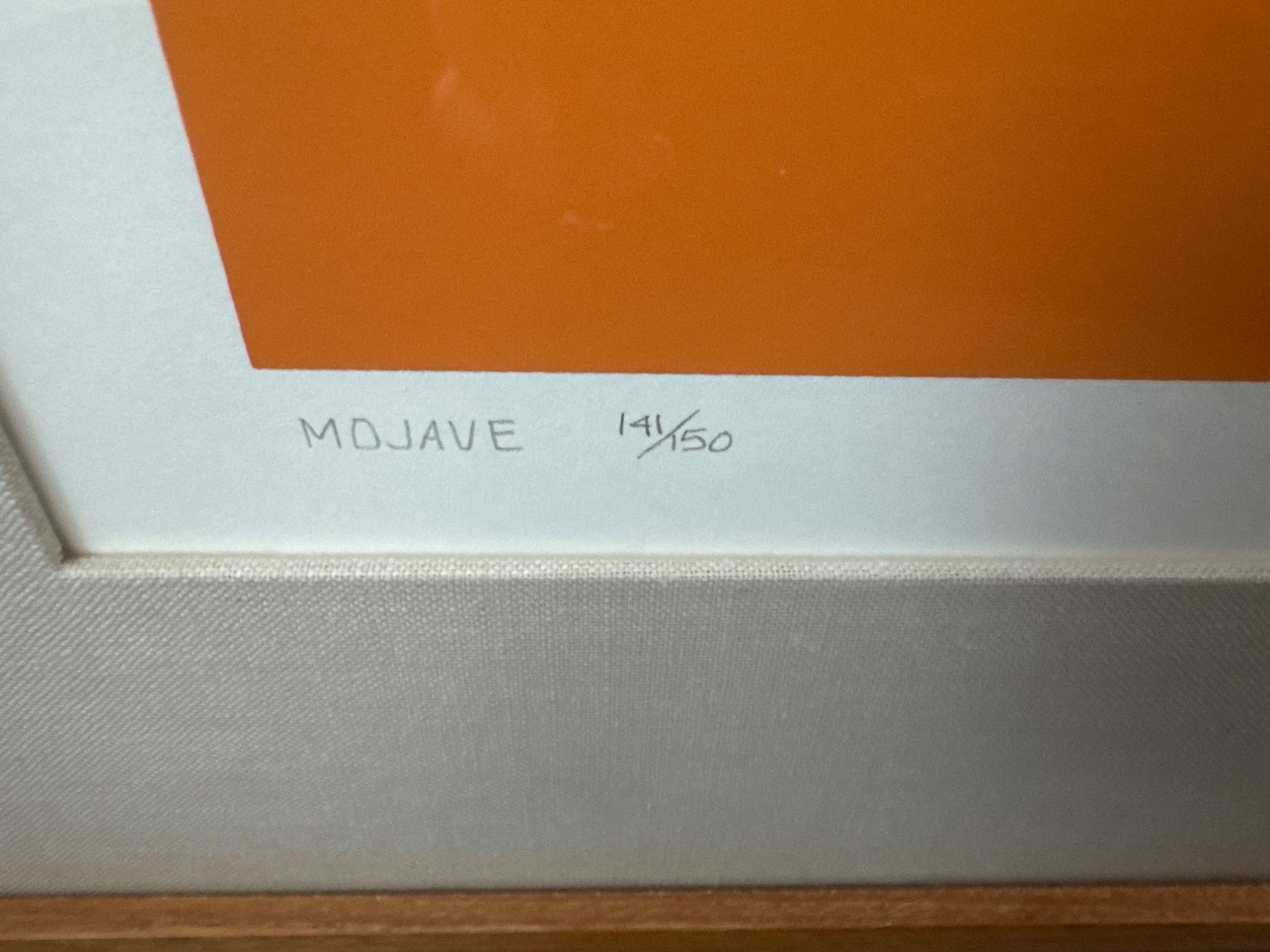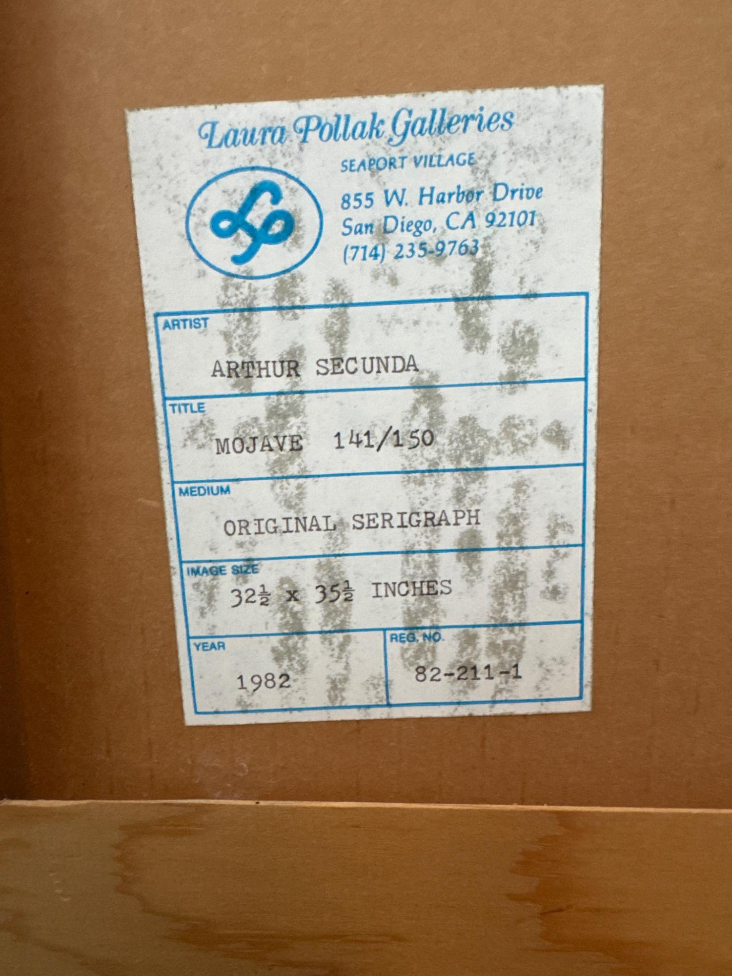 Arthur Secunda (Born Nov 12, 1927 Died August 30, 2022) is an internationally renowned artist whose career has spanned eight decades. His one man shows have been seen worldwide in numerous galleries and museums in France, Sweden, Belgium, Holland, Spain, Israel, and Japan. In the United States, he is represented in most major museums of the country, including the National Gallery of Art and the Smithsonian Museum in Washington D.C., the Museum of Modern Art in New York, the UCLA Museum, the Detroit Art Institute, and the Phoenix Museum. Known for his brilliant collages and striking graphics, Secunda has mastered all types of printmaking, even making his own paper in France and Japan. https://www.arthursecunda.com/print-mojave-arthur-secunda.htm Retails - $2000 Dimensions are approximate.