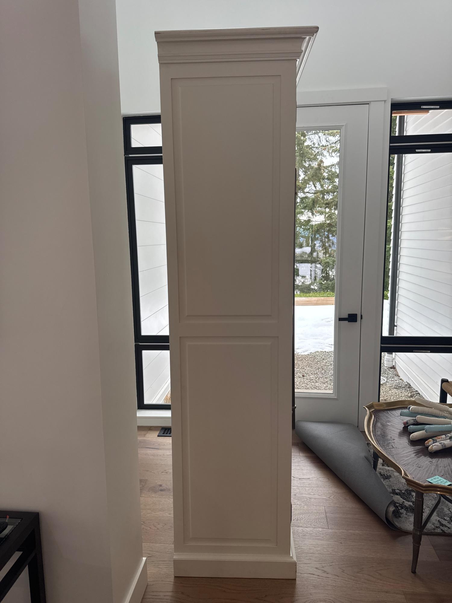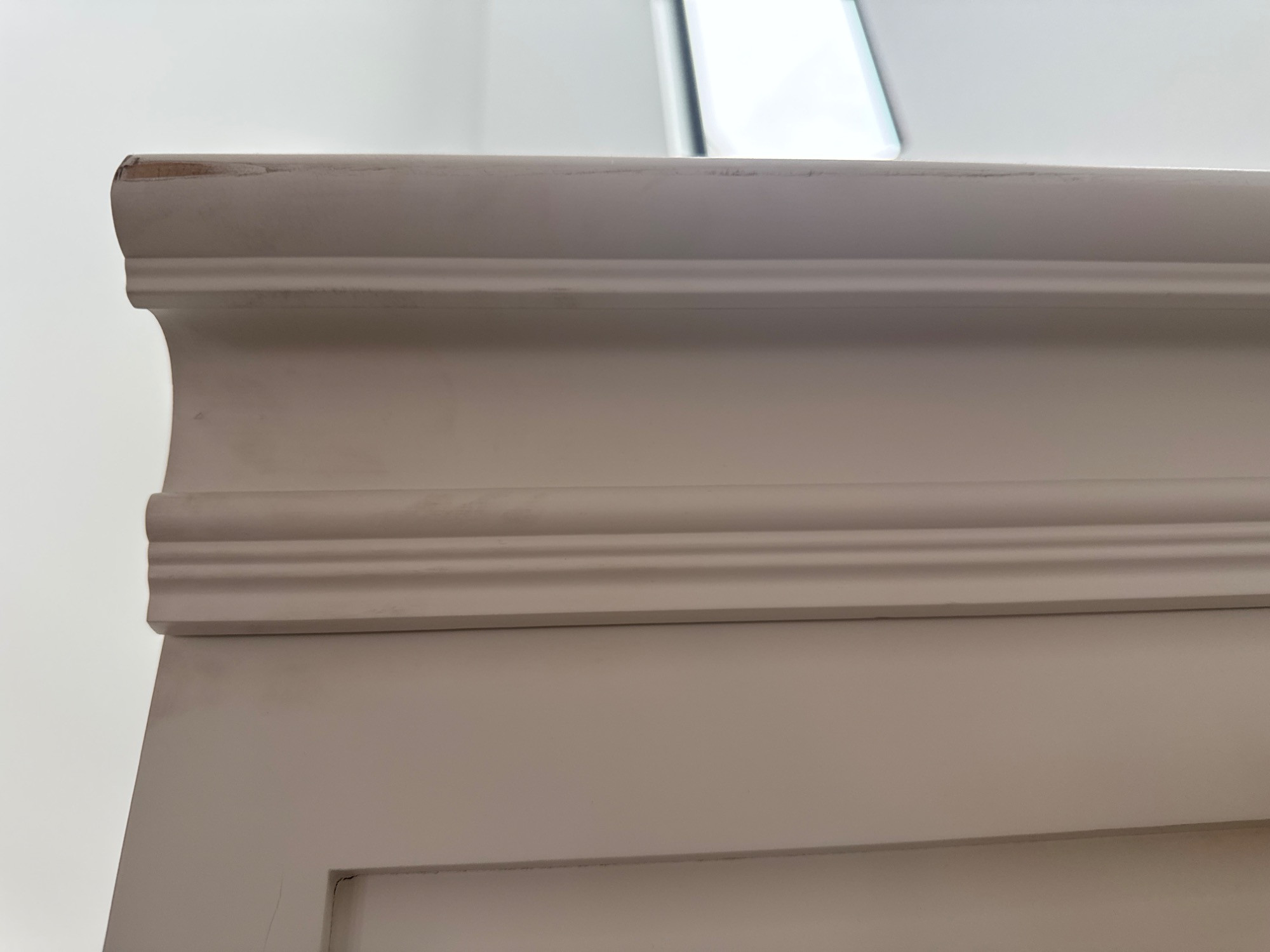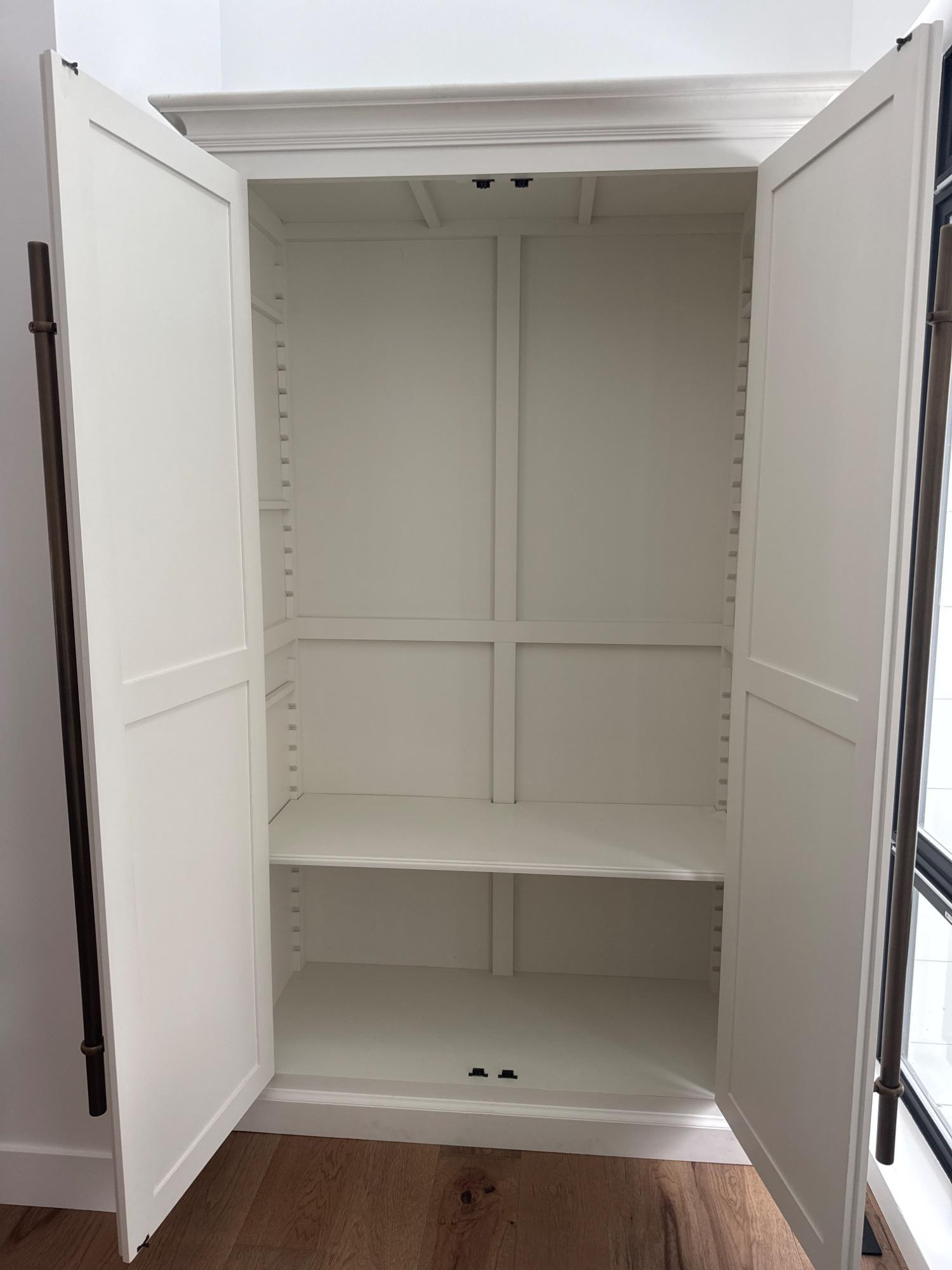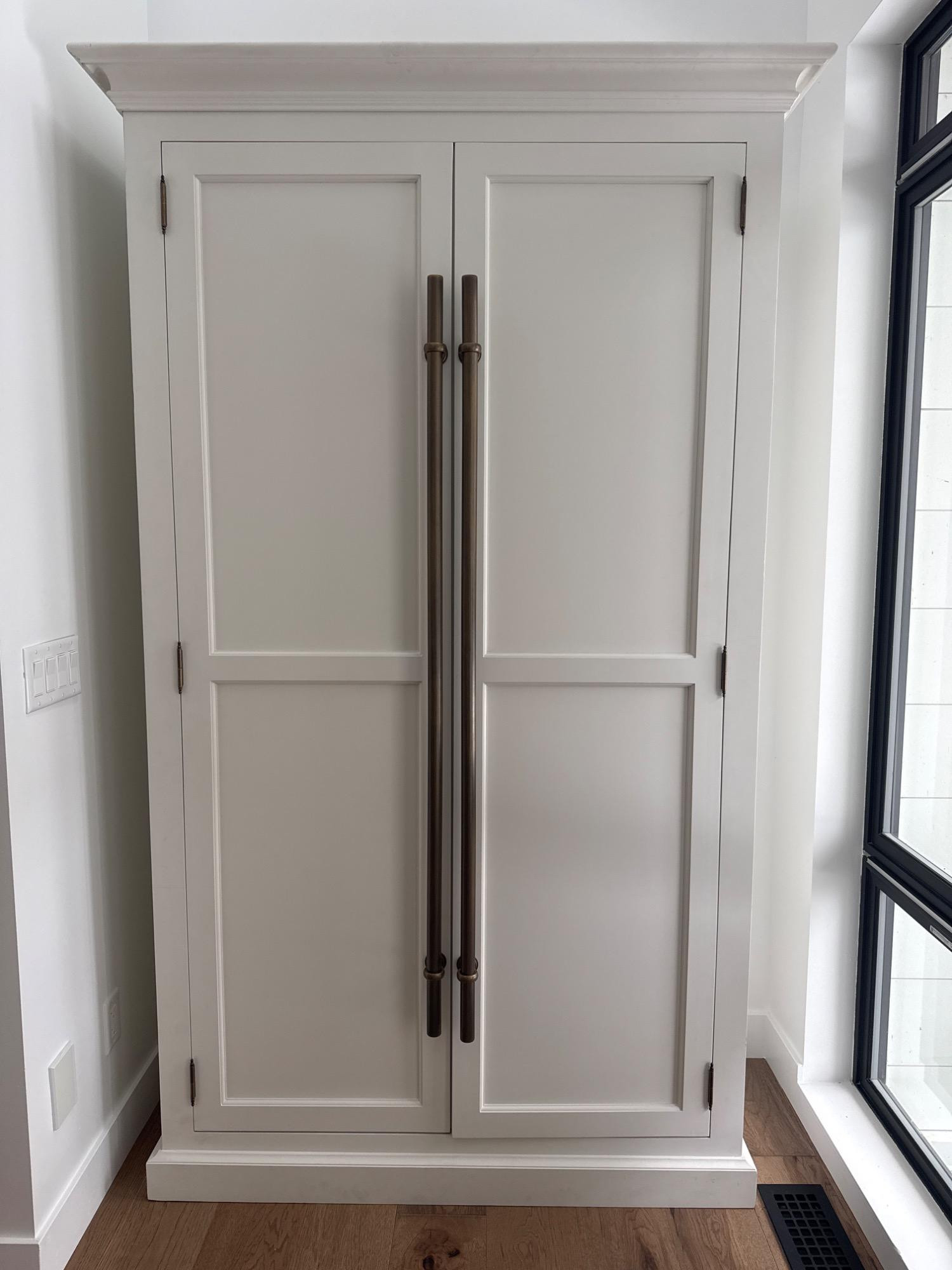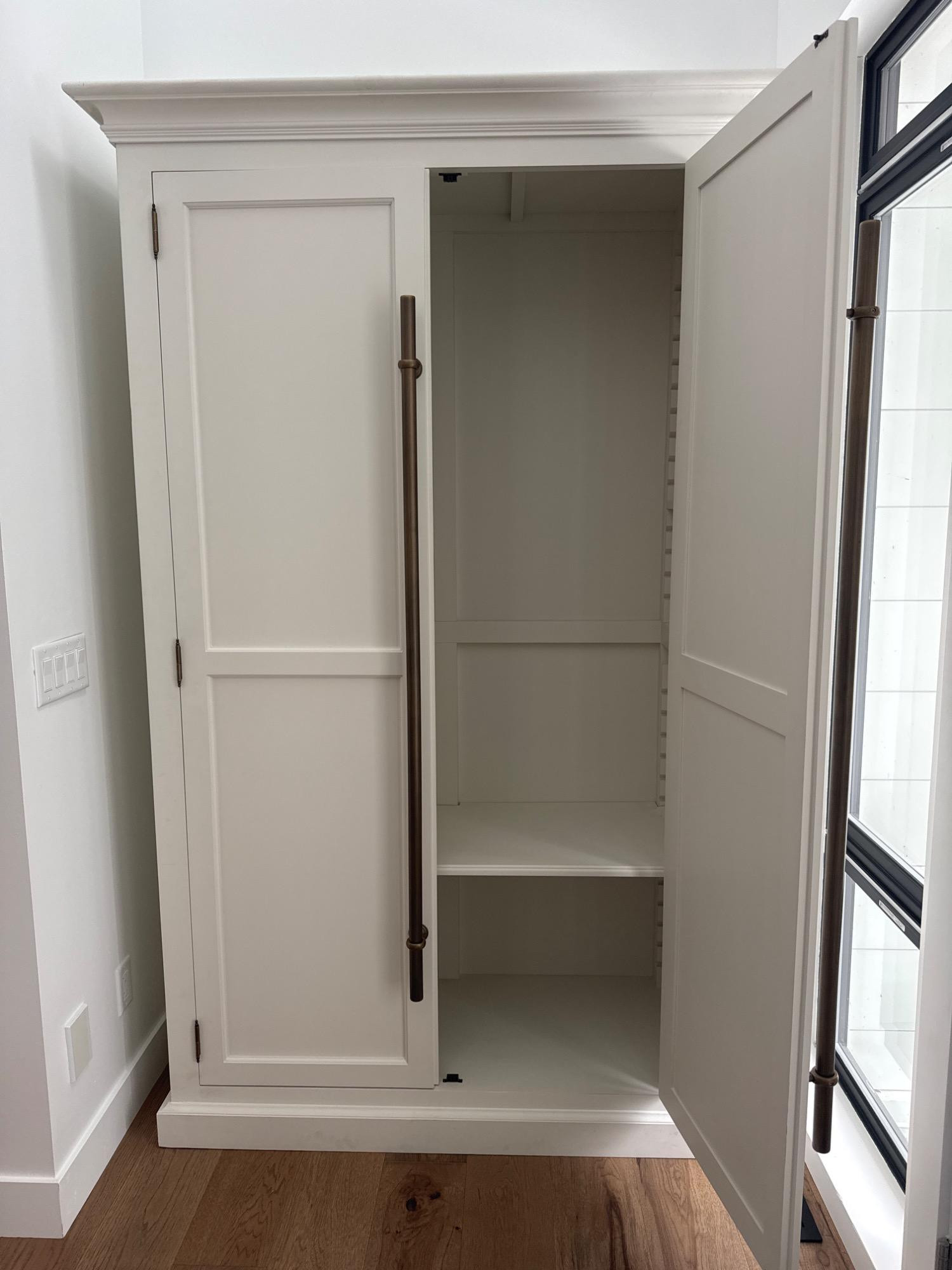 Discontinued French Panel Double Door Restoration Hardware - Armoire - Used as a Jacket Closet by the front door. Restoration Hardware White Cabinet Armoire - 91"x52"x21" Minor wear marks as seen in the photos. Retail (Discontinued) - $2500 Dimensions are approximate. Due to the size of the piece professional movers needed to remove item.