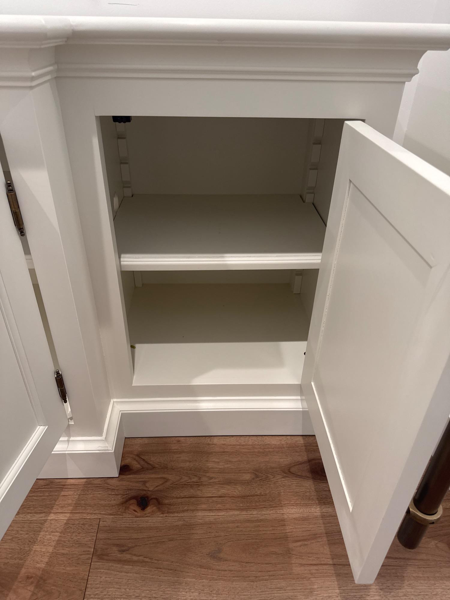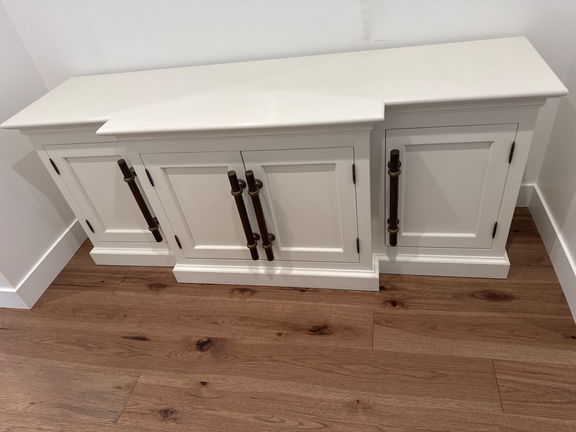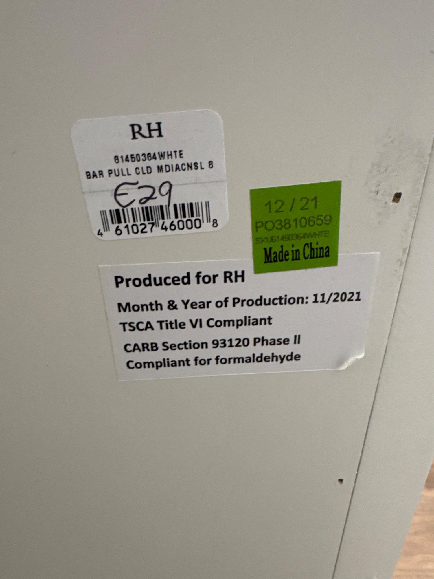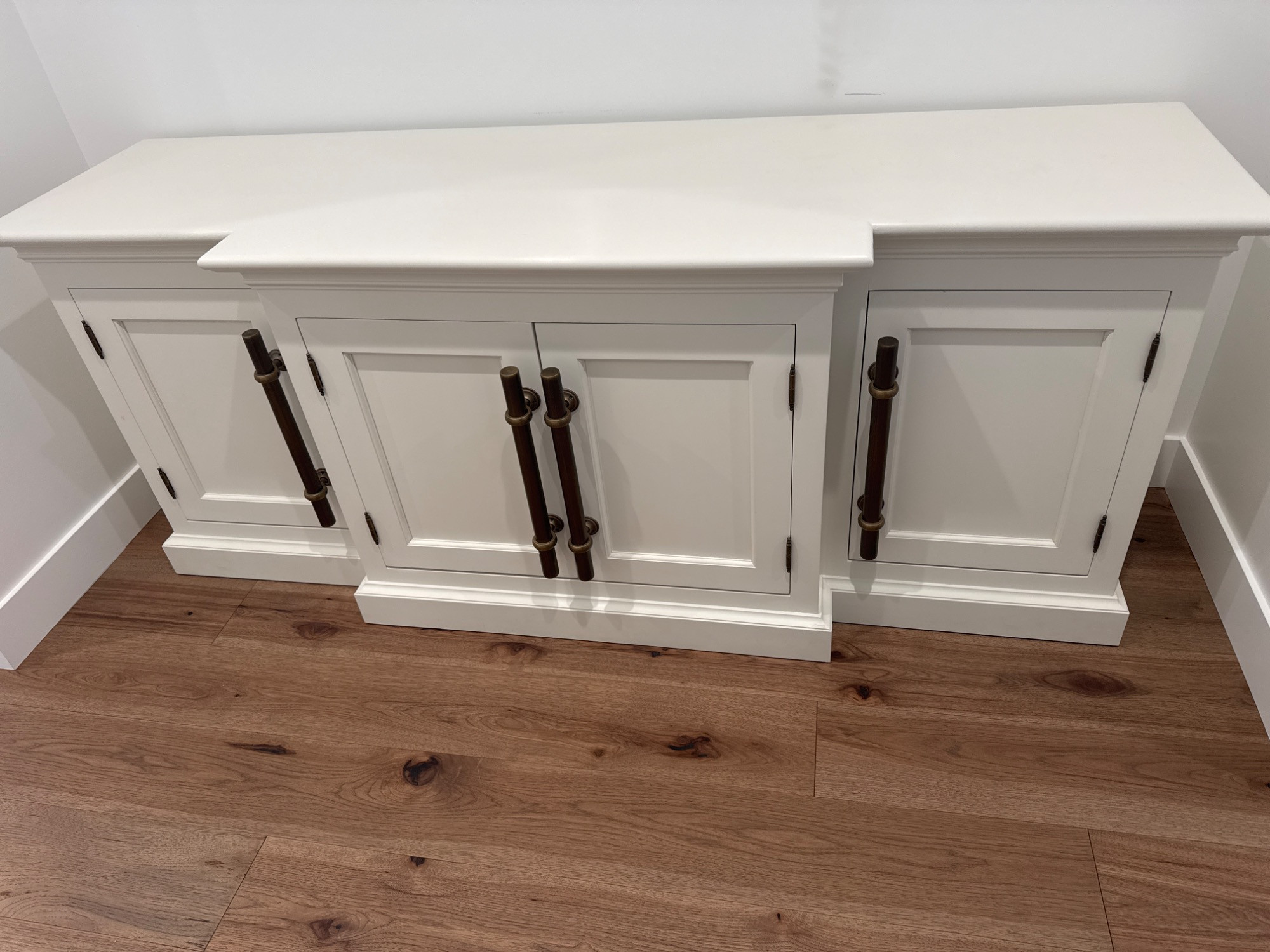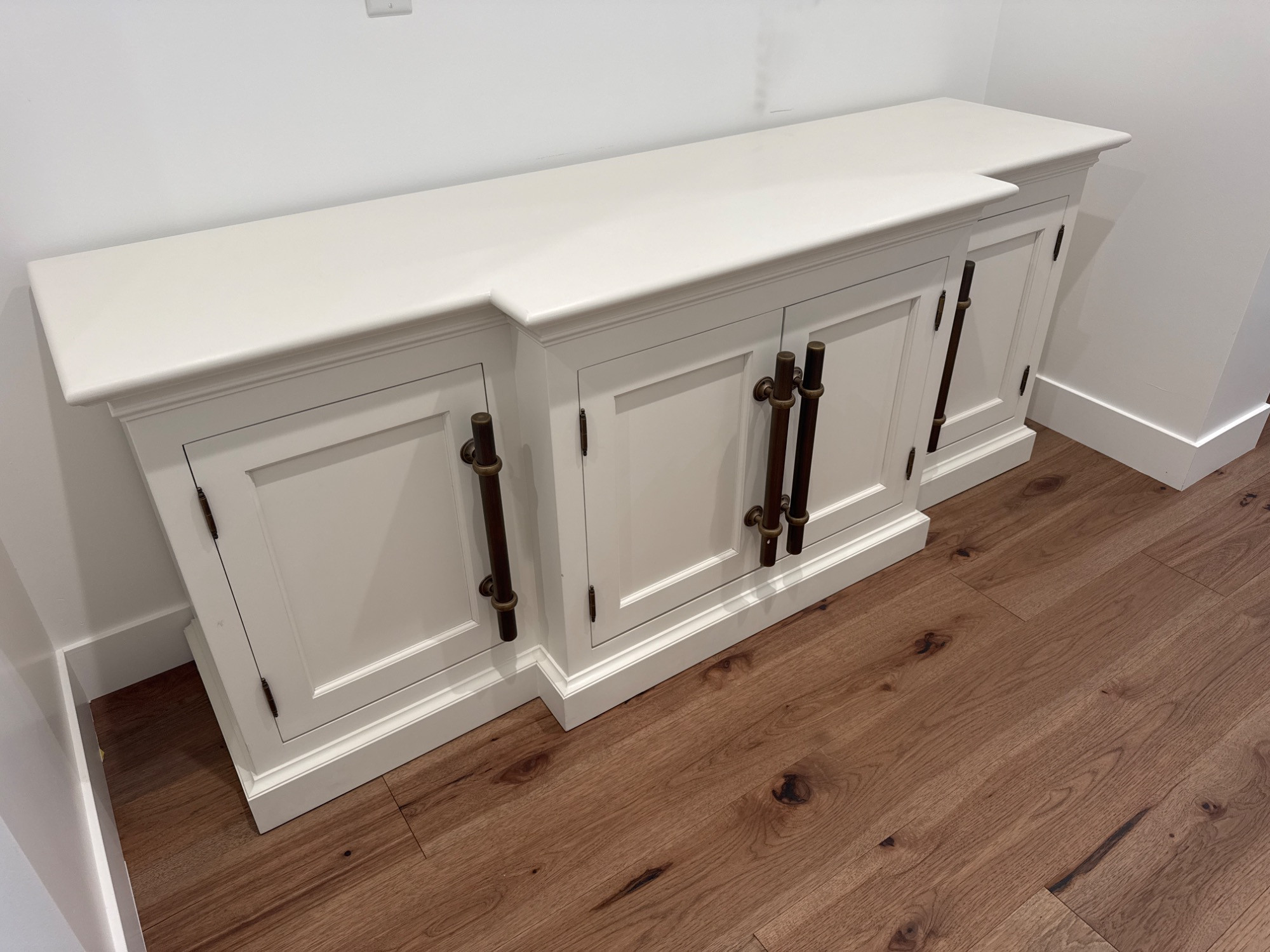 Evoking the character of turn-of-the-century English cabinets used by shopkeepers to display and store their wares, Dutch artisan Theo Eichholtz designed with a brass bar handle, elegantly molded cornice and plinth-style base. Width: 80 inches, Height: 32 inches, Depth: 24 inches Retail (Discontinued) - $2500 Dimensions are approximate. Due to the size of the piece professional movers needed to remove item.