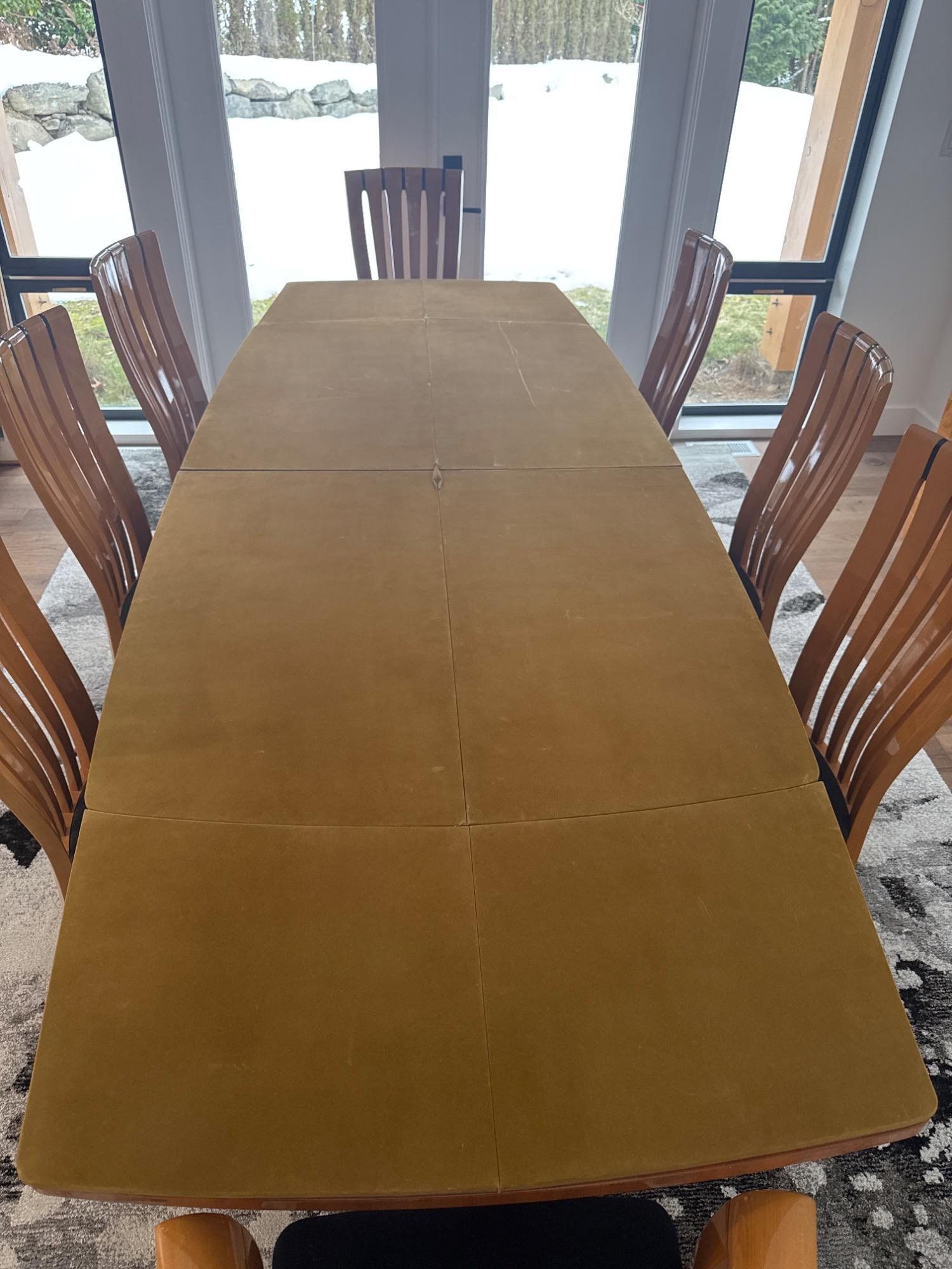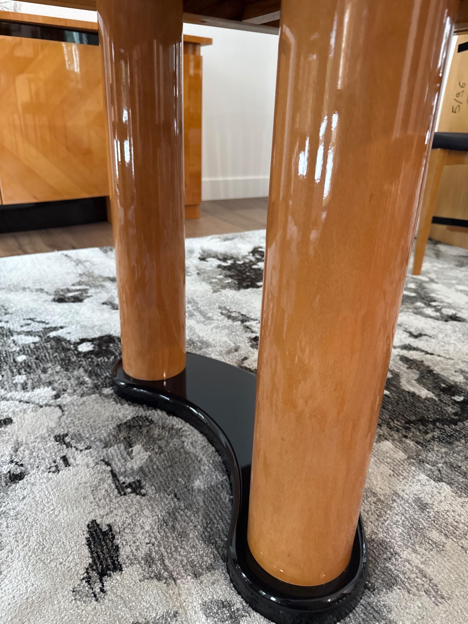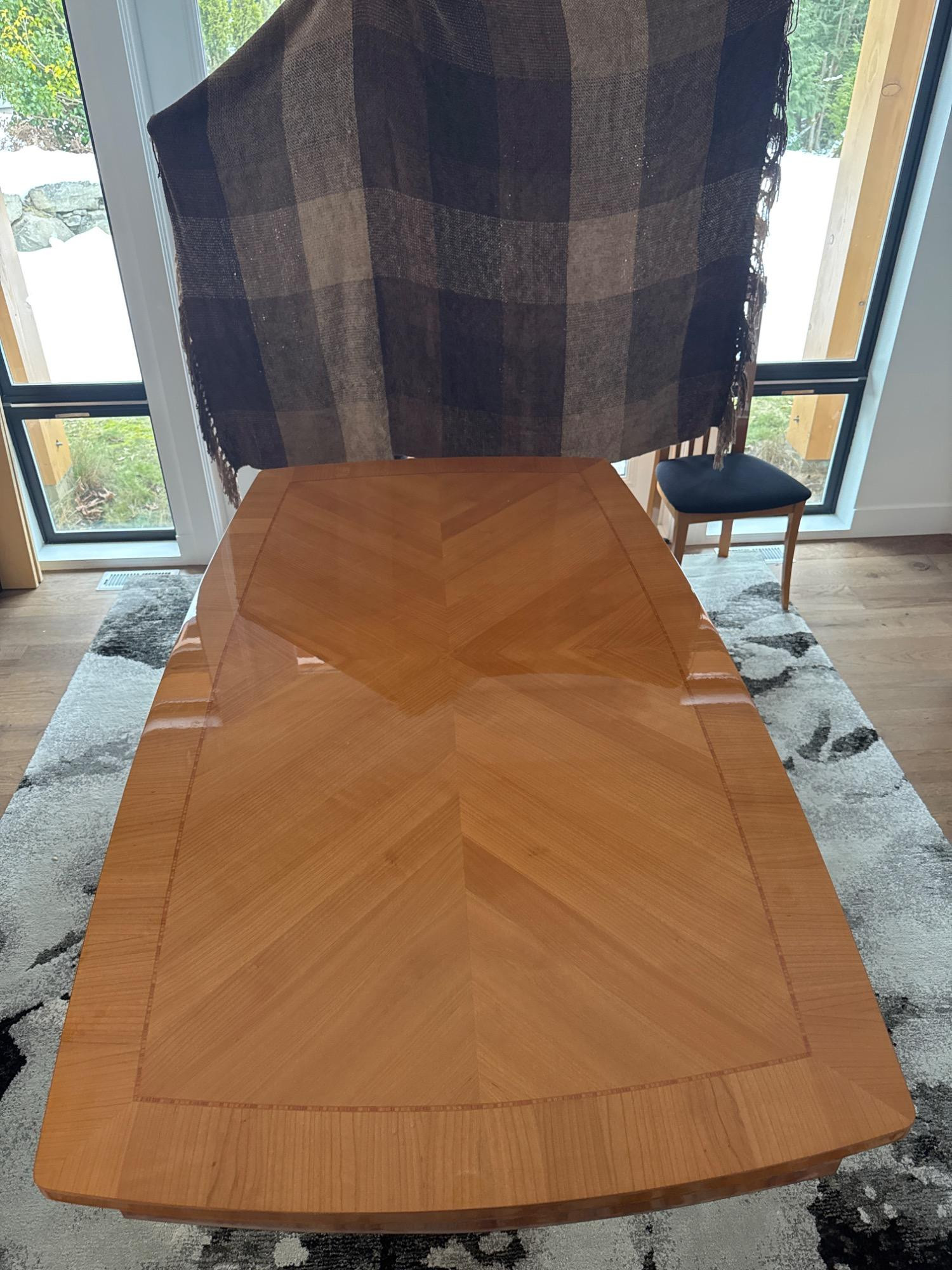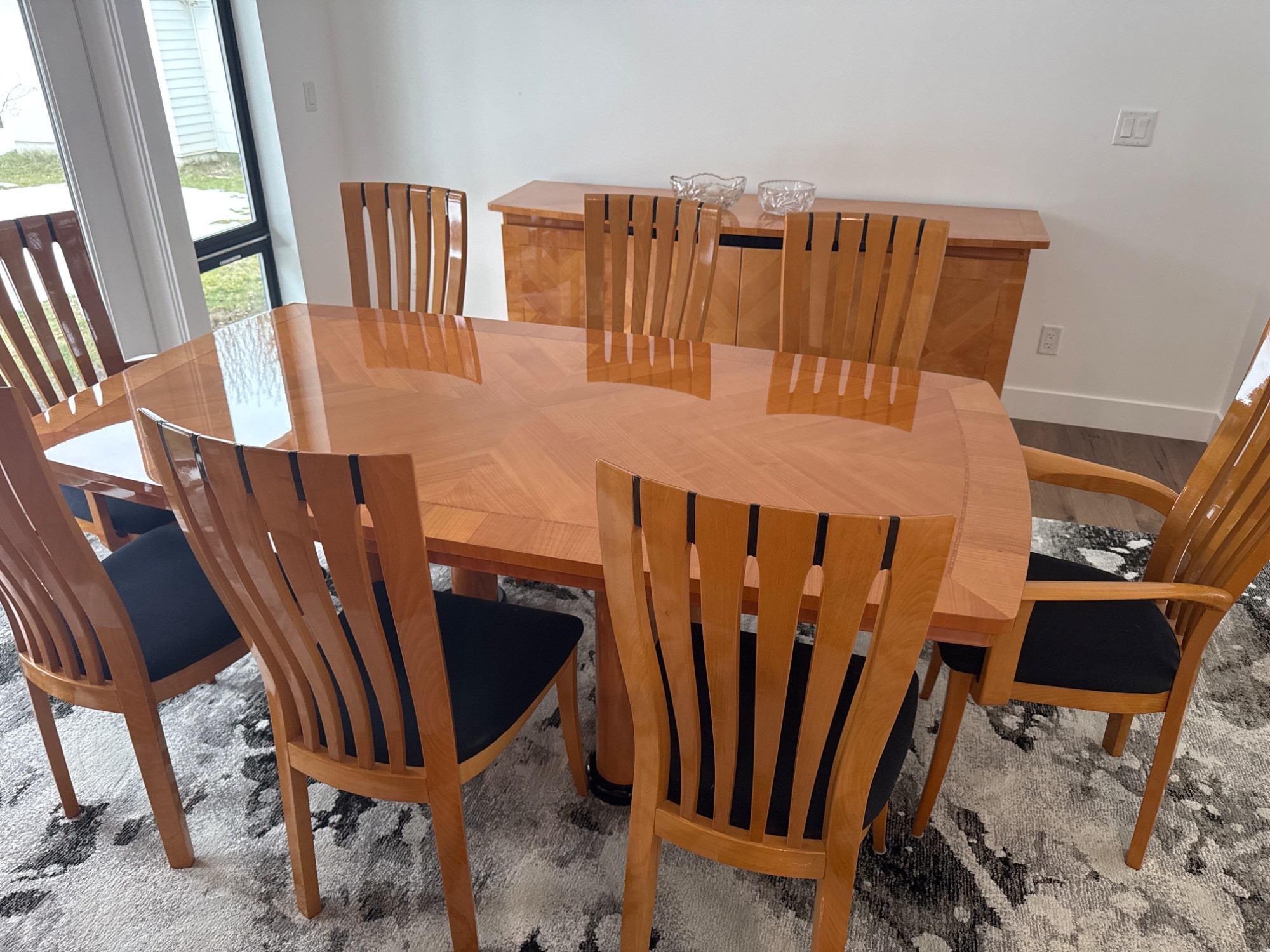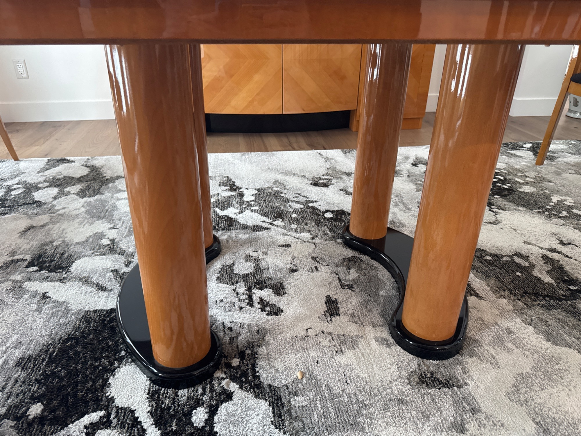 An Italian Modern dining table with 6 regular chairs and 2 Captains chairs set by Excelsior Designs. The rectangular wooden table has a reverse diamond matched top with high gloss finish and inlaid border. It has two extension leaves that fit to either end on draw supports. The table stands on thick, cylindrical legs, which are joined on either end by a curved black base. The six chairs have curved slat backs that taper from top to bottom, black upholstered seats, and tapered legs. The Captains chairs have nice sloping arms. Some damage on a corner as shown in the photos. 6 regular chairs. 2 Captains chairs. Table when the two leaf extensions are inserted makes the table 111" in length. The extensions are 17" each. Auction also includes 3 pads to protect table when not in use. NOTE: Lots 9 & 11 are matching pieces.