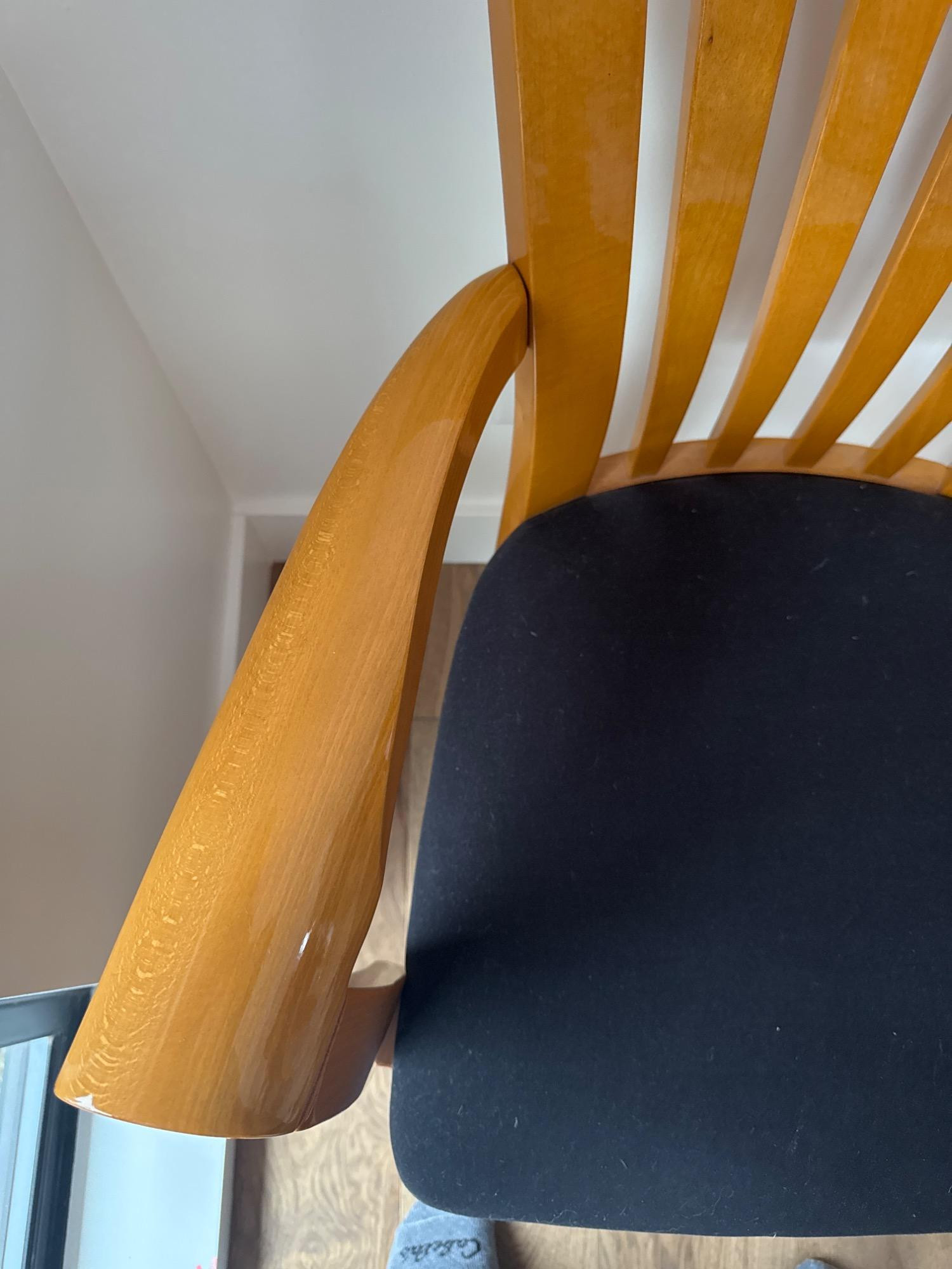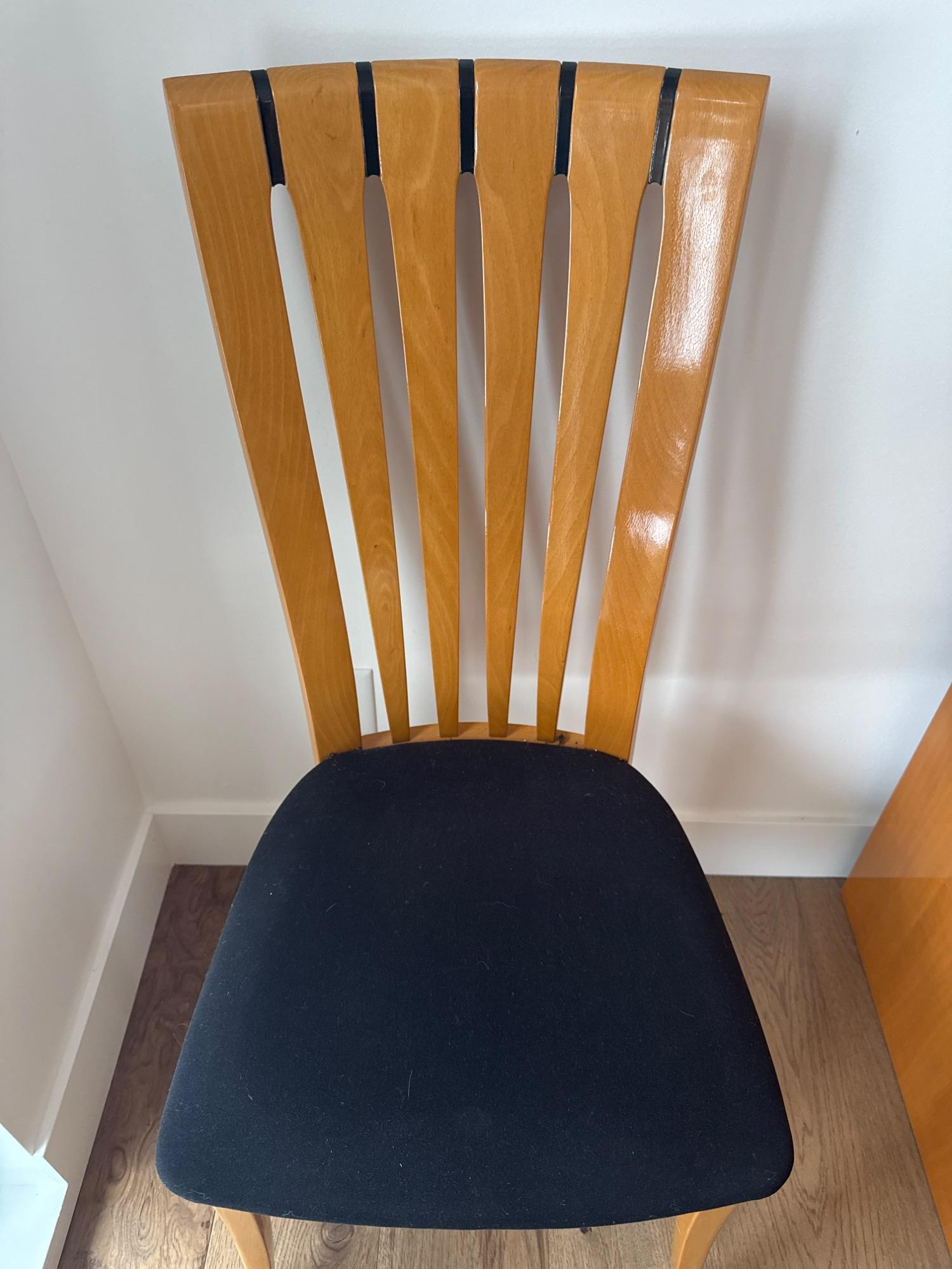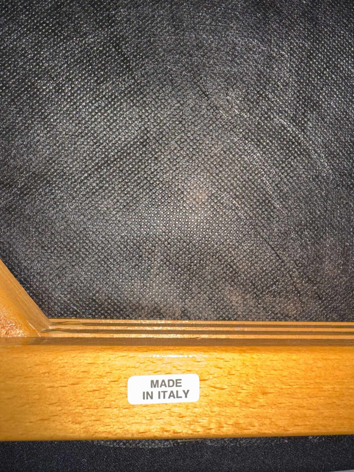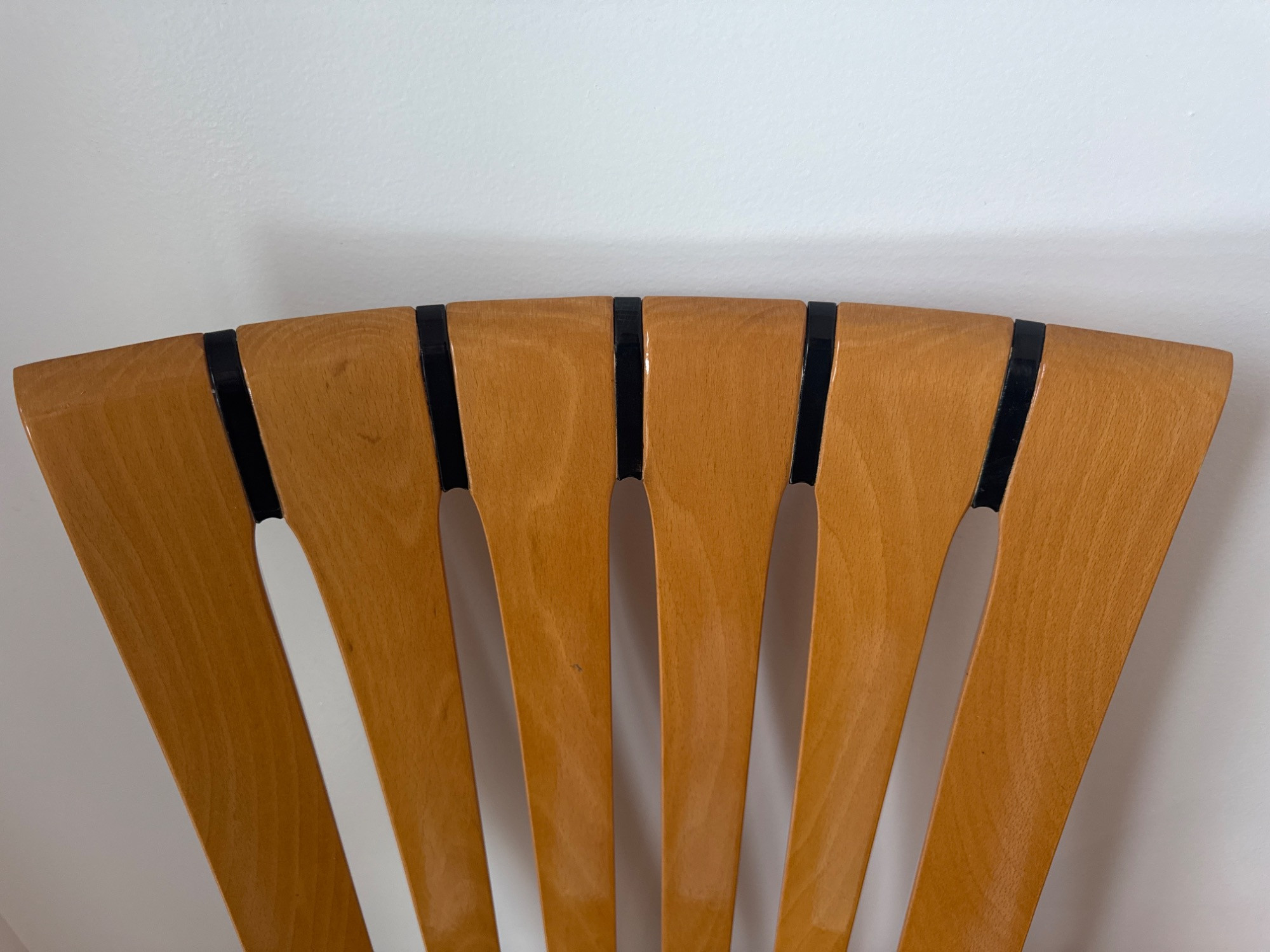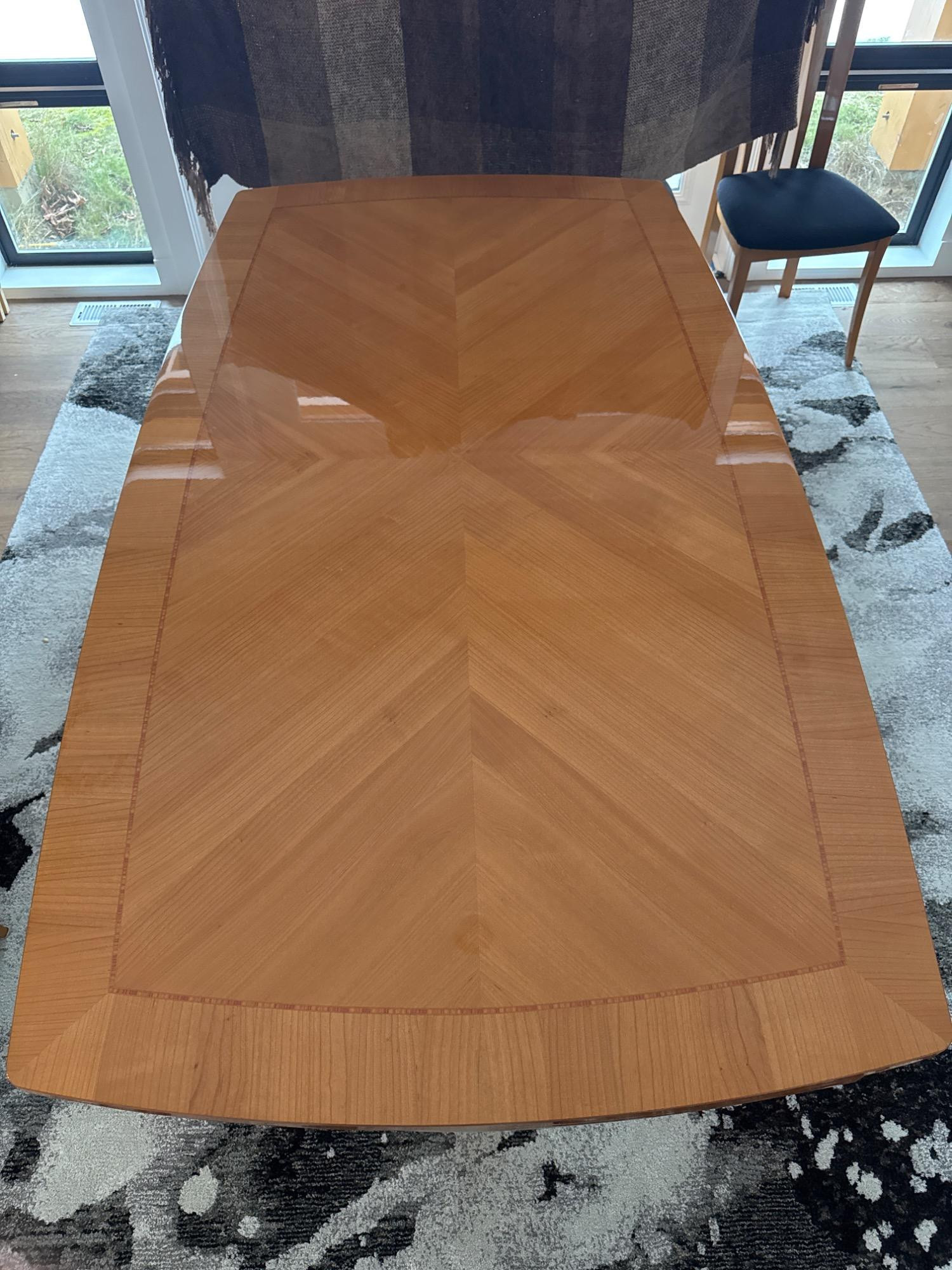 An Italian Modern dining table with 6 regular chairs and 2 Captains chairs set by Excelsior Designs. The rectangular wooden table has a reverse diamond matched top with high gloss finish and inlaid border. It has two extension leaves that fit to either end on draw supports. The table stands on thick, cylindrical legs, which are joined on either end by a curved black base. The six chairs have curved slat backs that taper from top to bottom, black upholstered seats, and tapered legs. The Captains chairs have nice sloping arms. Some damage on a corner as shown in the photos. 6 regular chairs. 2 Captains chairs. Table when the two leaf extensions are inserted makes the table 111" in length. The extensions are 17" each. Auction also includes 3 pads to protect table when not in use. NOTE: Lots 9 & 11 are matching pieces.