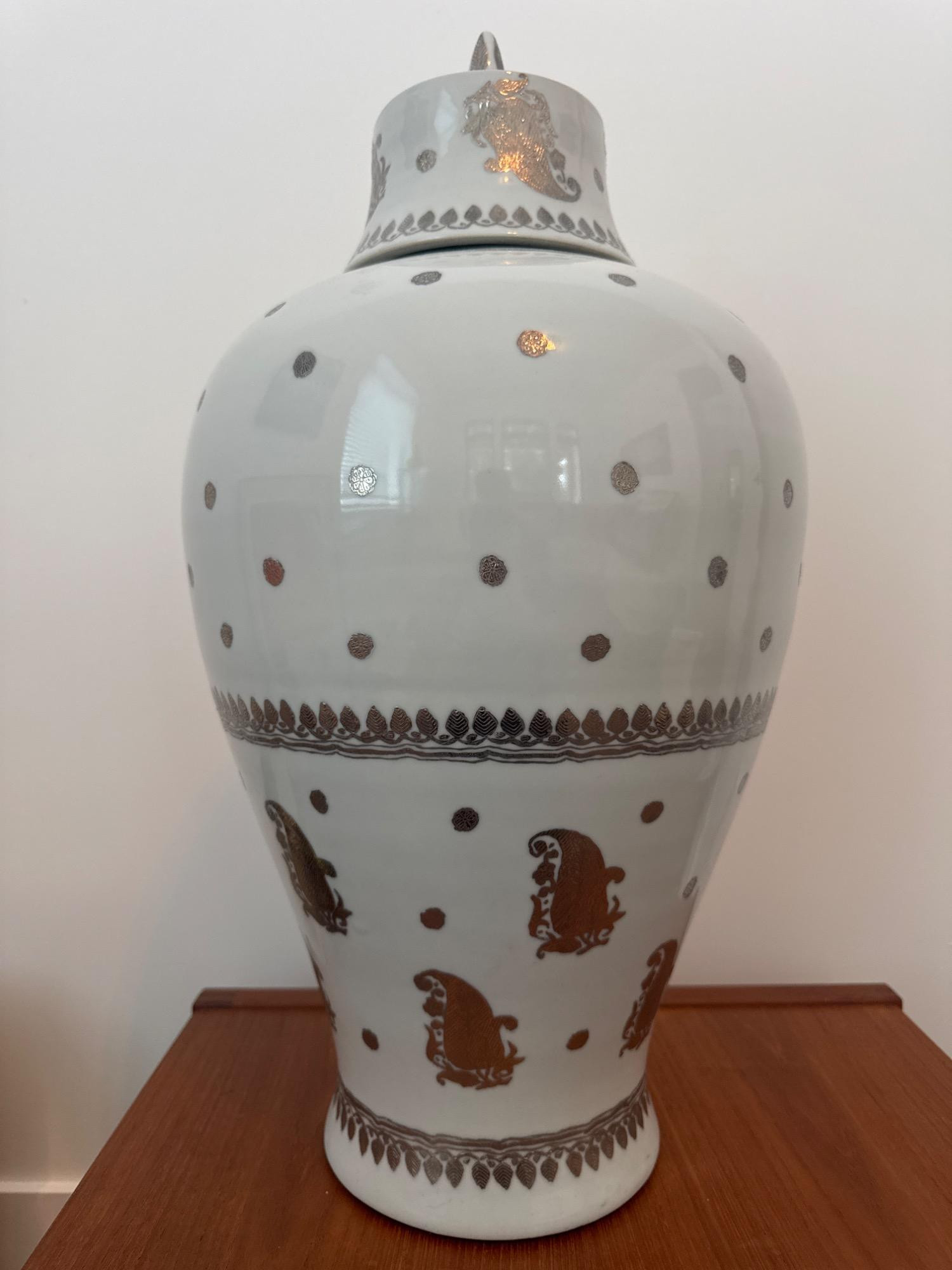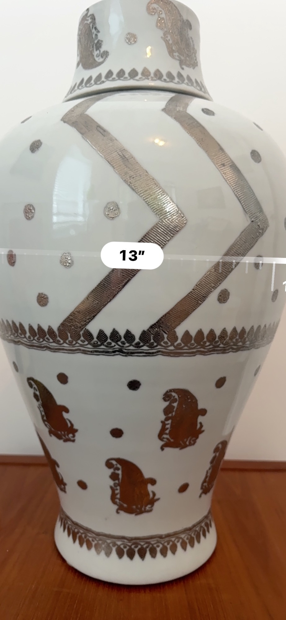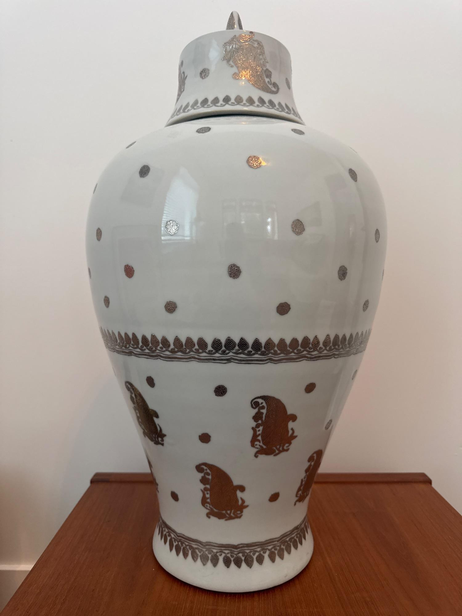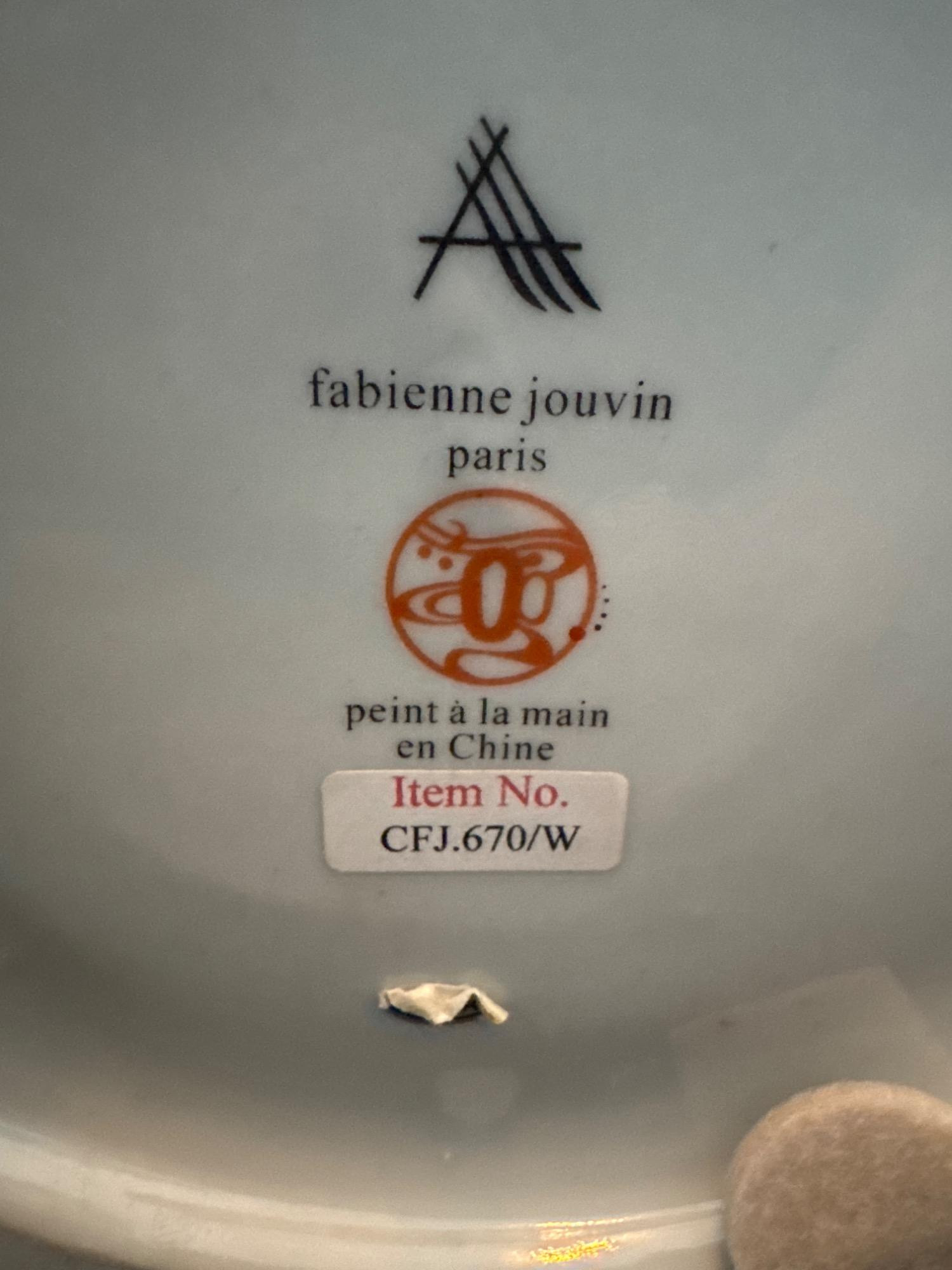 Fabienne Jouvin, a renowned Parisian designer, is celebrated for their exquisite cloisonné enamelware, particularly the ginger jars that blend traditional craftsmanship with contemporary aesthetics. Their large ginger jars are notable for their vibrant colors, intricate patterns, and meticulous attention to detail, making them coveted pieces for collectors and interior enthusiasts alike. These jars not only serve as functional storage solutions but also as artistic statements that enhance the aesthetic appeal of any room. Dimensions are approximate. Condition is excellent. There is one small chip (seen in photos) under the lid which is not noticeable or seen when displayed.