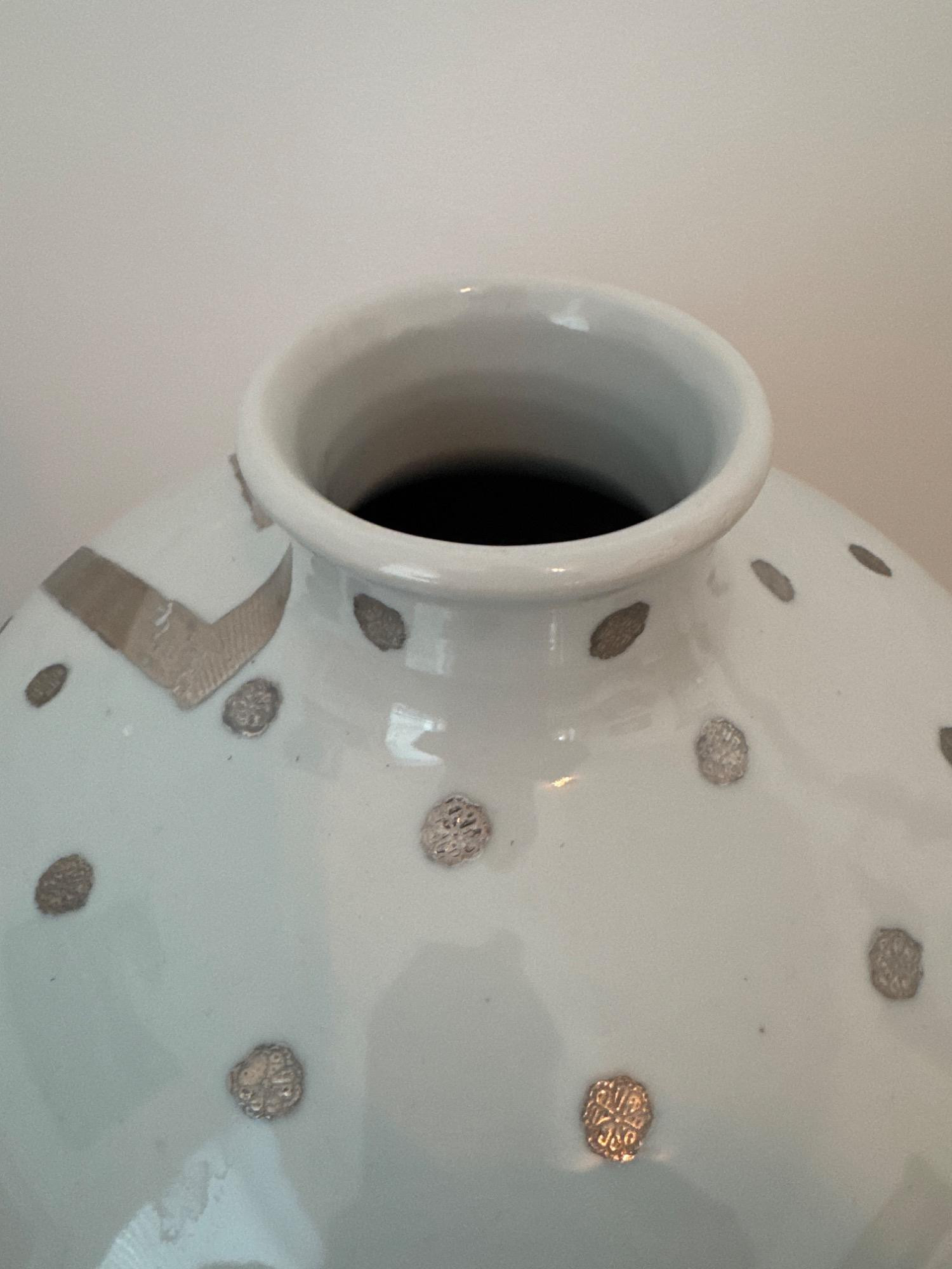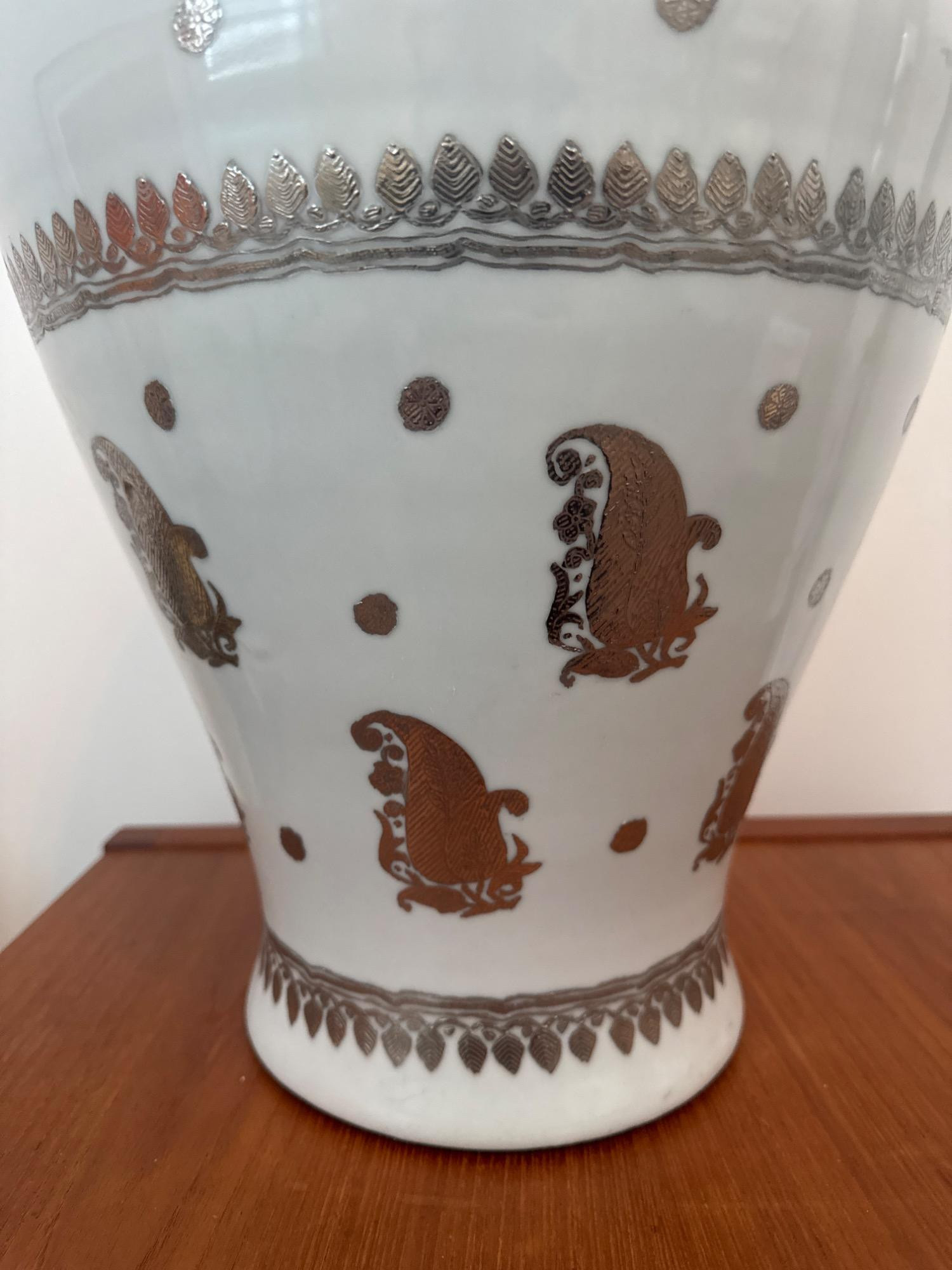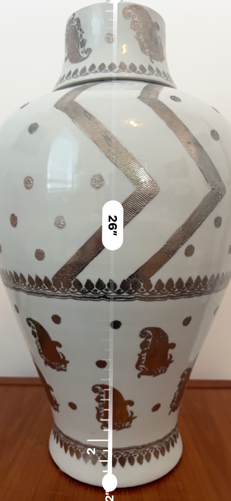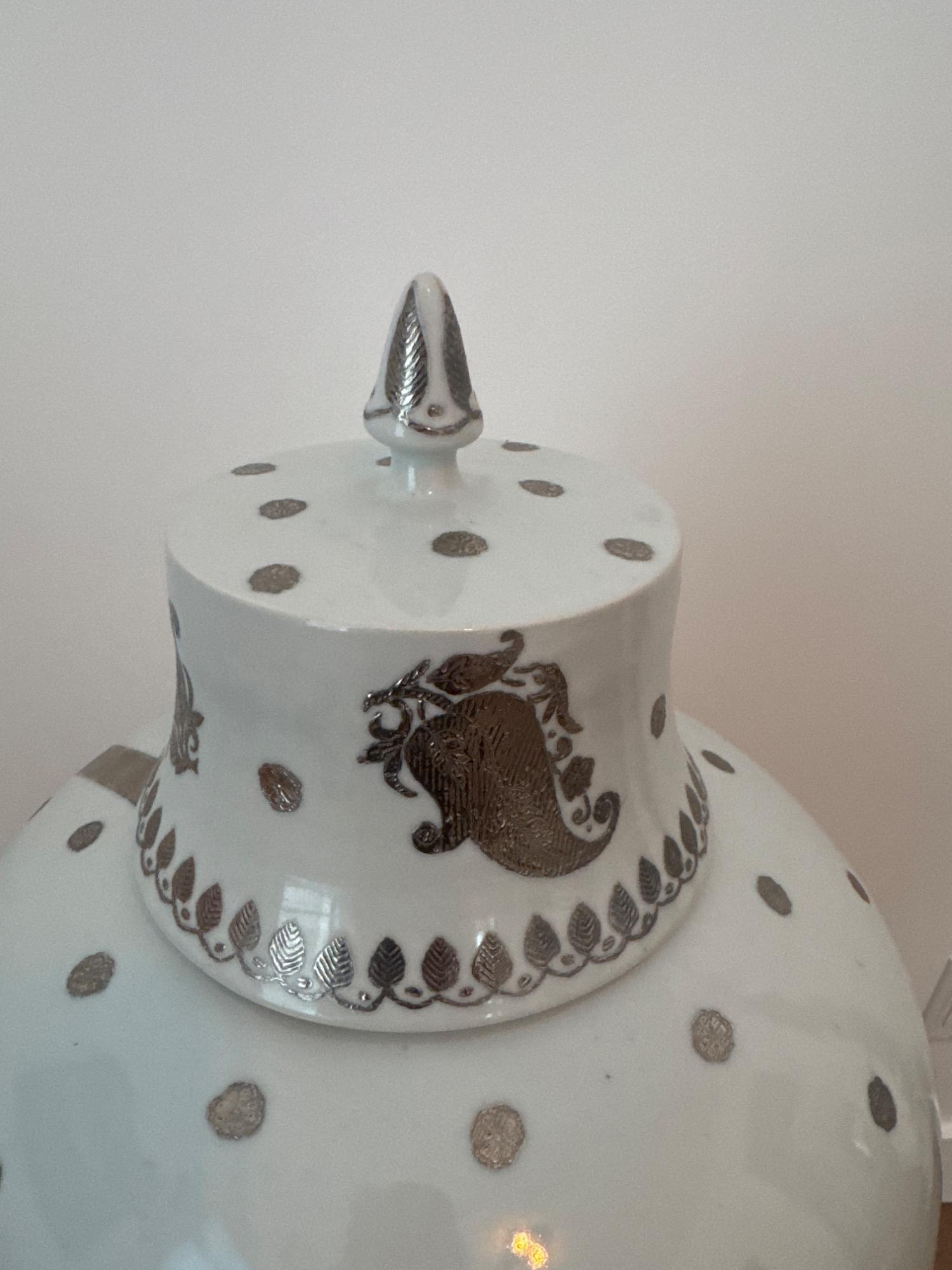 Fabienne Jouvin, a renowned Parisian designer, is celebrated for their exquisite cloisonné enamelware, particularly the ginger jars that blend traditional craftsmanship with contemporary aesthetics. Their large ginger jars are notable for their vibrant colors, intricate patterns, and meticulous attention to detail, making them coveted pieces for collectors and interior enthusiasts alike. These jars not only serve as functional storage solutions but also as artistic statements that enhance the aesthetic appeal of any room. Dimensions are approximate. Condition is excellent. There is one small chip (seen in photos) under the lid which is not noticeable or seen when displayed.