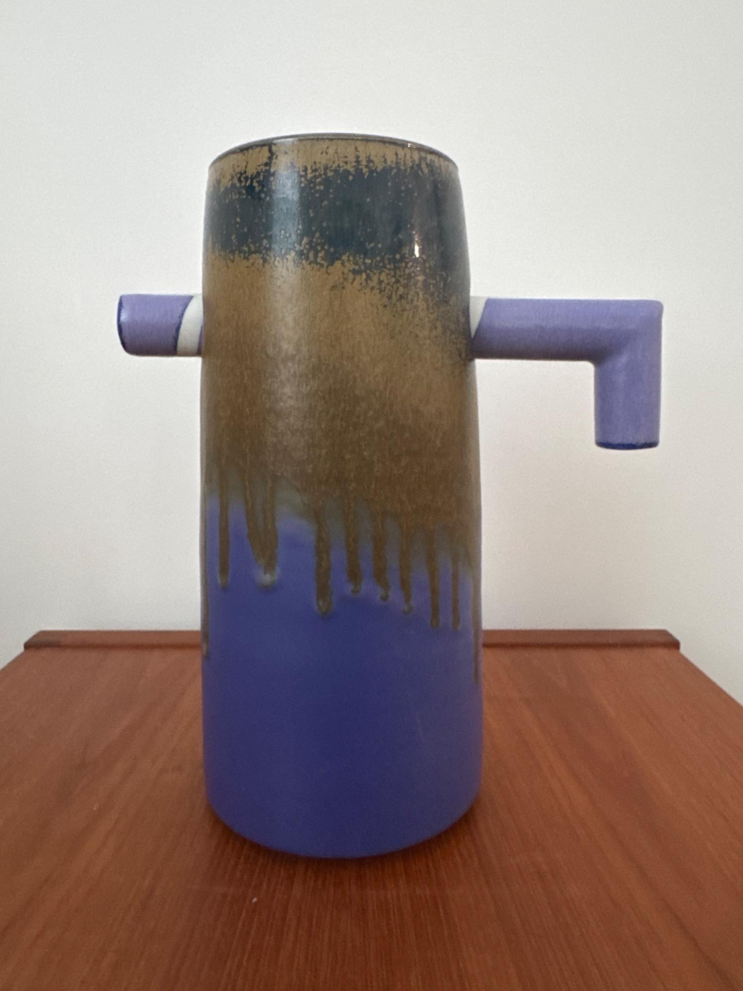 Matthew Patton is known for functional heel thrown and slab built stoneware and porcelain functional pottery high fired in reduction gas kiln. Patton is best known for his wall platters. Surface techniques include the overall application of deep reds, cobalt blues, and other brightly hued glazes in broad geometric patterns or organic designs. Patton considers each piece to mainly be a vehicle for expressive glazes. For this auction we have a 13' tall hand decorated heavy glazed pitcher by Matthew Patton. The underside of the piece is a natural unglazed white clay with nice texture. This finely crafted pitcher measures 16" tall and 5.5" wide with a angular piece that slides through the middle. The underside base is signed Patton and dated 1989. It is in nice original condition. Dimensions are approximate.