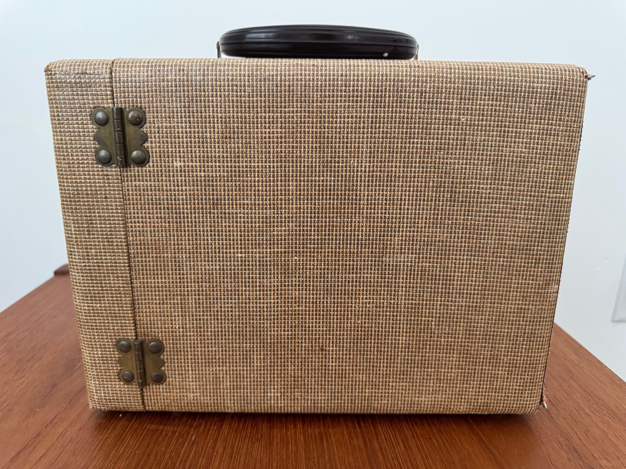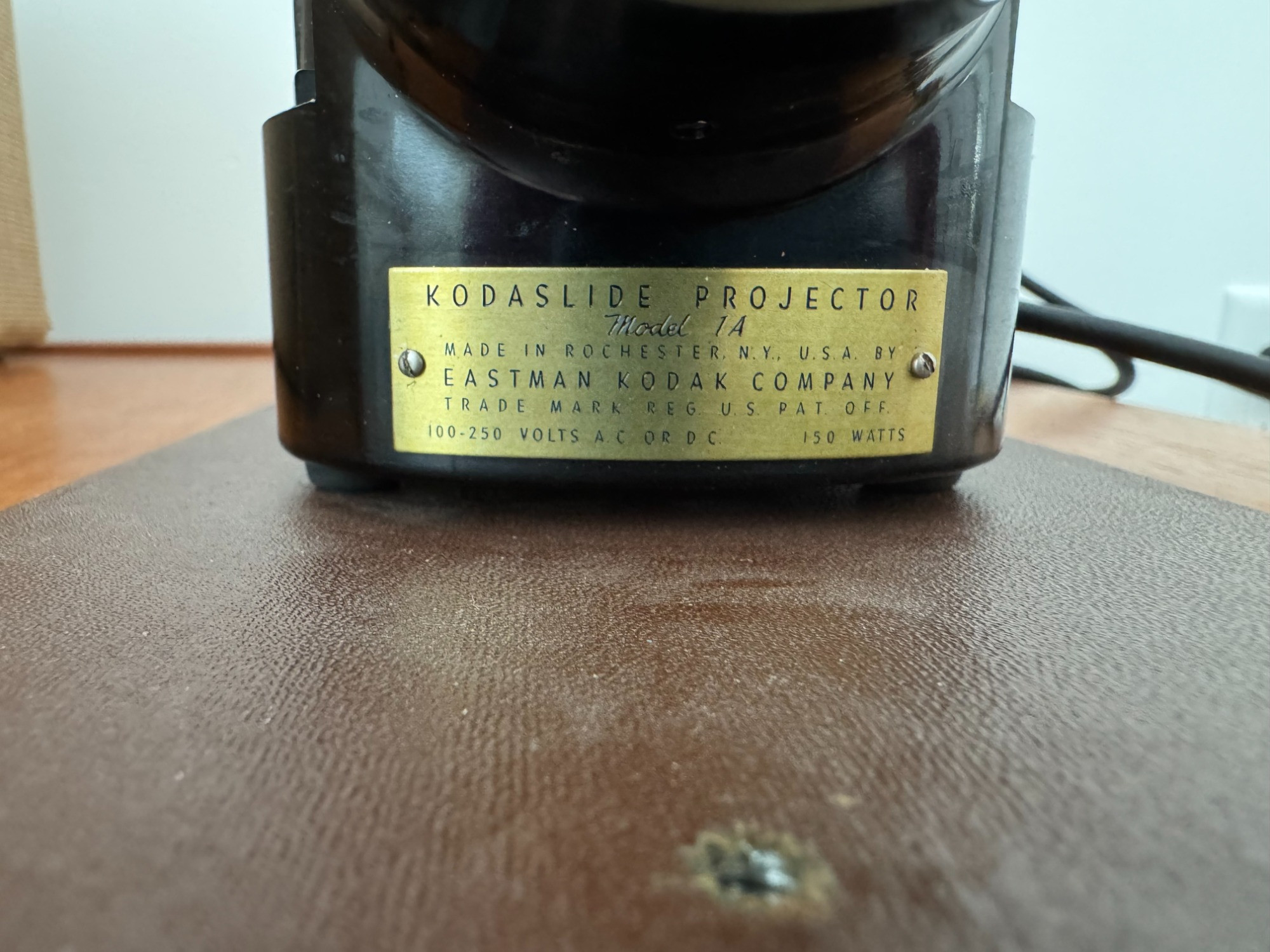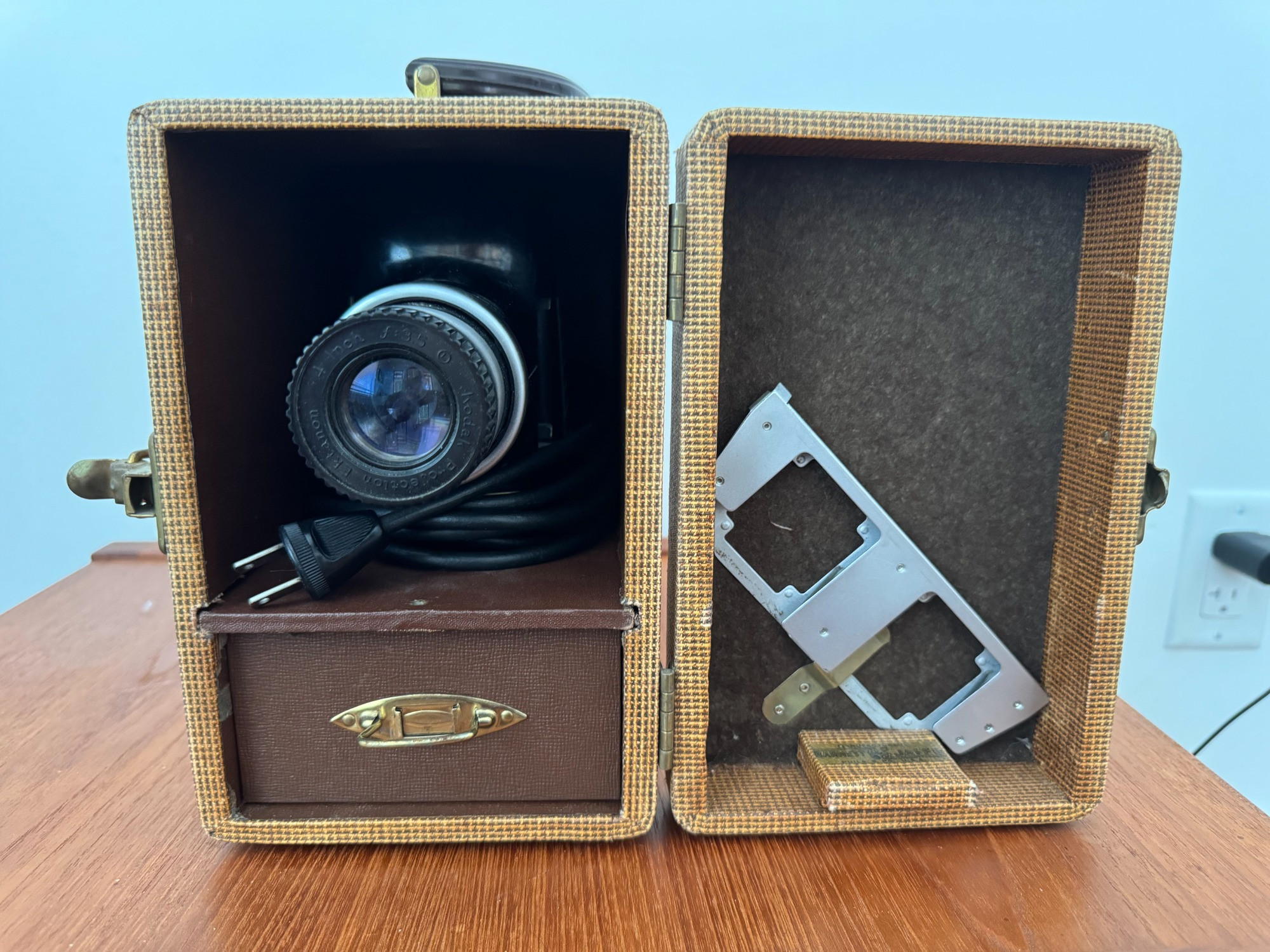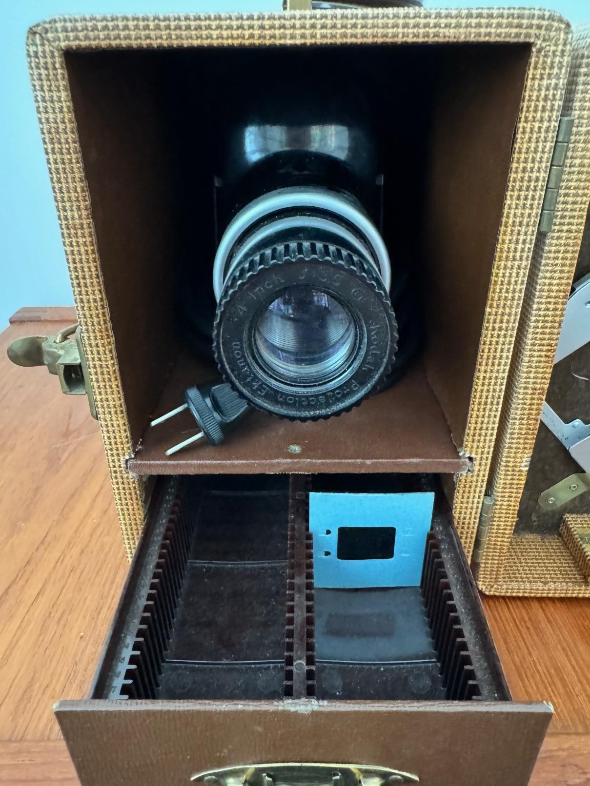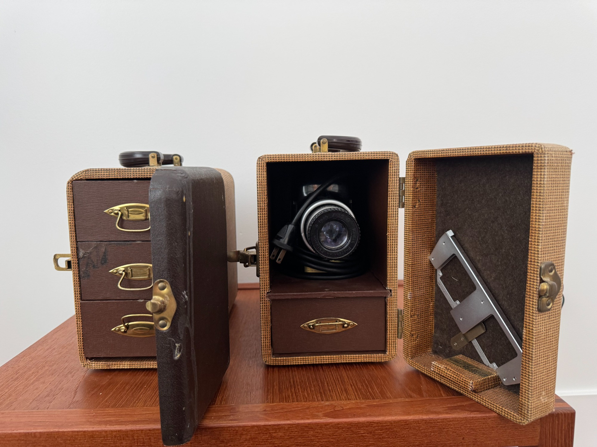 The Kodaslide Projector Model 1A is a vintage slide projector produced by Eastman Kodak Company, serving as an improved version of their original Kodaslide Projector from the late 1930s. This model was designed to project 50 x 50 mm glass-mounted transparency slides, a popular format during that era. Auction includes projector with case and a case for slides. See photos for condition. Some vintage wear. Slide case has a crack on one of the drawer slides. Projector was turned on (as seen in photos) and works.