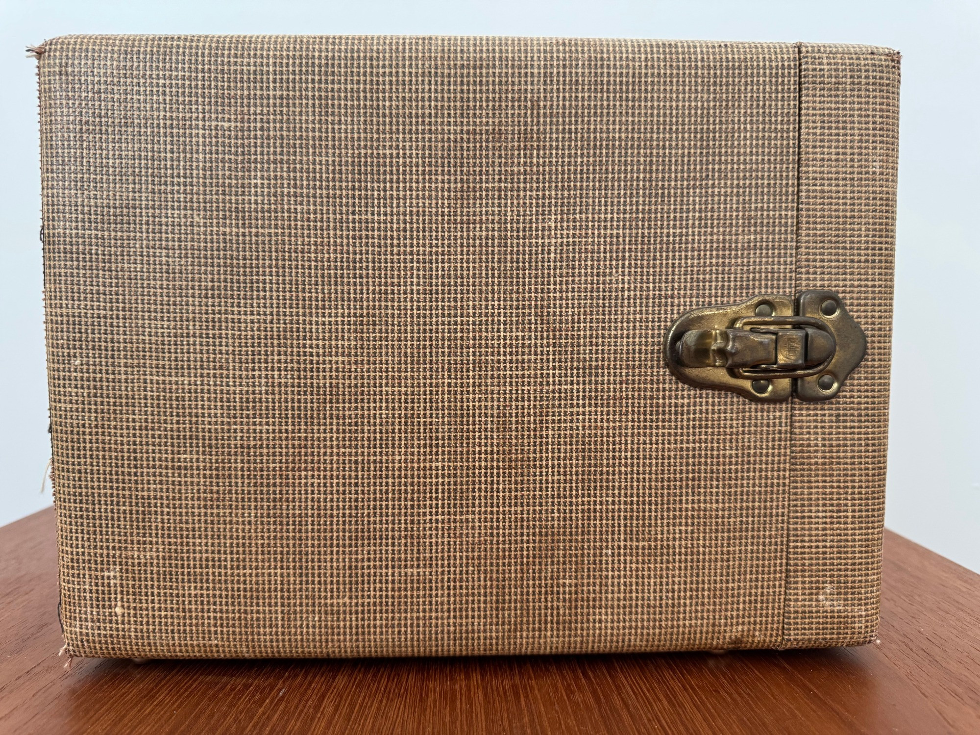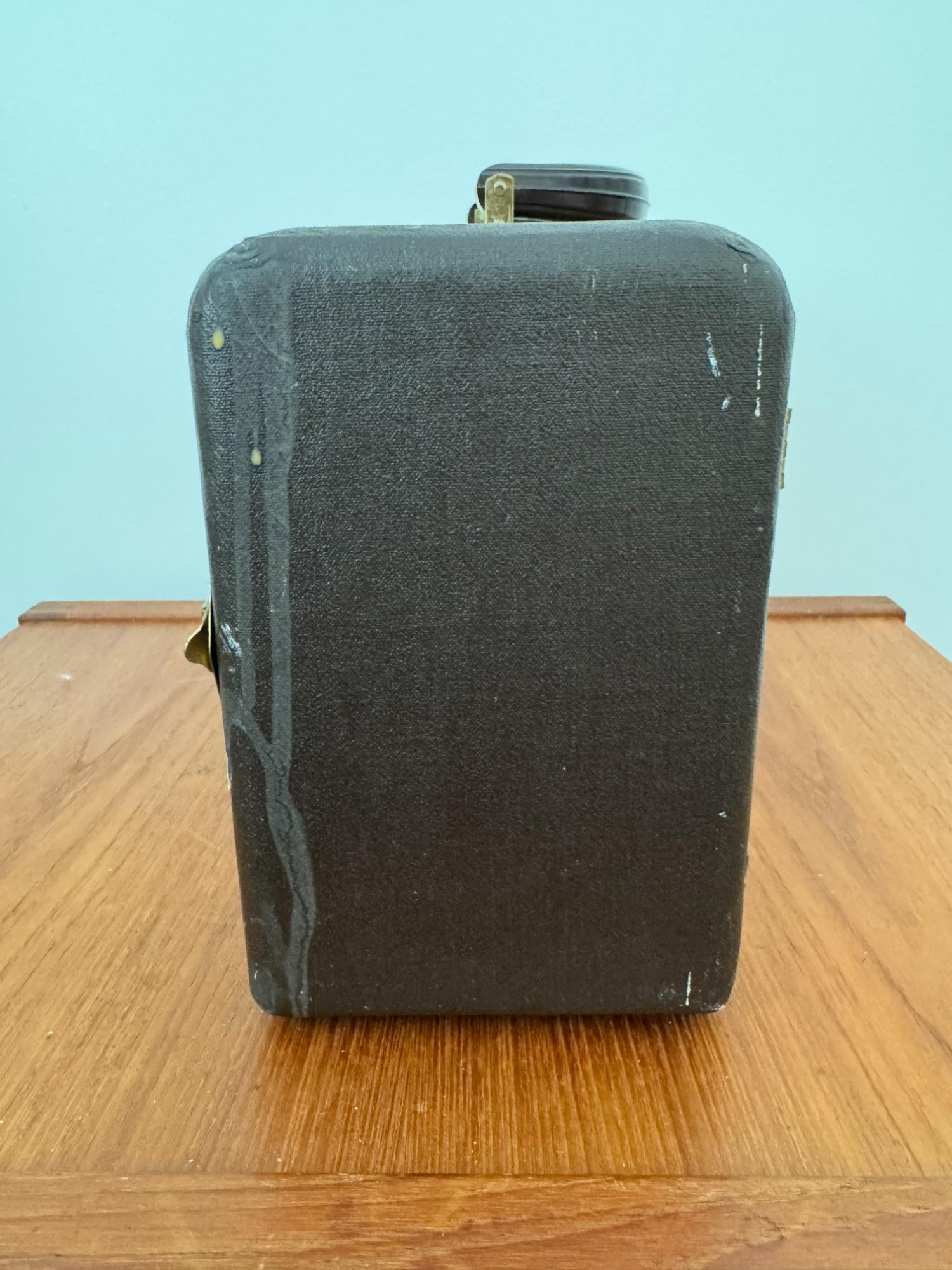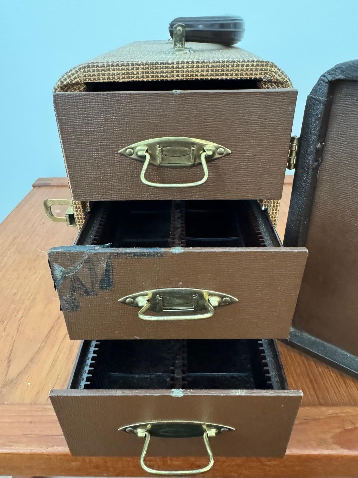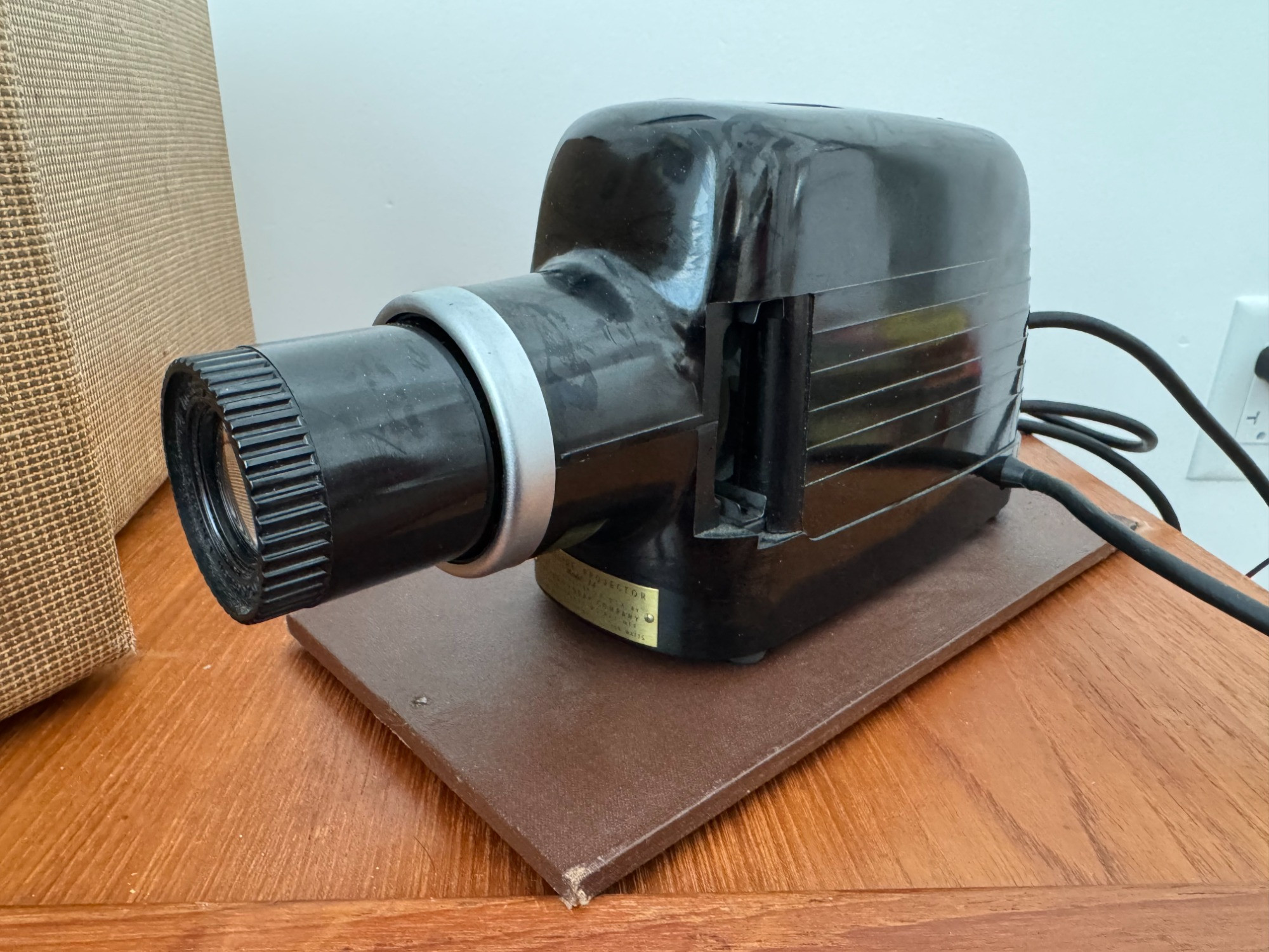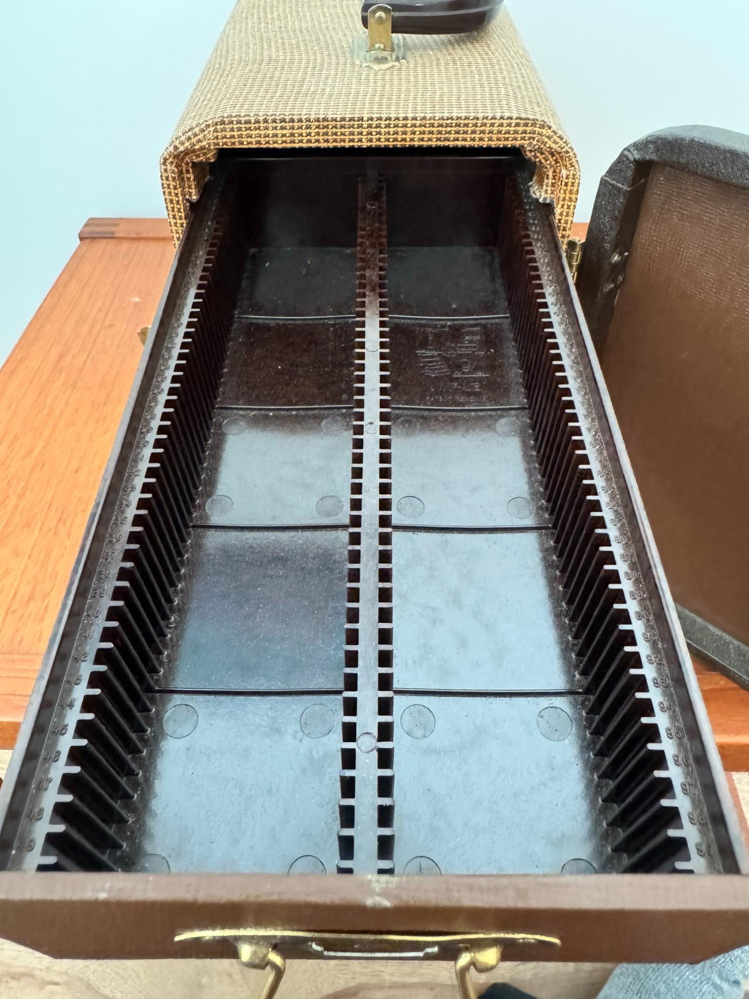 The Kodaslide Projector Model 1A is a vintage slide projector produced by Eastman Kodak Company, serving as an improved version of their original Kodaslide Projector from the late 1930s. This model was designed to project 50 x 50 mm glass-mounted transparency slides, a popular format during that era. Auction includes projector with case and a case for slides. See photos for condition. Some vintage wear. Slide case has a crack on one of the drawer slides. Projector was turned on (as seen in photos) and works.