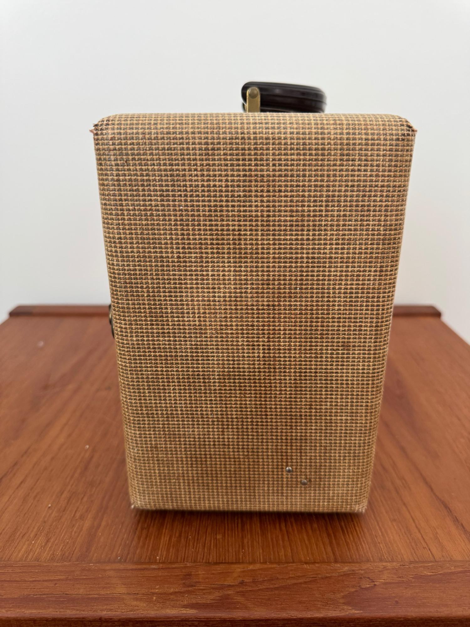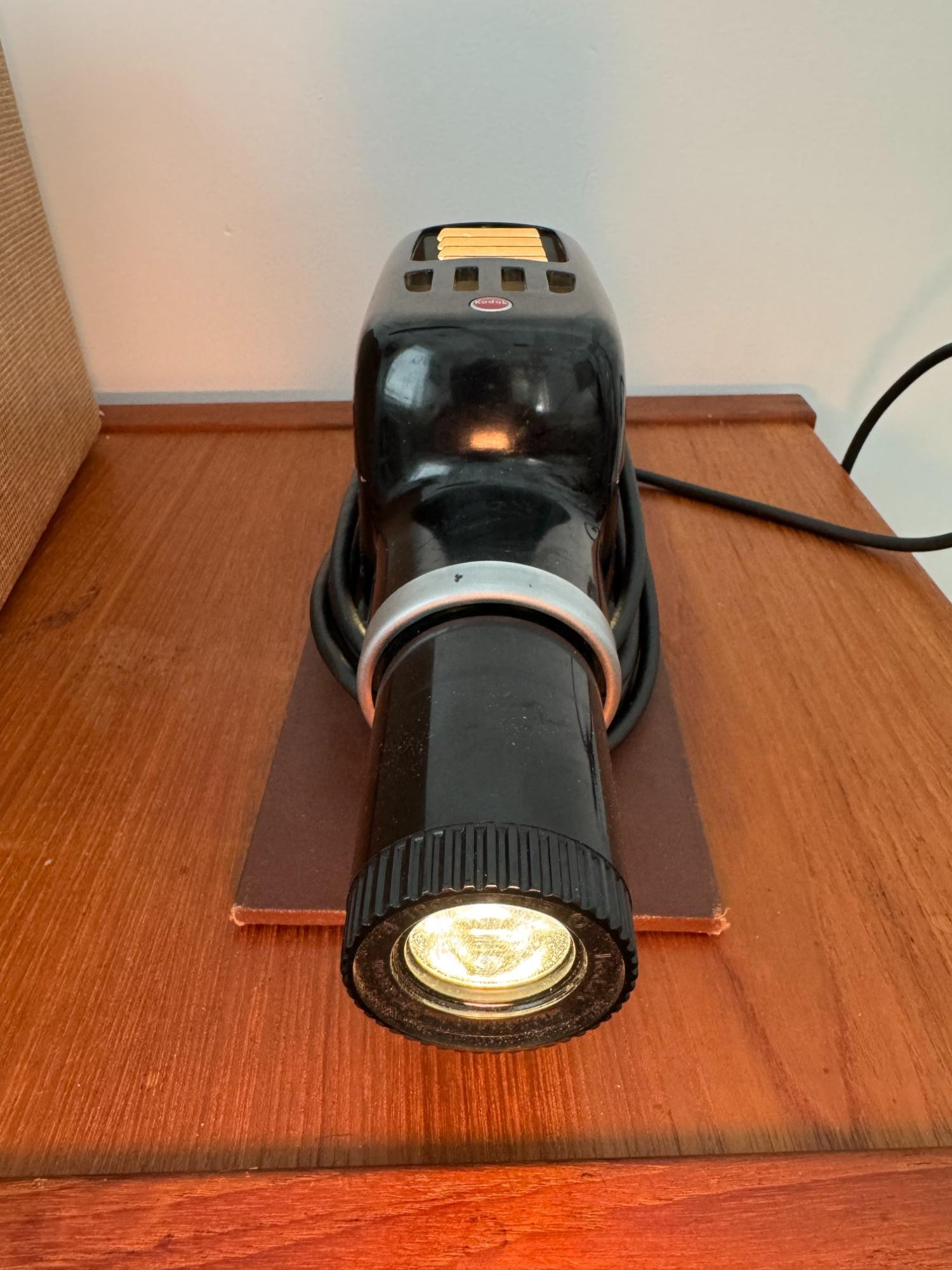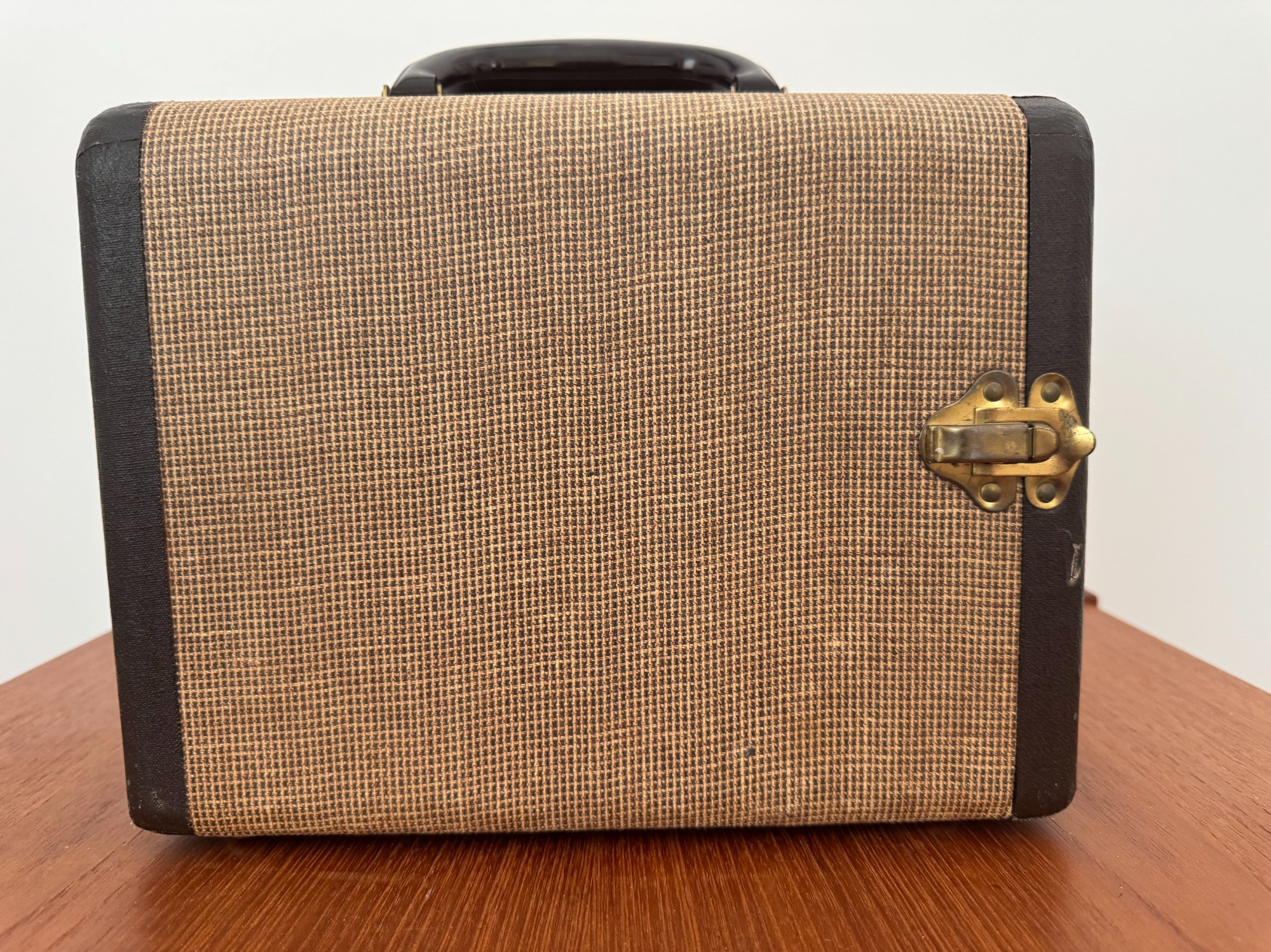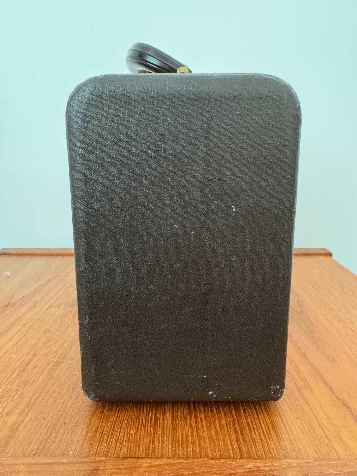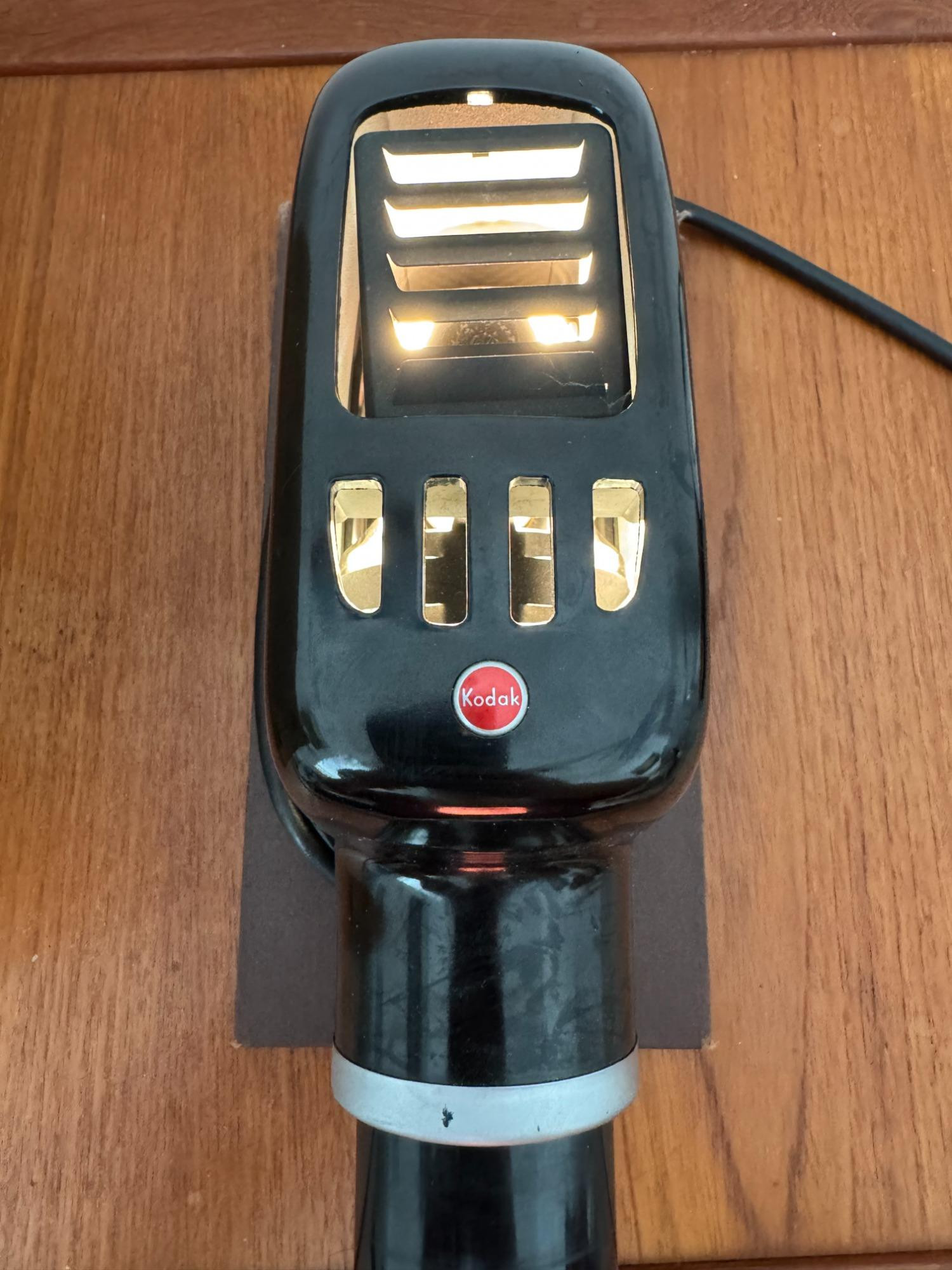 The Kodaslide Projector Model 1A is a vintage slide projector produced by Eastman Kodak Company, serving as an improved version of their original Kodaslide Projector from the late 1930s. This model was designed to project 50 x 50 mm glass-mounted transparency slides, a popular format during that era. Auction includes projector with case and a case for slides. See photos for condition. Some vintage wear. Slide case has a crack on one of the drawer slides. Projector was turned on (as seen in photos) and works.