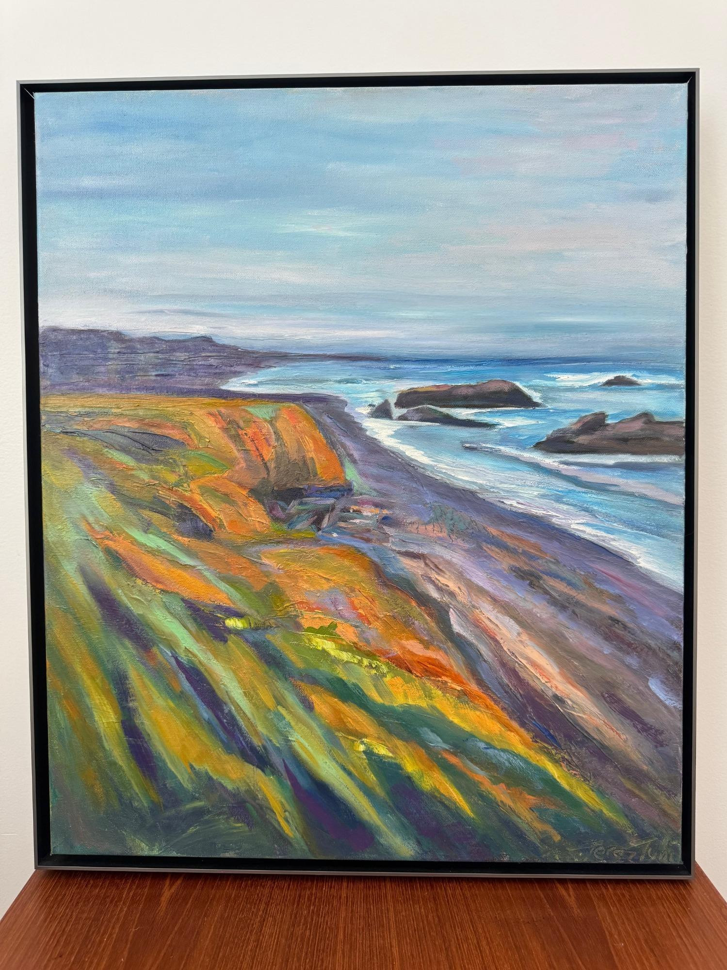 Fiscalini View- 20 x 24 oil on wide wrapped canvas - Cambria estate preserve called “Fiscalini Ranch” with breathtaking ocean views is a local favorite hiking trail. Known and respected for her bold, spirited style and use of vivid color, Terez Tyni’s paintings create a sense of peace that capture the vibrancy of California’s central coast and beyond! Her inspiration comes from places she has visited and the north county Paso Robles Oak trees and vineyards are some of her favorite subjects. https://tereztyni.com/shop/fiscalini-view/ Retail - $1,800.00 Dimensions are approximate.