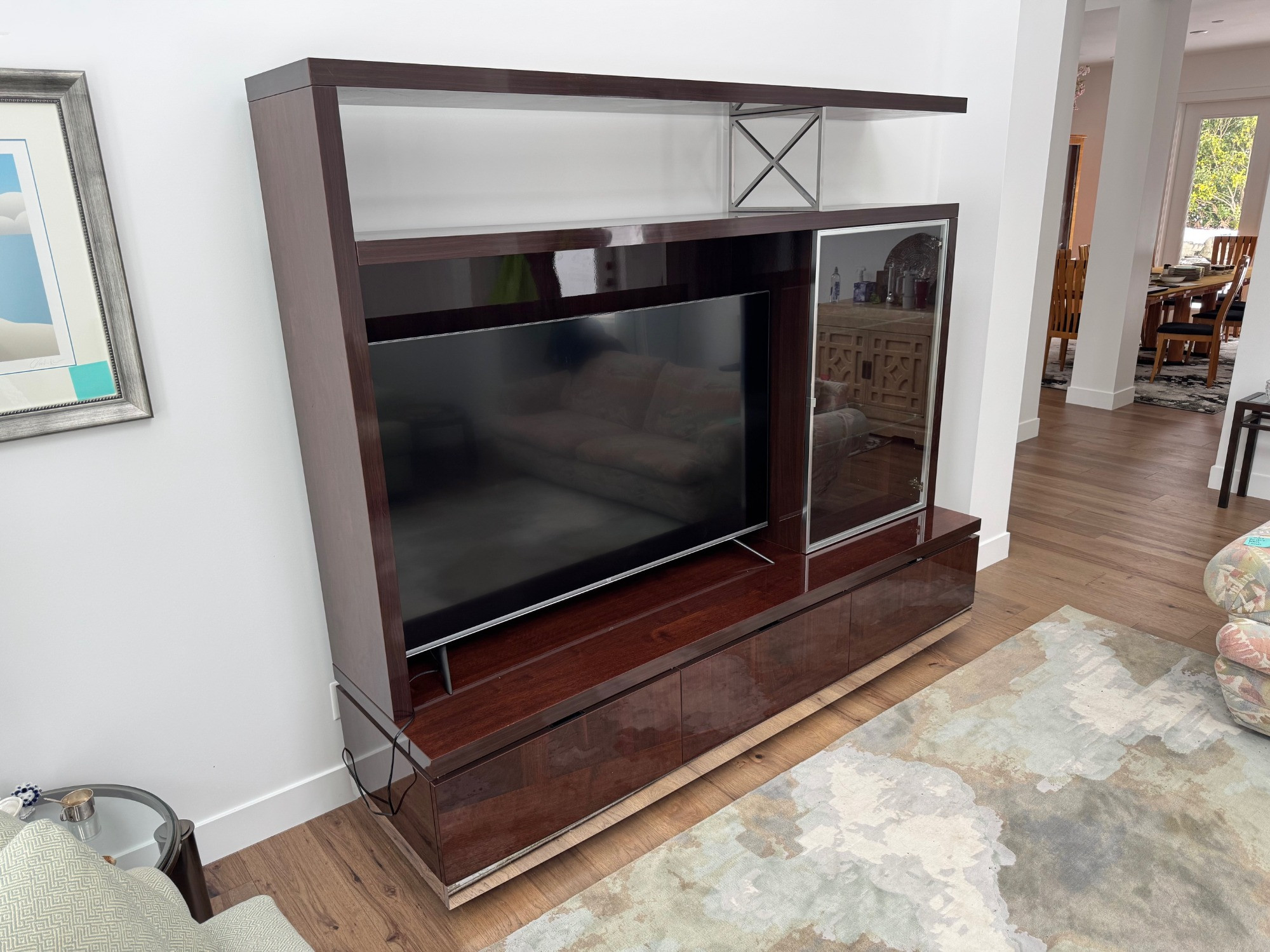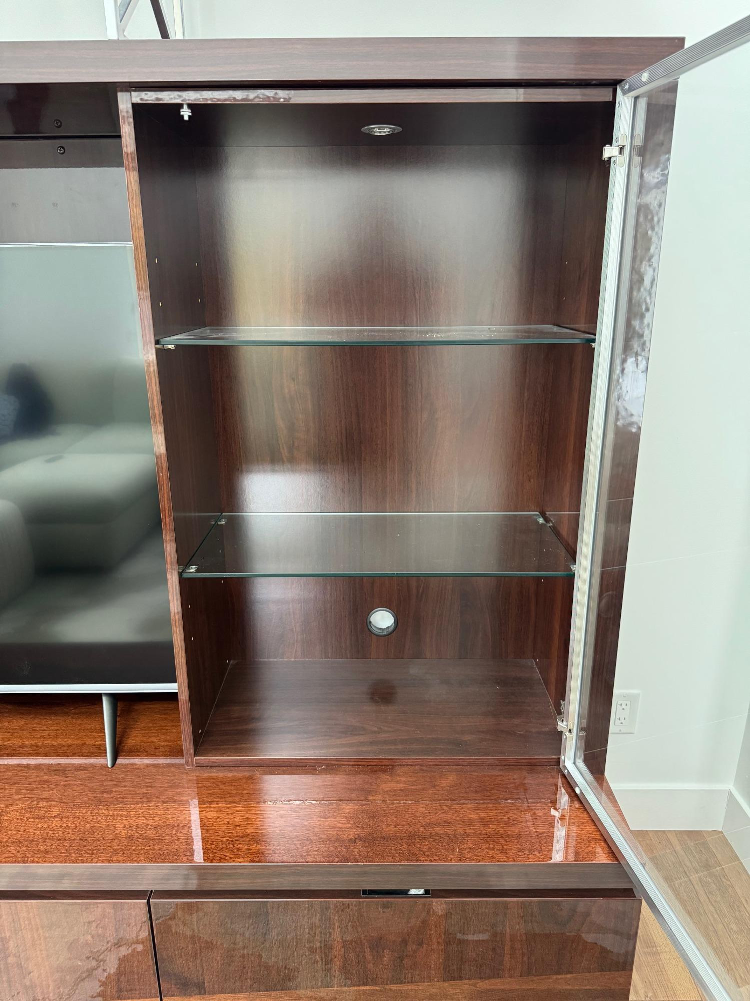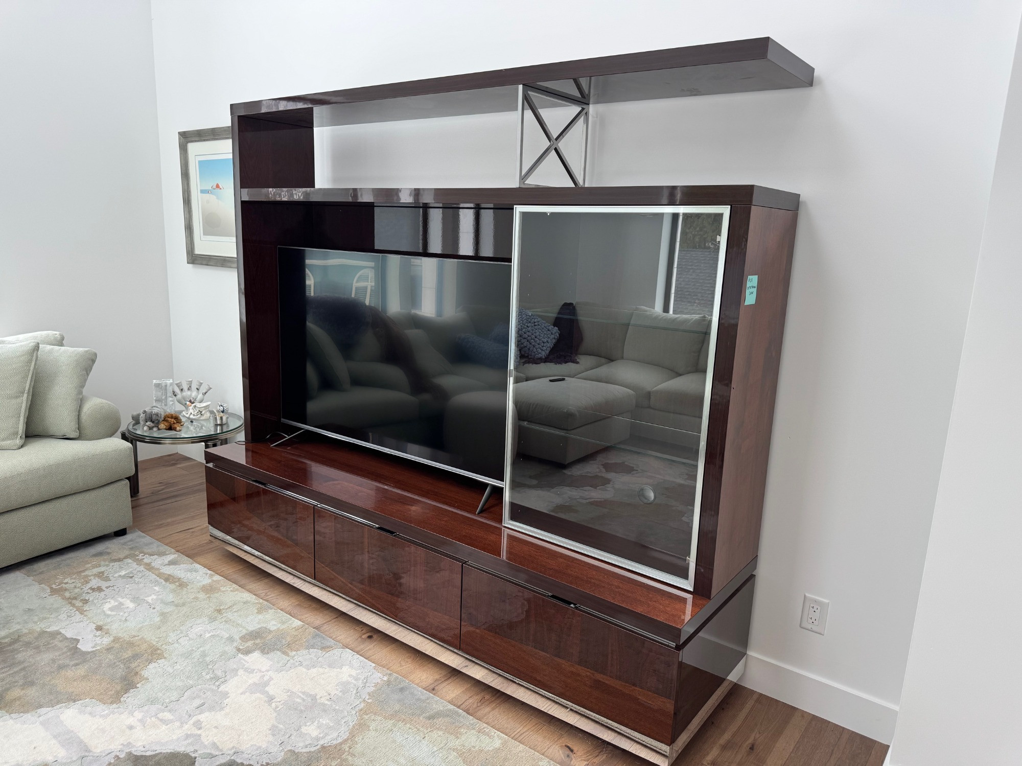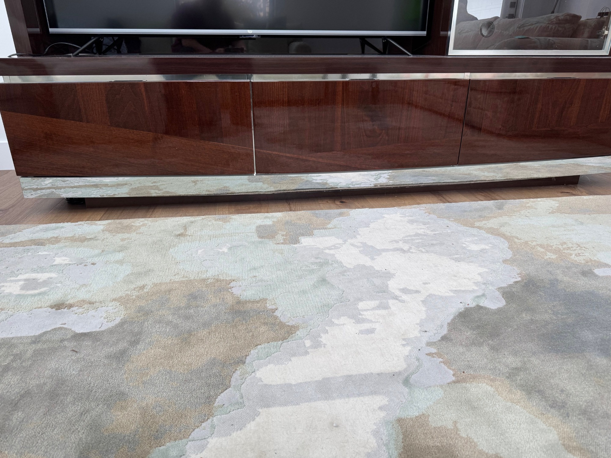 The Garda Media Console from Alf Italia will bring elegance and plenty of storage. It comes in walnut canaletto veneers in a high gloss finish. It features three storage drawers and chrome details. TV area is 59" x 43.5" Canaletto High Gloss Finish w/ Chrome Three Drawers Glass Cabinet w/ LED Light TV and items in the drawers are NOT included in the auction. Retail - $2400 (Discontinued) Dimensions are approximate. Due to the size of this item, professional movers, det up by auction winner, are needed in order to get the item securely out the door.