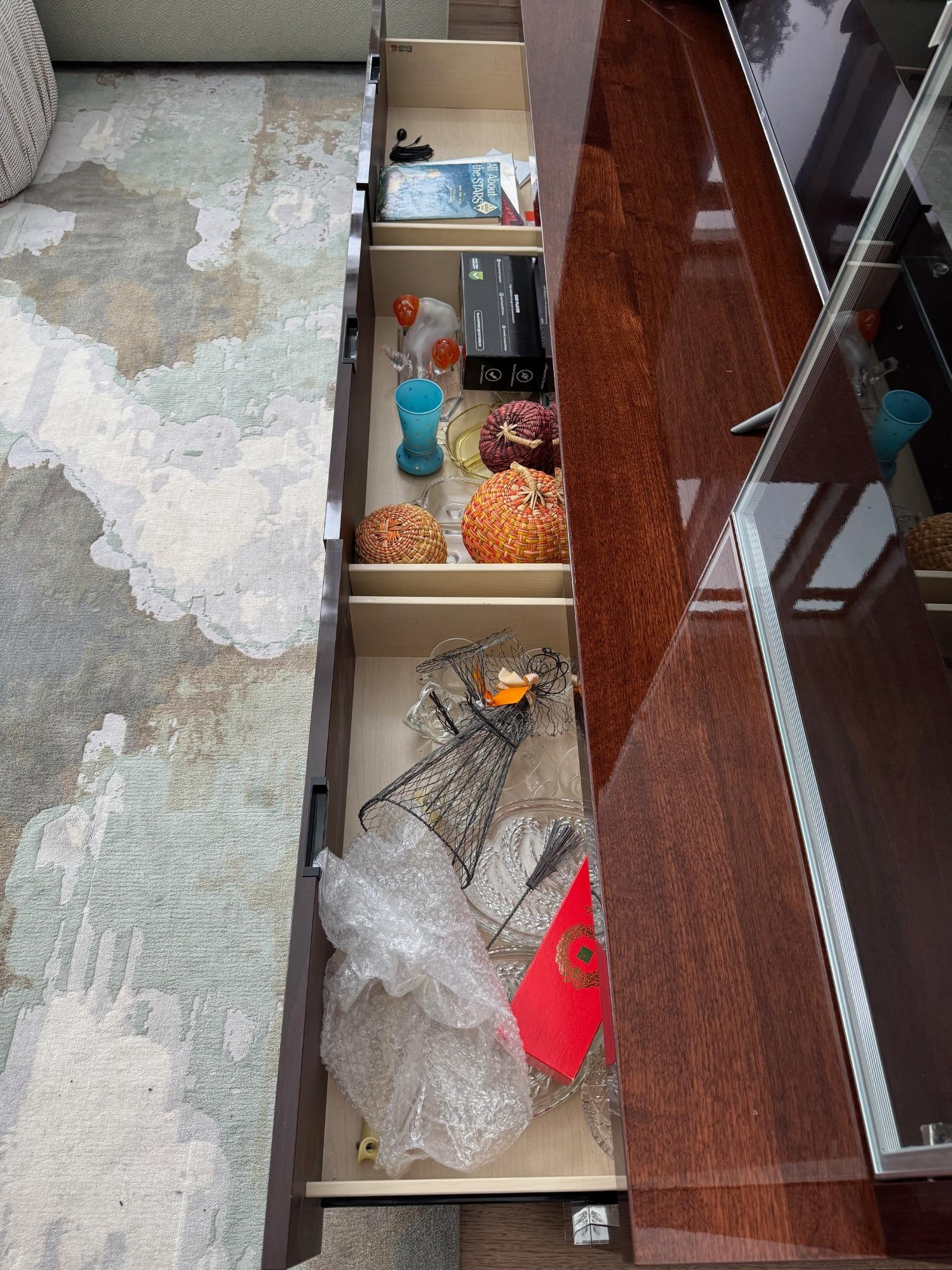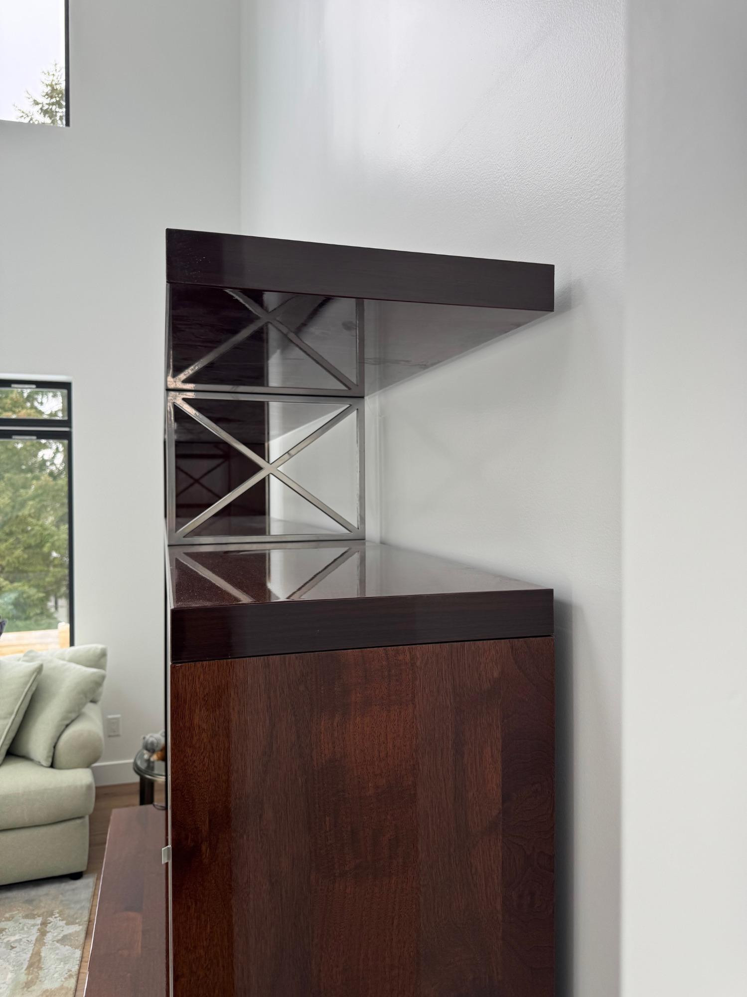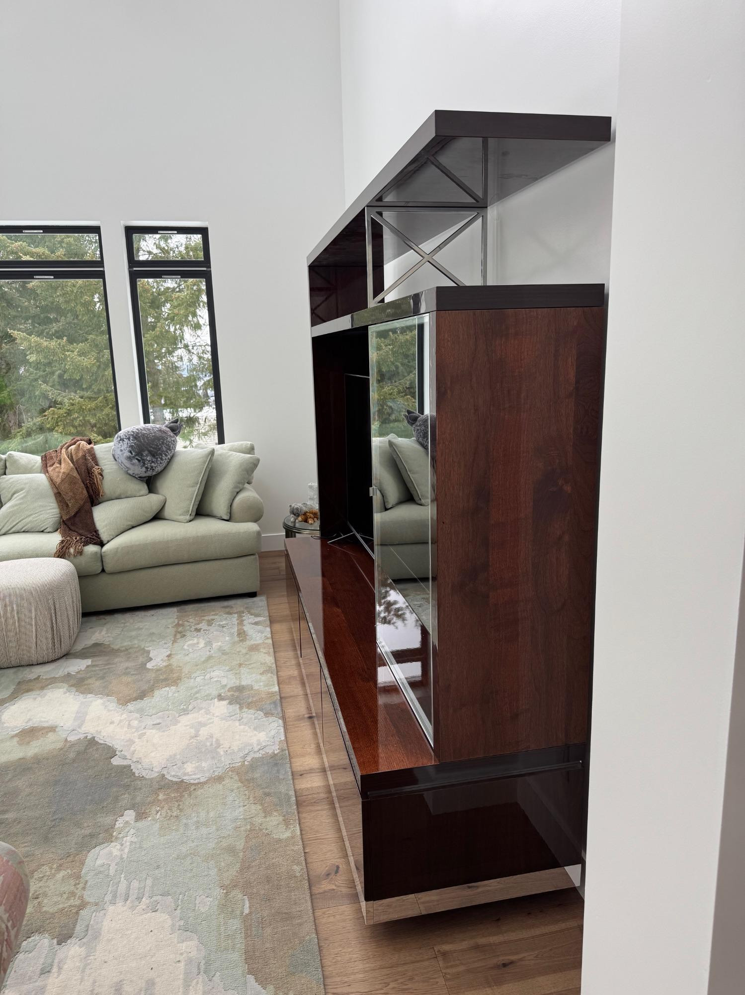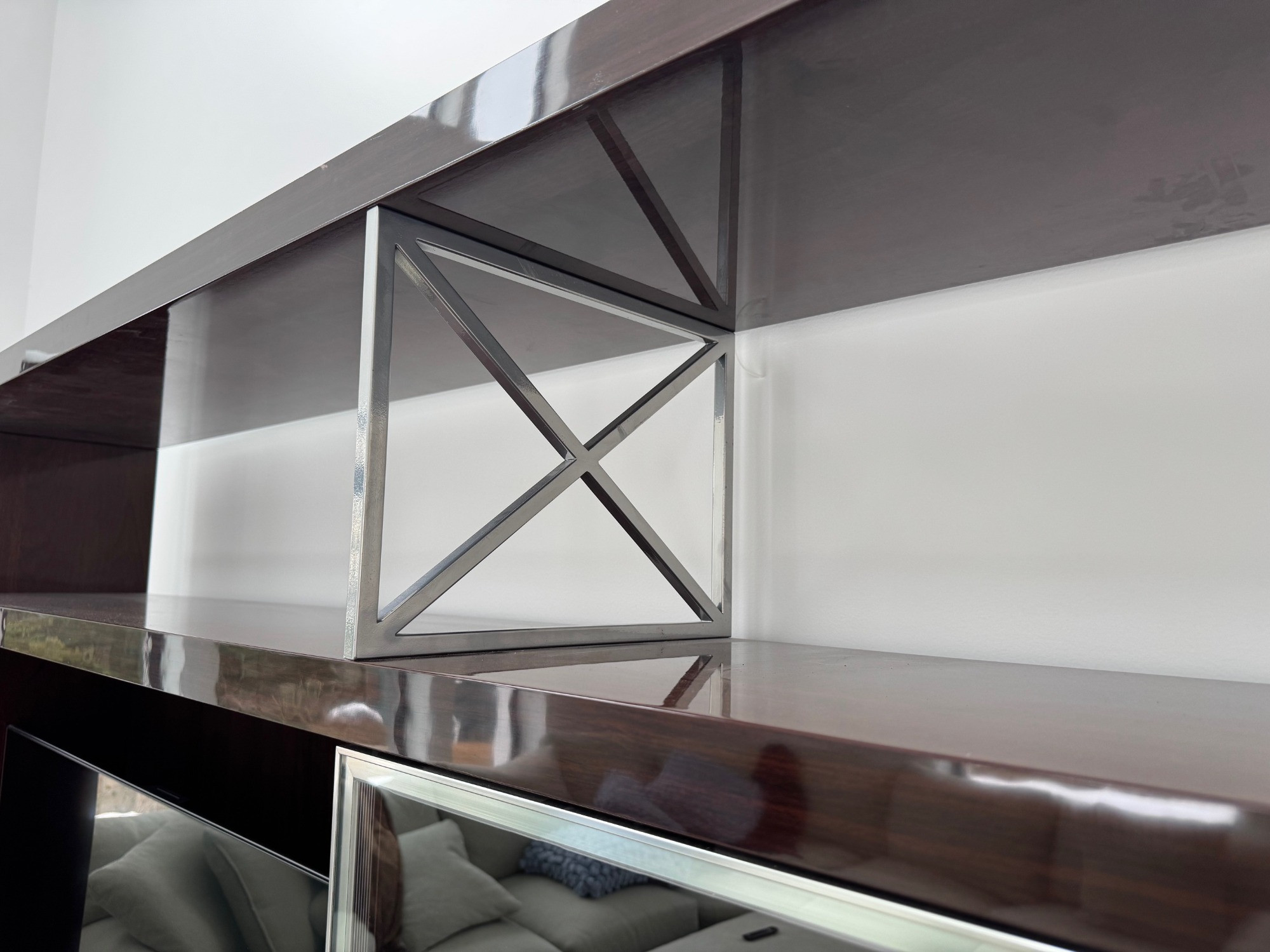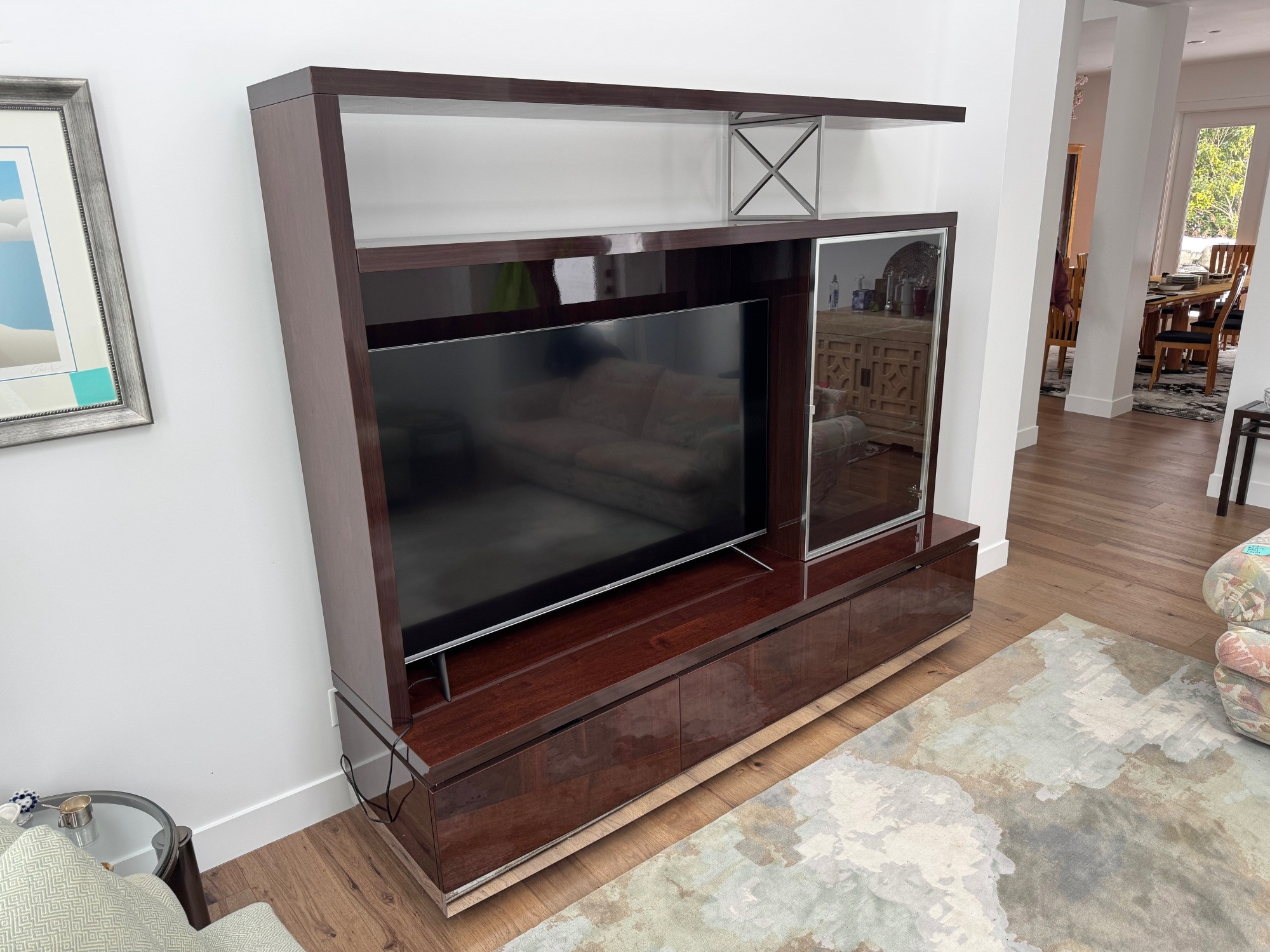 The Garda Media Console from Alf Italia will bring elegance and plenty of storage. It comes in walnut canaletto veneers in a high gloss finish. It features three storage drawers and chrome details. TV area is 59" x 43.5" Canaletto High Gloss Finish w/ Chrome Three Drawers Glass Cabinet w/ LED Light TV and items in the drawers are NOT included in the auction. Retail - $2400 (Discontinued) Dimensions are approximate. Due to the size of this item, professional movers, det up by auction winner, are needed in order to get the item securely out the door.