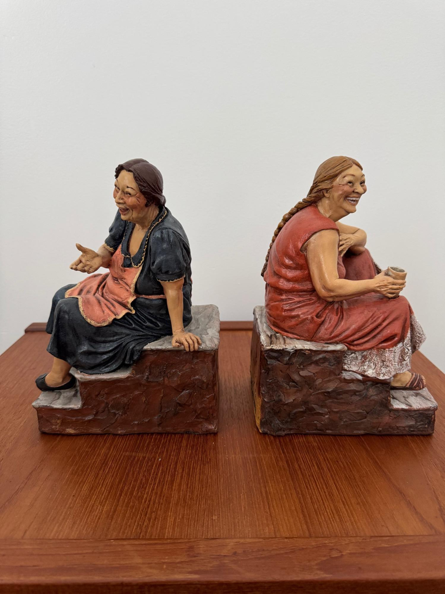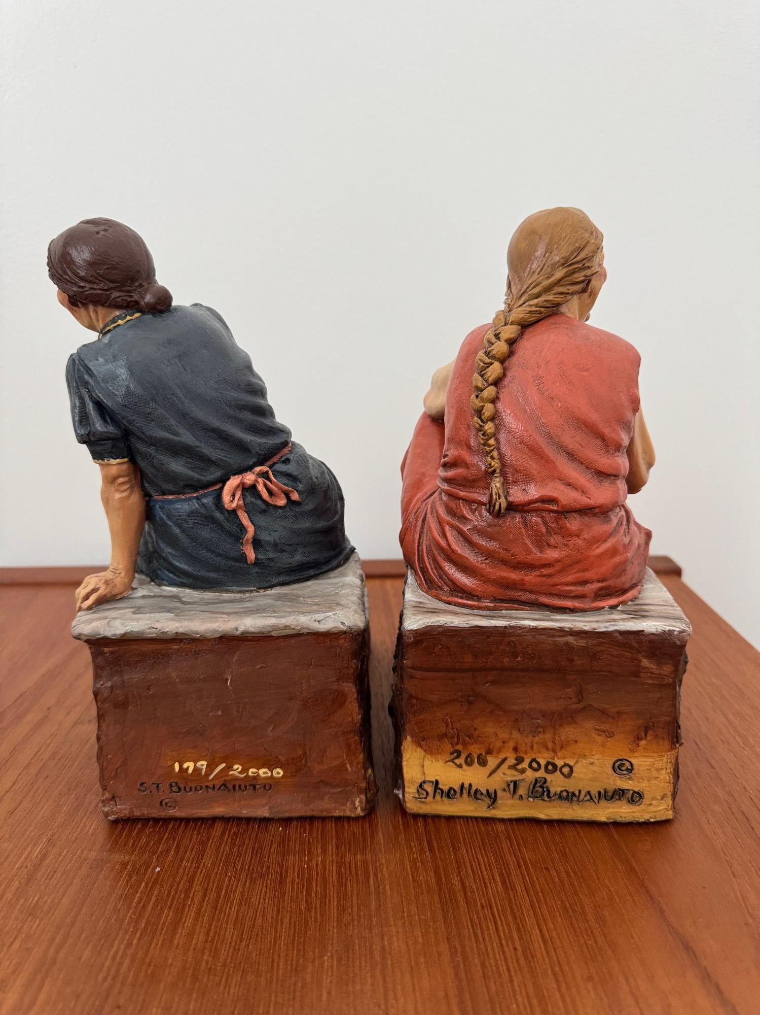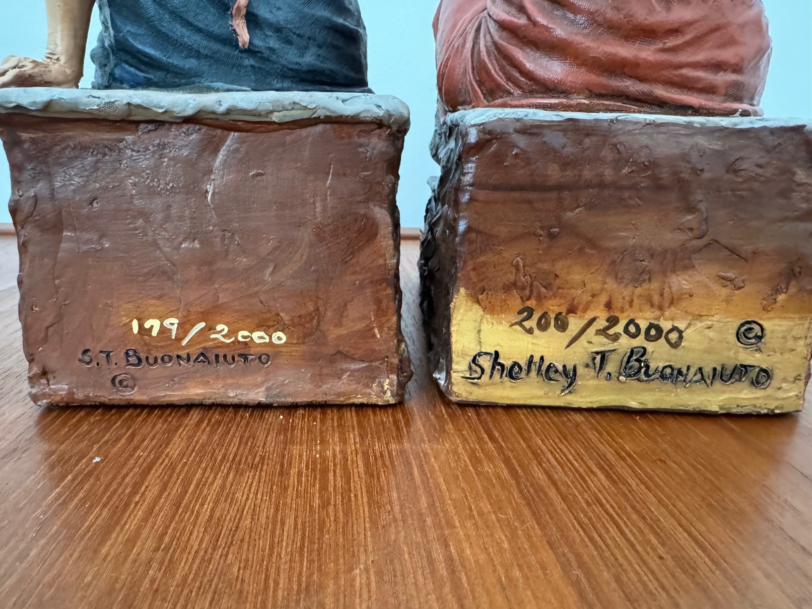 A little about the artists - Shelley and Michael Buonaiuto met while studying sculpture and painting at the University of Massachusetts in 1968. After a few vagabond years, their spiritual search led them to the study of Gurdjieff, a Greek Caucasian spiritual master, at Chardavogne Barn in New York - there Shelley began to study pottery, making creches and small figures. Sophie - Edition 179/2000 Millie - Edition 200/2000 Condition of both appear to be great. These can be used as book ends as well. https://alittlecompany.net/resin-sculpture/ https://www.studiosevenarts.com/a-little-company/sophie-on-step Retail - $215.00 a piece. Together $430.00