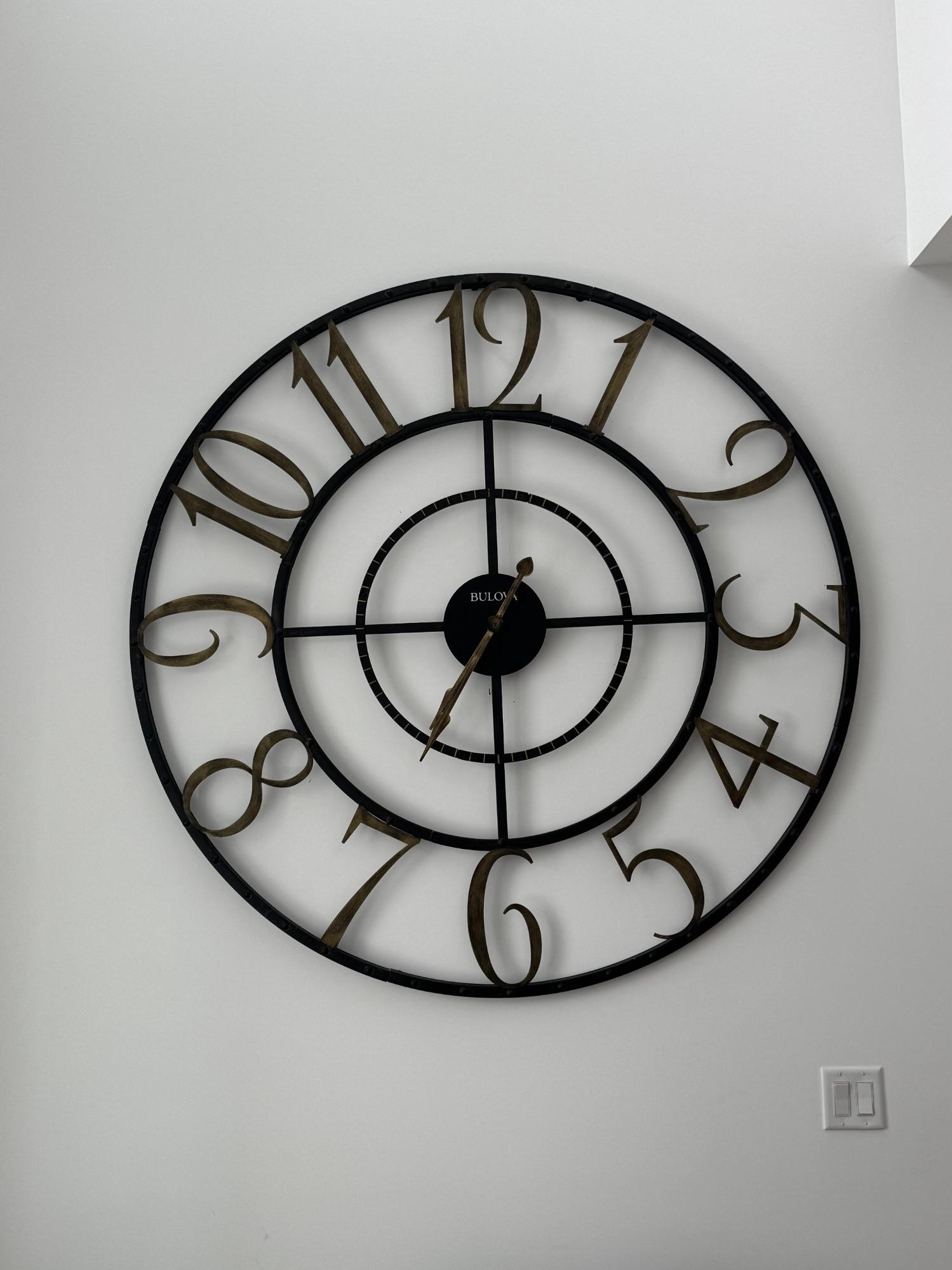 The aged metal case spans 5 feet (60") across! This oversized Gallery clock will be the focal point of any room it is placed in, the case is accented by antiqued gold numbers to add contrast. https://www.bulova.com/us/en/product/C4857.html?cgid=clocks Retail - $550.00