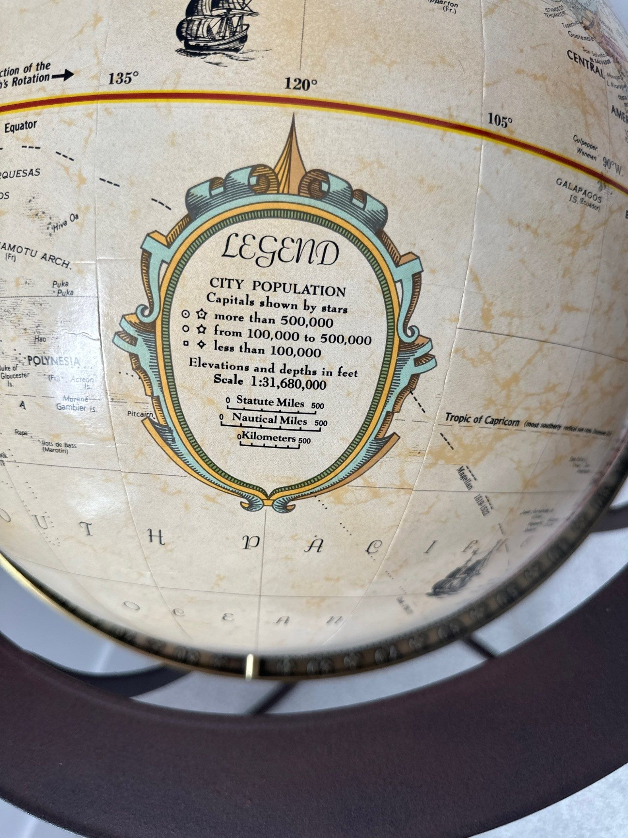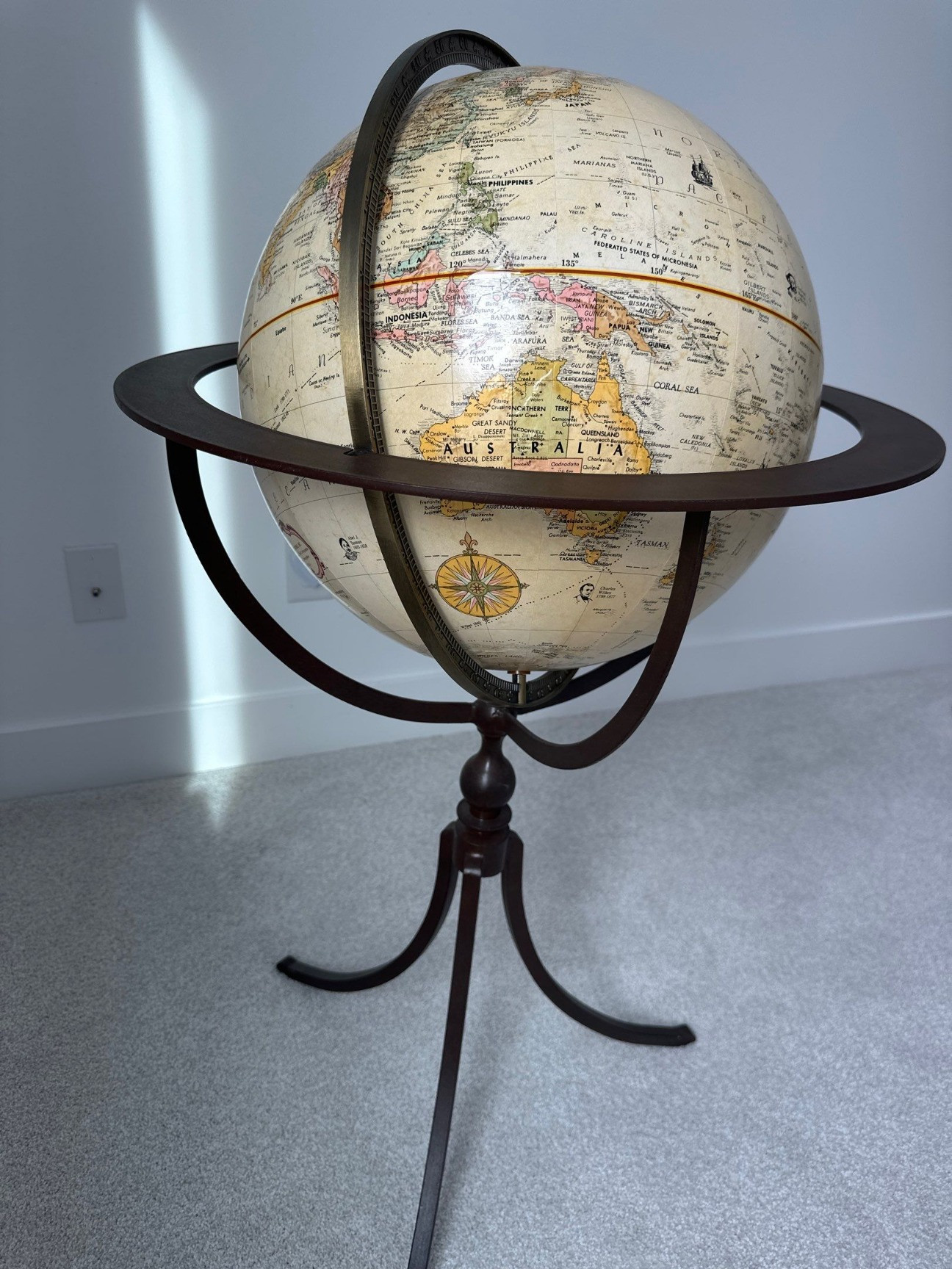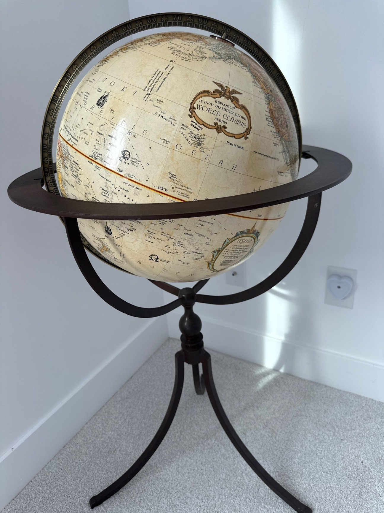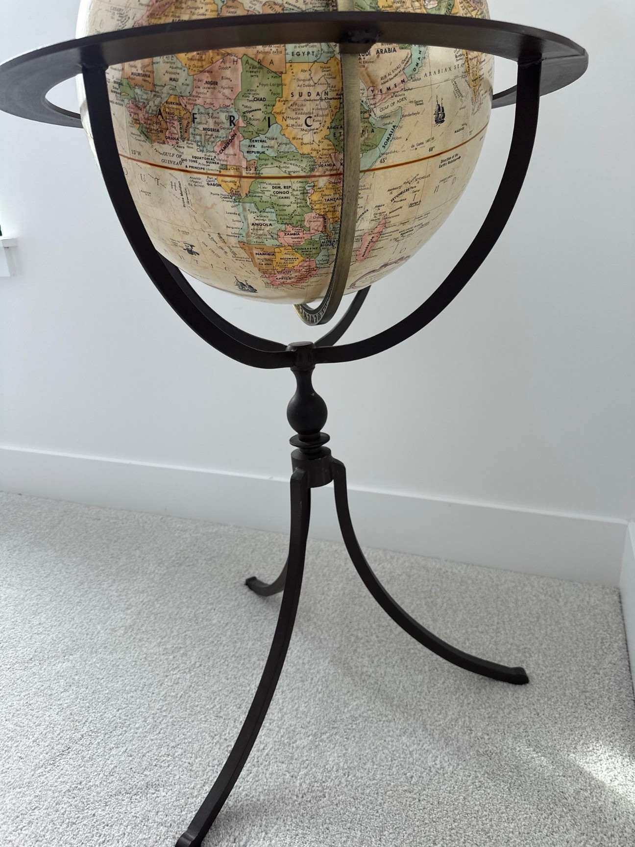 Handcrafted warmth from Replogle Globes. A contemporary interpretation of a classic design, the Marin is uniquely handcrafted from wrought iron with a rustic textured finish. The solid construction and high quality materials used ensure a lifetime of reliable service. Globe stand consisting of 3 legs assures stability even on imperfect surfaces. Subdued rustic metal finish of stand does not distract from the beautiful antique ocean globe ball used on this model. 16" Globe. Other dimensions listed are for the structure. https://www.1worldglobes.com/marin-floor-globe/ Retail - $600.00