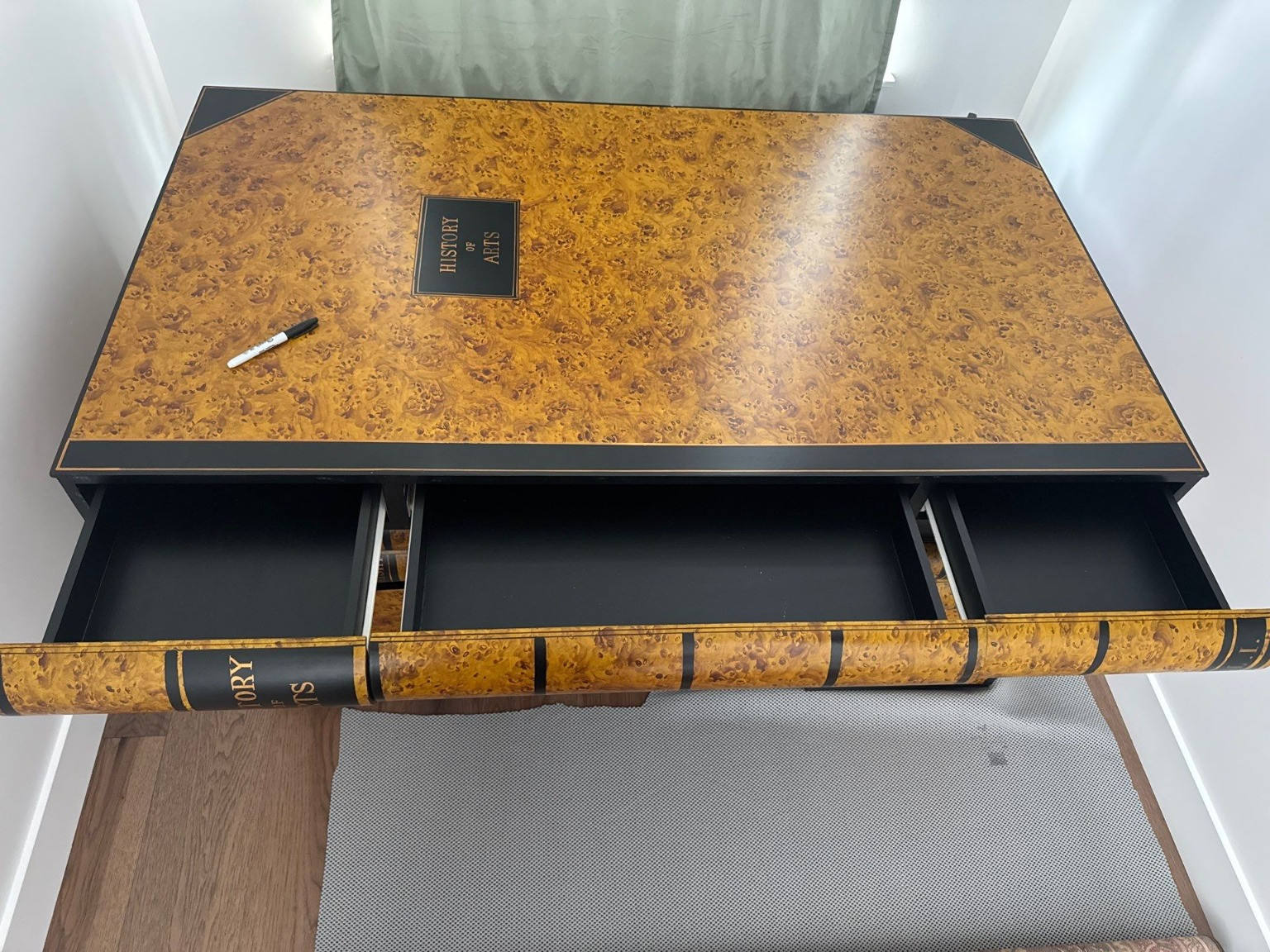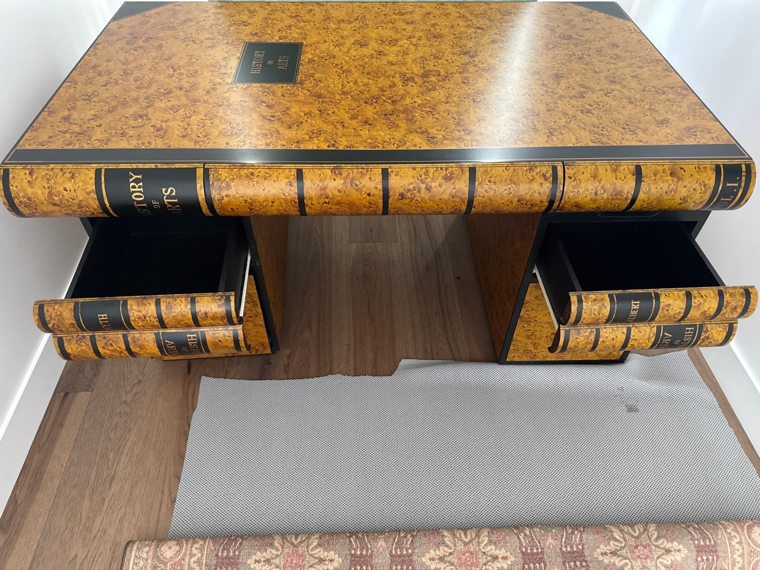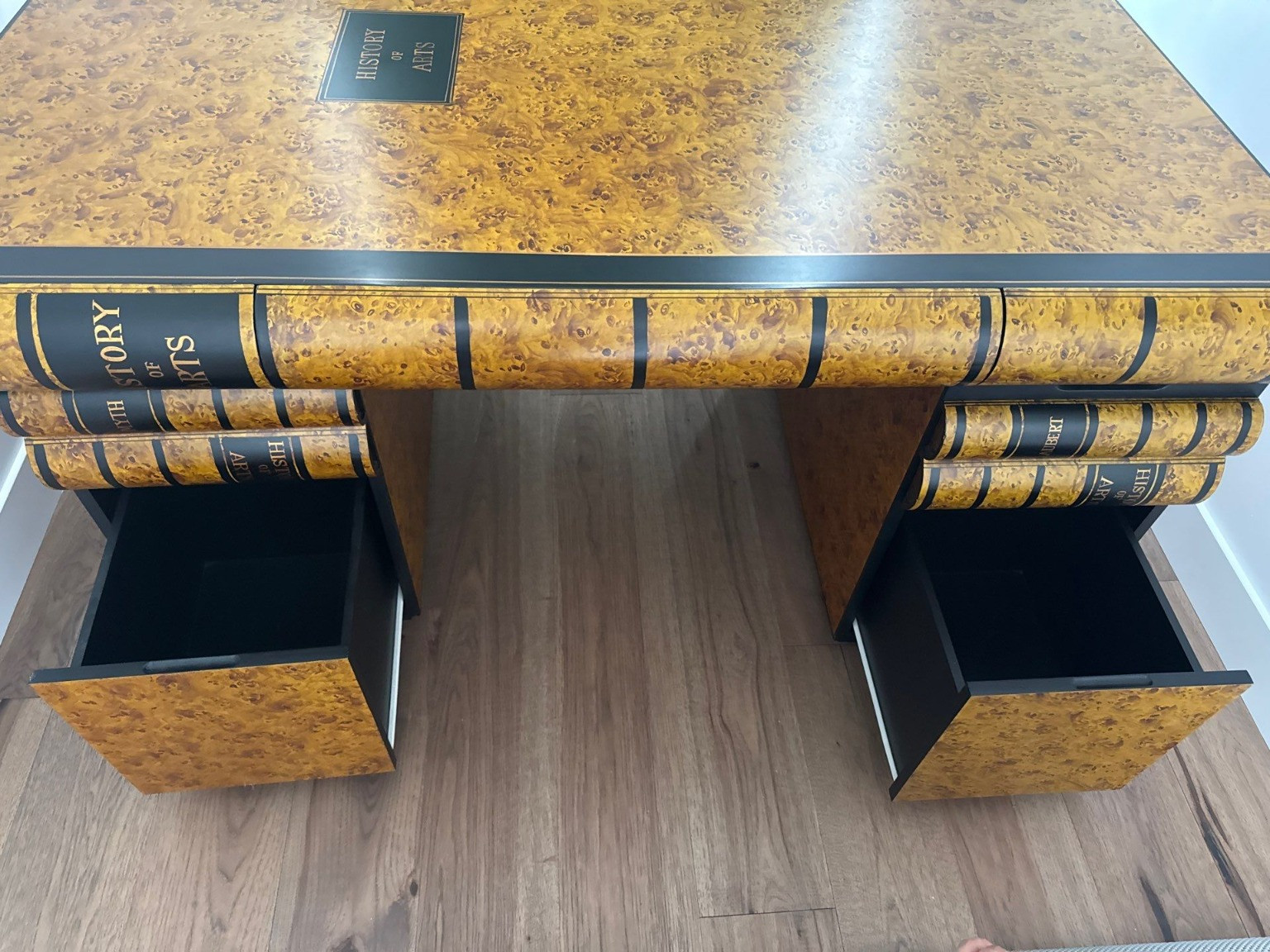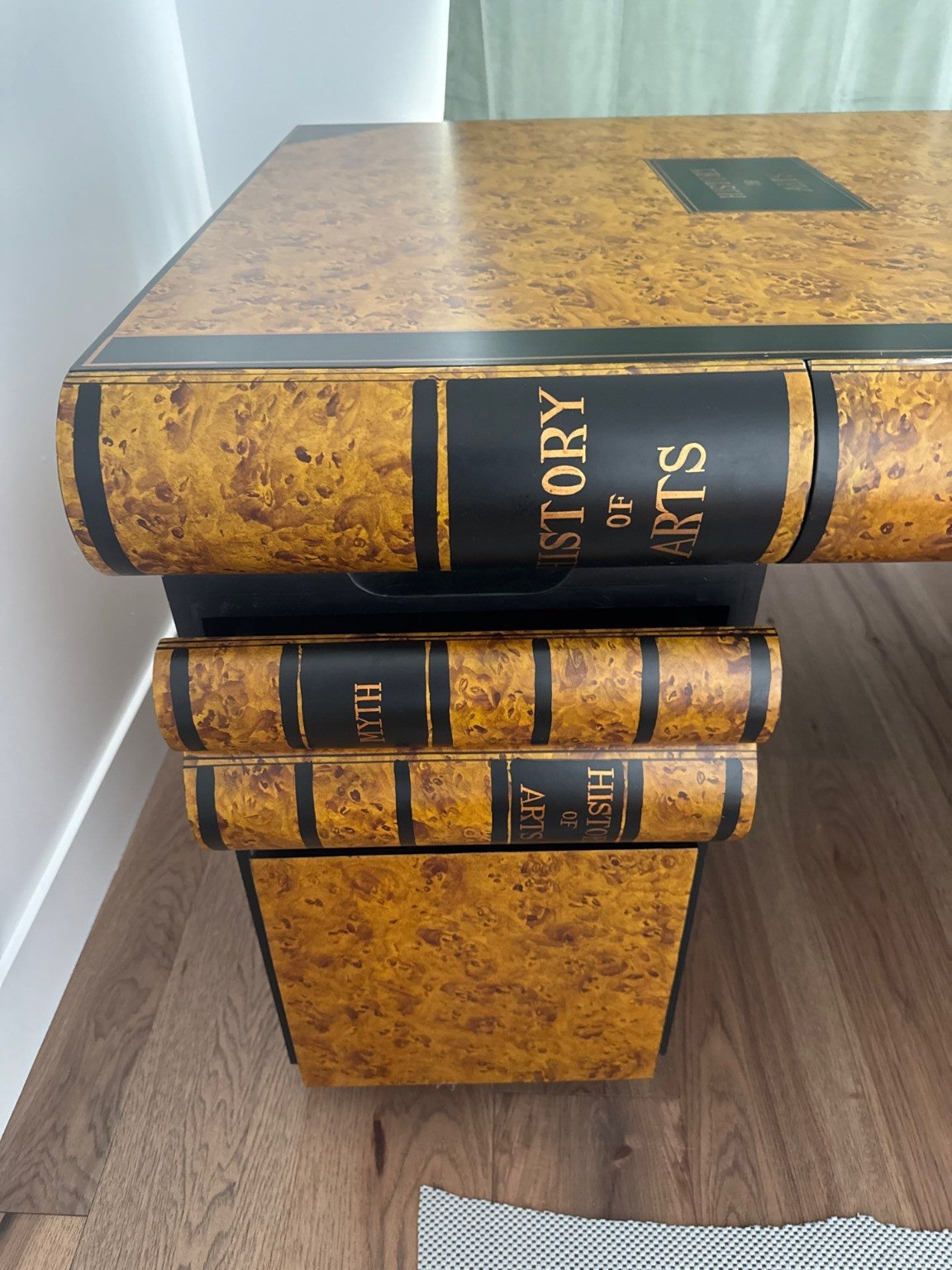 This is a unique book-themed writing desk designed to resemble a stack of antique books. The desk features intricate faux book detailing, including titles such as "History of Arts", giving it a vintage library or scholarly aesthetic. The burl wood veneer finish adds a touch of elegance, and the drawers are cleverly integrated into the "book spines," making for a functional yet decorative furniture piece. Back side also opens up for storage.