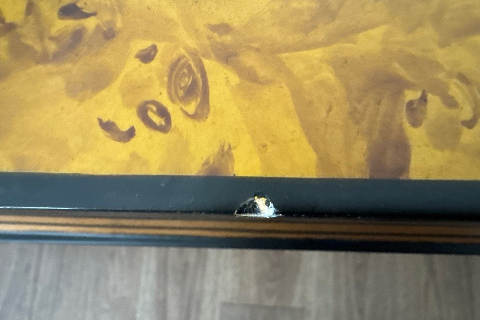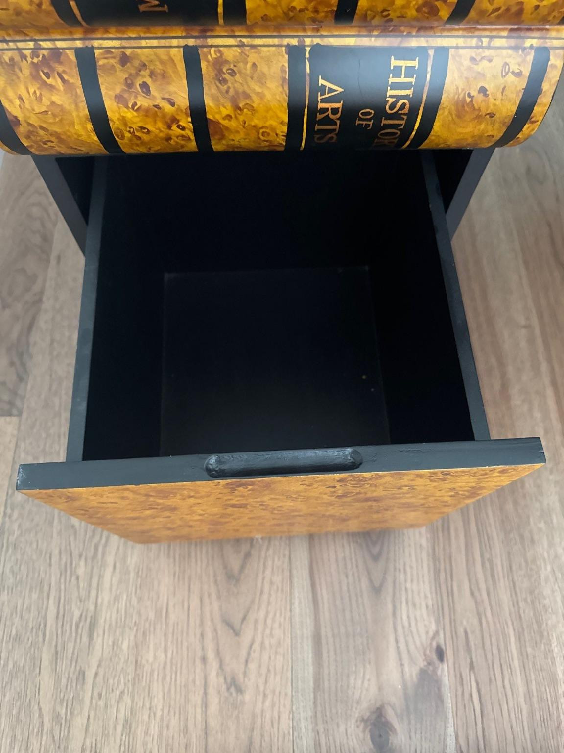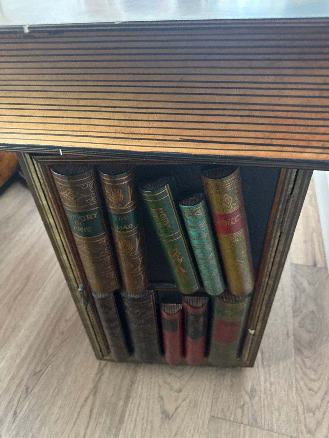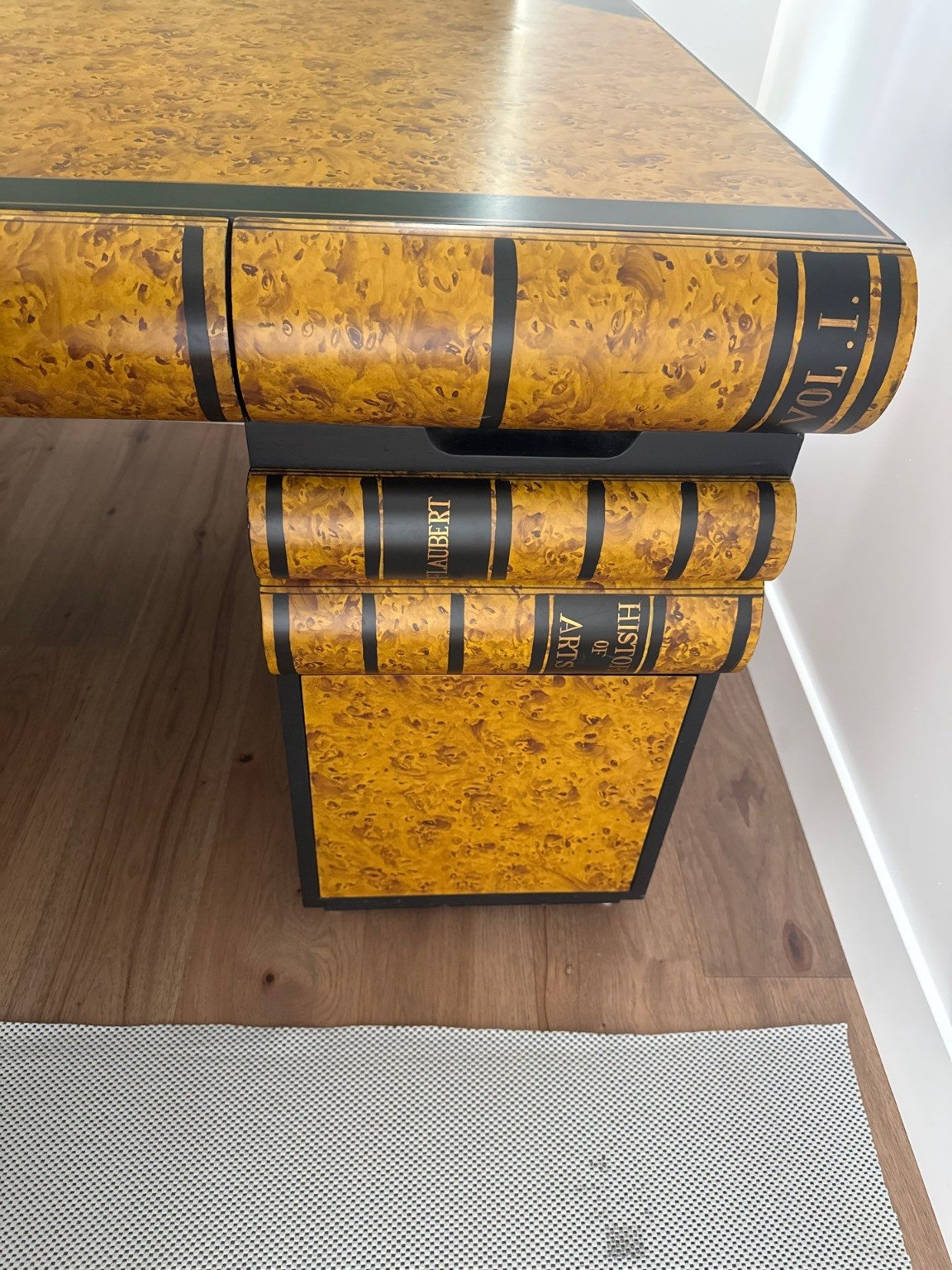 This is a unique book-themed writing desk designed to resemble a stack of antique books. The desk features intricate faux book detailing, including titles such as "History of Arts", giving it a vintage library or scholarly aesthetic. The burl wood veneer finish adds a touch of elegance, and the drawers are cleverly integrated into the "book spines," making for a functional yet decorative furniture piece. Back side also opens up for storage.