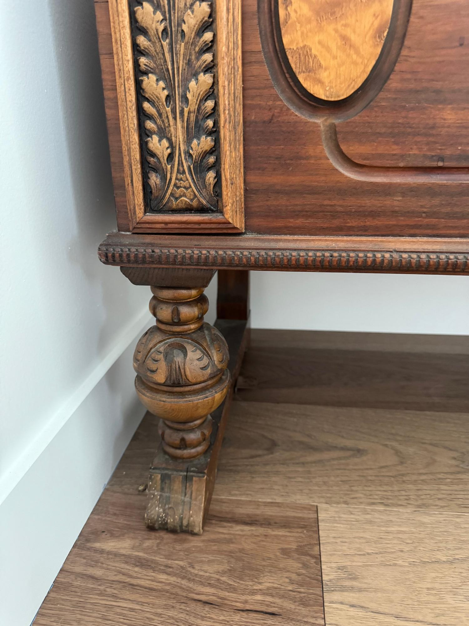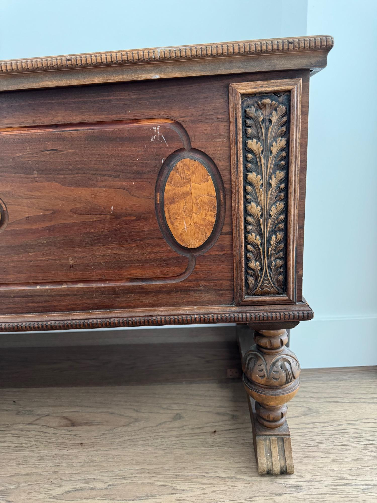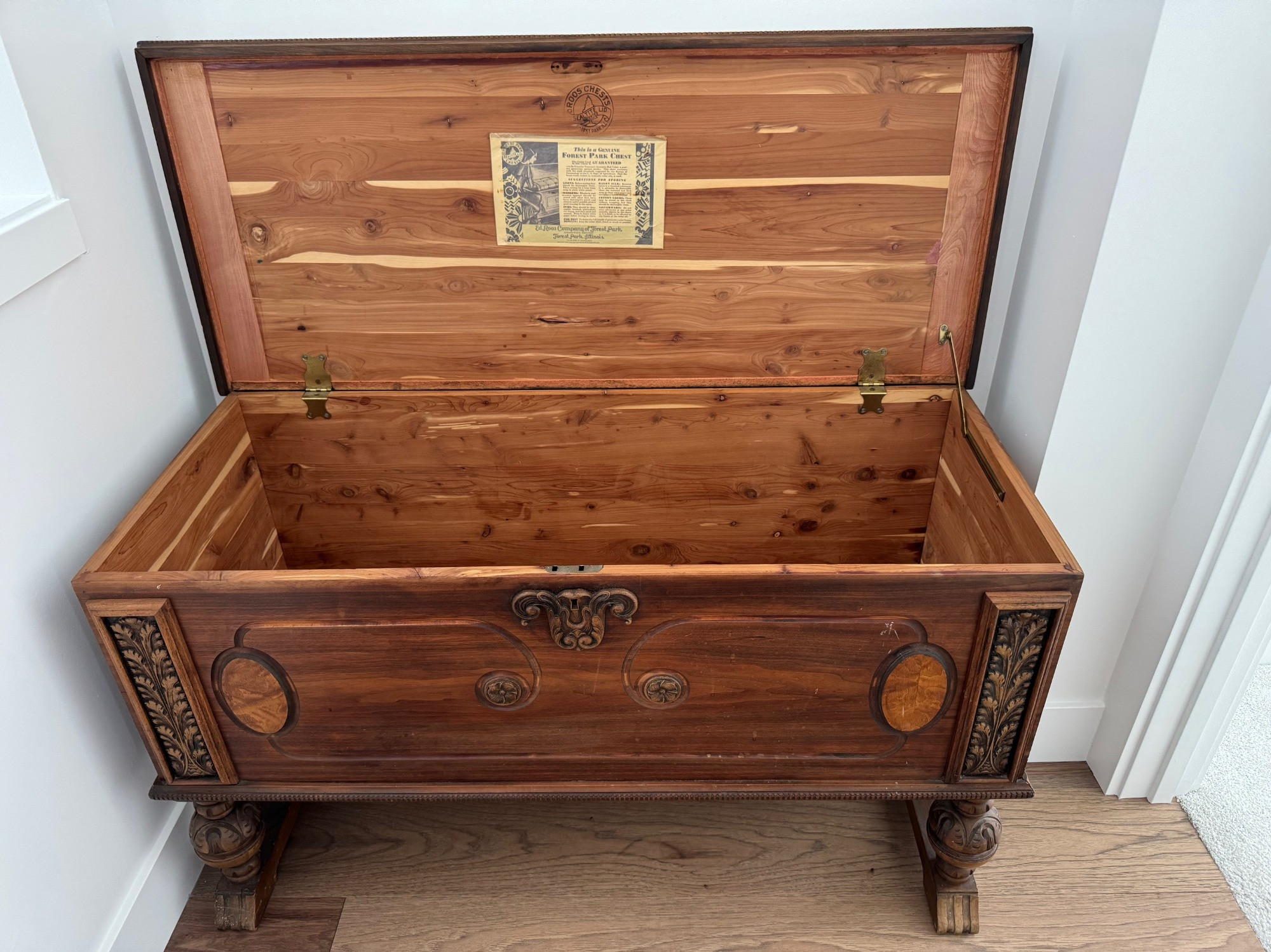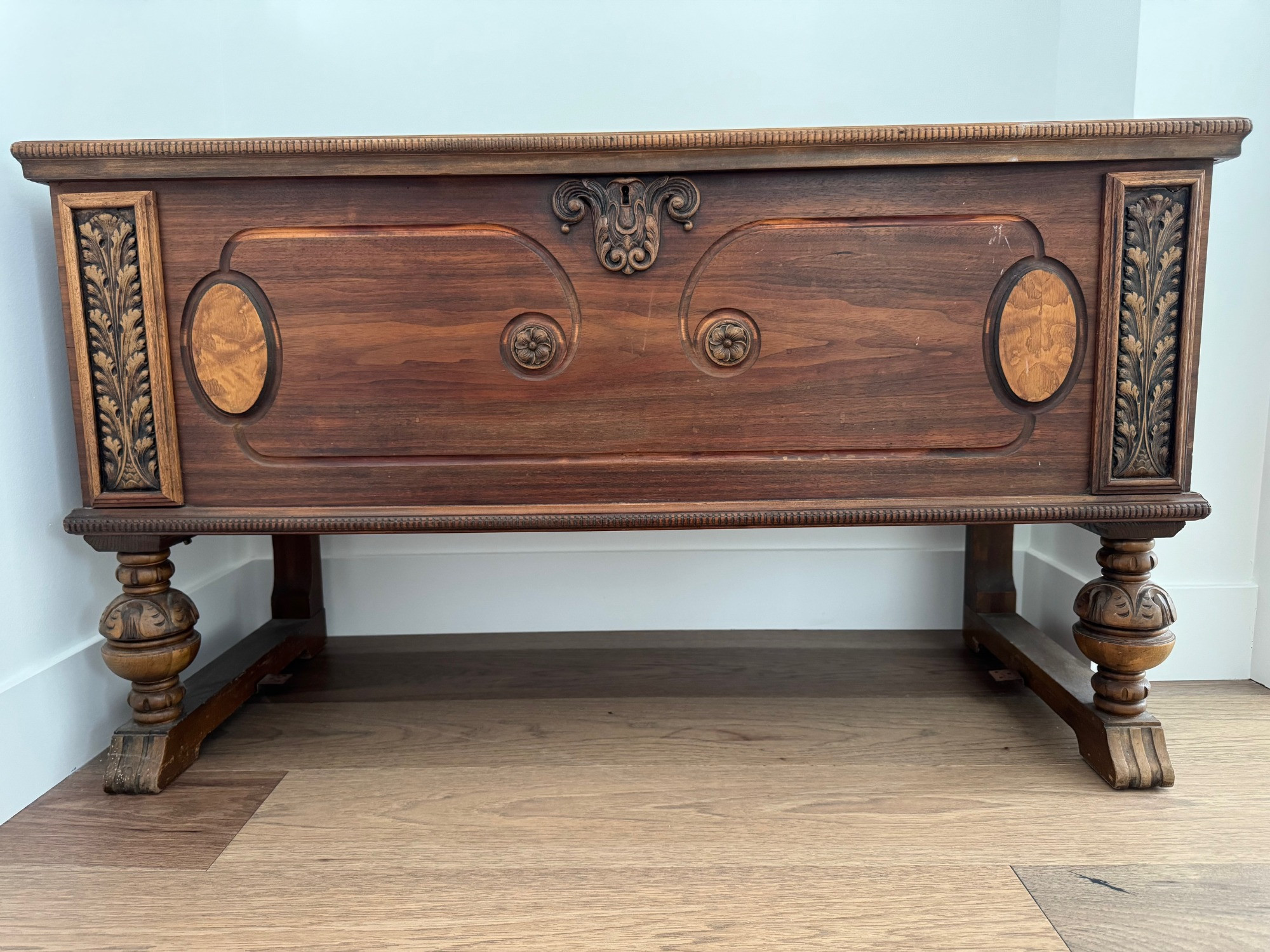 The Ed Roos Company of Forest Park, Illinois, was a prominent furniture manufacturer specializing in cedar chests during the early to mid-20th century. Founded in 1918 by Edward Roos, the company quickly became a significant player in the industry. Design: Raised on four turned legs with stretchers, adorned with carved motifs, reflecting the English Tudor style. The Ed Roos Company operated until 1951, leaving behind a legacy of quality furniture. Their cedar chests are now considered vintage collectibles, appreciated for their historical significance and enduring craftsmanship. See photos of some vintage wear. Overall chest is in good condition. Does not have the key.