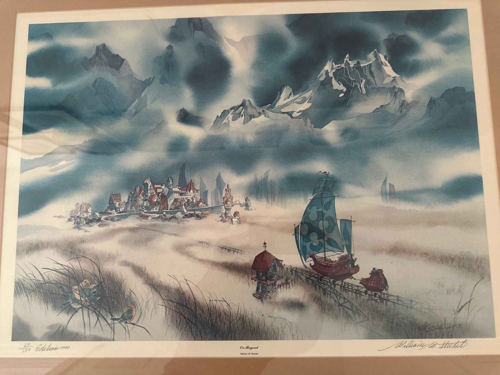 William Steidel, a renowned artist based in Cannon Beach, Oregon, is celebrated for his whimsical and fantastical artworks that often draw inspiration from the coastal landscapes and local events. Over the past five decades, he has contributed numerous original pieces to the Cannon Beach Sandcastle Contest and, in 2019, his "Cannon Beach Lamplighter" artwork was adopted to represent Haystack Holidays. "On Beyond" is a limited edition lithograph (Number 27/150) by Steidel.