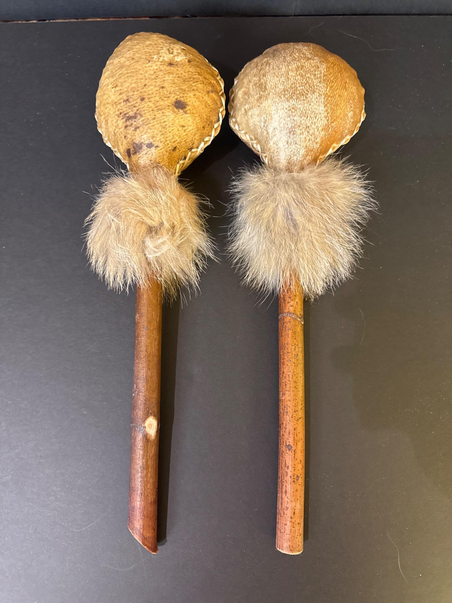 Rattles have been used historically to keep rhythm during ceremony. They create an entrancing sound, that Native people have known to affect our bodies and mind. The rattle as a whole is made to represent the plant kingdom (the wooden handle), the animal kingdom (the hide) and the earth kingdom (the fill). It can help us focus inward and move energy within us, helping to unblock stopped up energy or direct energy for specific purposes. Even if you just sit and shake the rattle, the noise of the rattle will help to ease your mind and will take you into a more centered and relaxed emotional place. Native American-style ceremonial rattles, traditionally used in cultural and spiritual practices. Here are some key details: The rattle heads are likely made from stretched and dried rawhide or animal bladder filled with small stones, seeds, or beads to produce sound. The edges are hand-stitched with sinew or leather lace. Retail - $69.00 - $79.00 ea. https://sunreed.com/bear-buffalo-moose-and-elk-medicine-rattles/