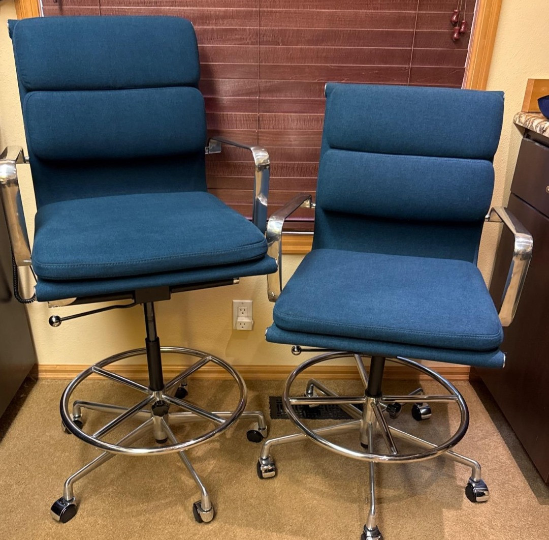 from Laura. Retail - $599.00 ea. https://lauradavidsondirect.com/products/soho-soft-pad-drafting-chair-dark-blue-fabric Dimensions are approximate.
