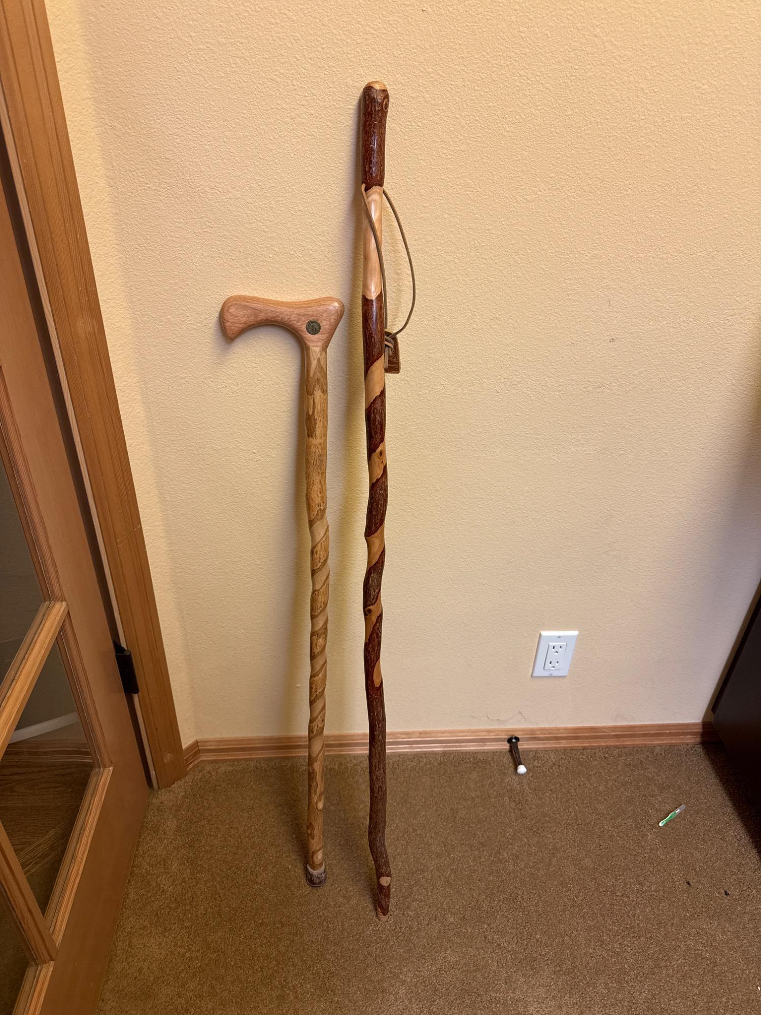 Walk confidently through your favorite trails, or scenic neighborhood streets with Brazos #1 all-time best selling stick. This work of art is handcrafted from a single piece of hickory, making it far superior to other trekking poles and canes in simplicity, strength, and visual majesty. Having this indestructible walking stick in your hand will give you peace of mind, knowing that you're fully equipped to brave the trail before you, no matter where your feet may roam. https://www.brazos-walking-sticks.com/products/twisted-hickory-walking-stick Size 48” The Cane can be found on the website below. https://www.brazos-walking-sticks.com/collections/canes 37”