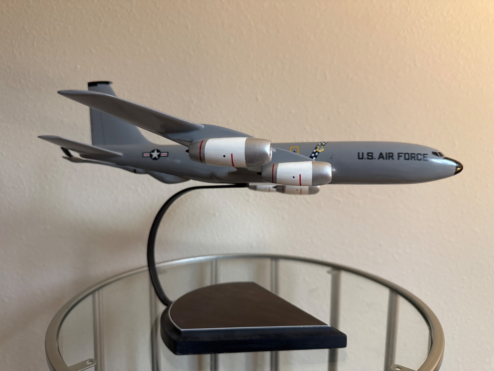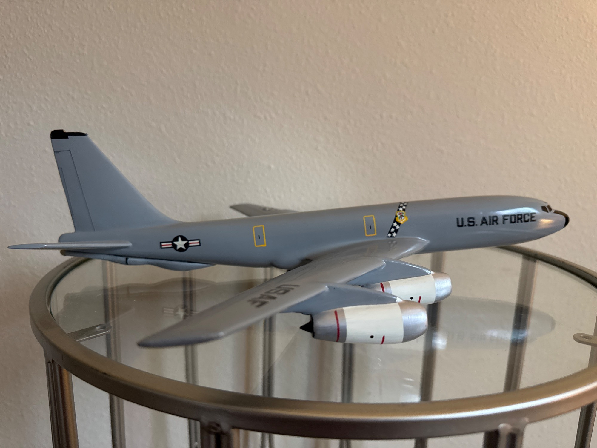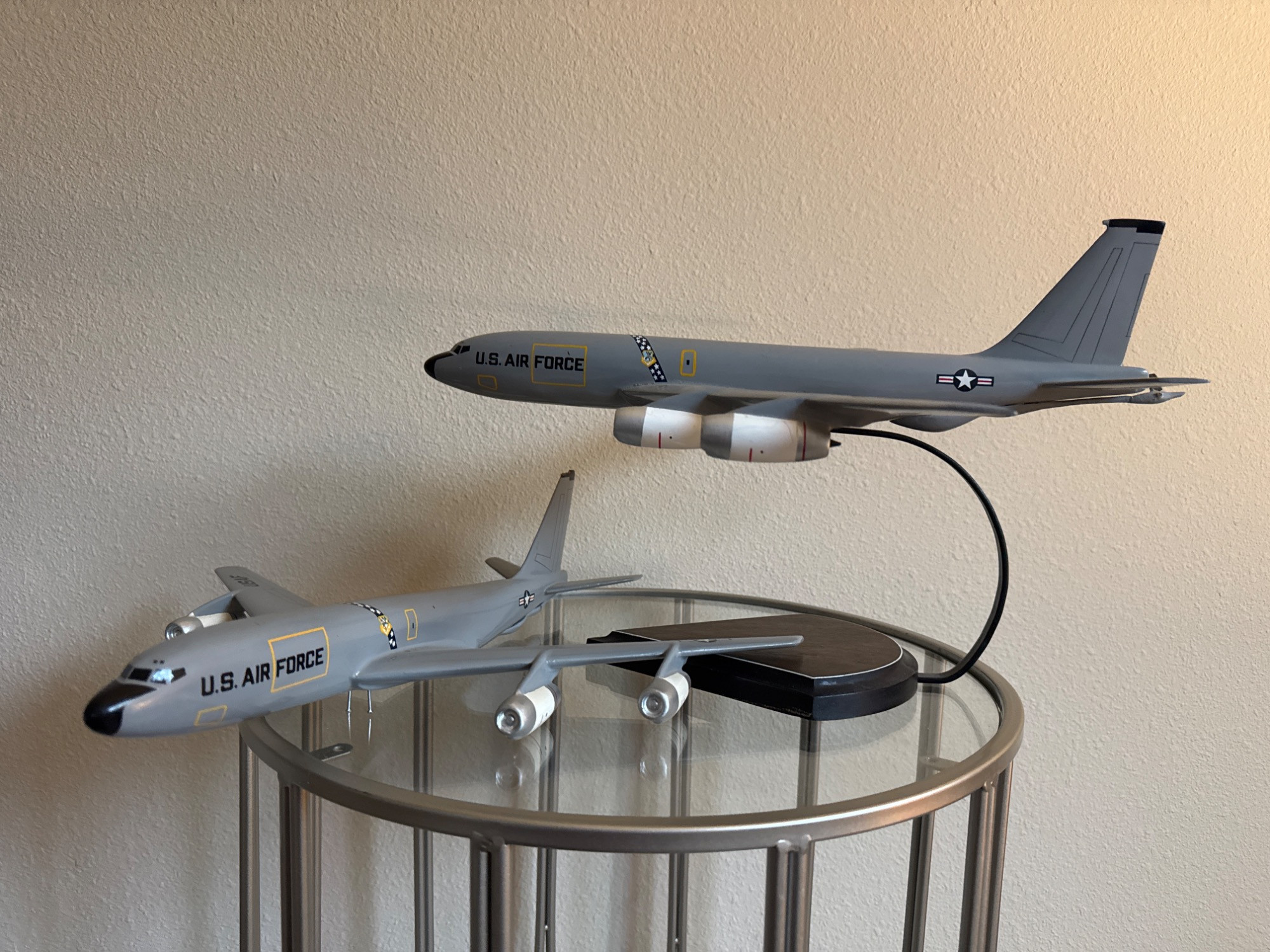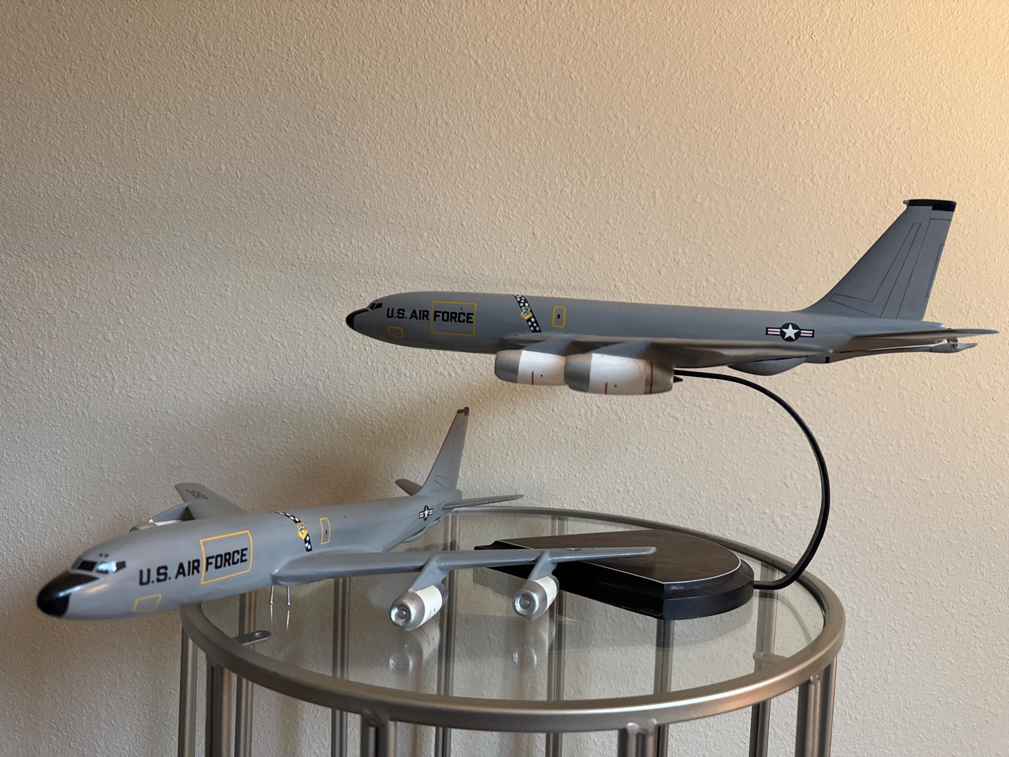 These are models of U.S. Air Force KC-135 Stratotankers, a military aerial refueling aircraft. These are displayed on stands, giving them a dynamic in-flight appearance. One has minor damage - See picture