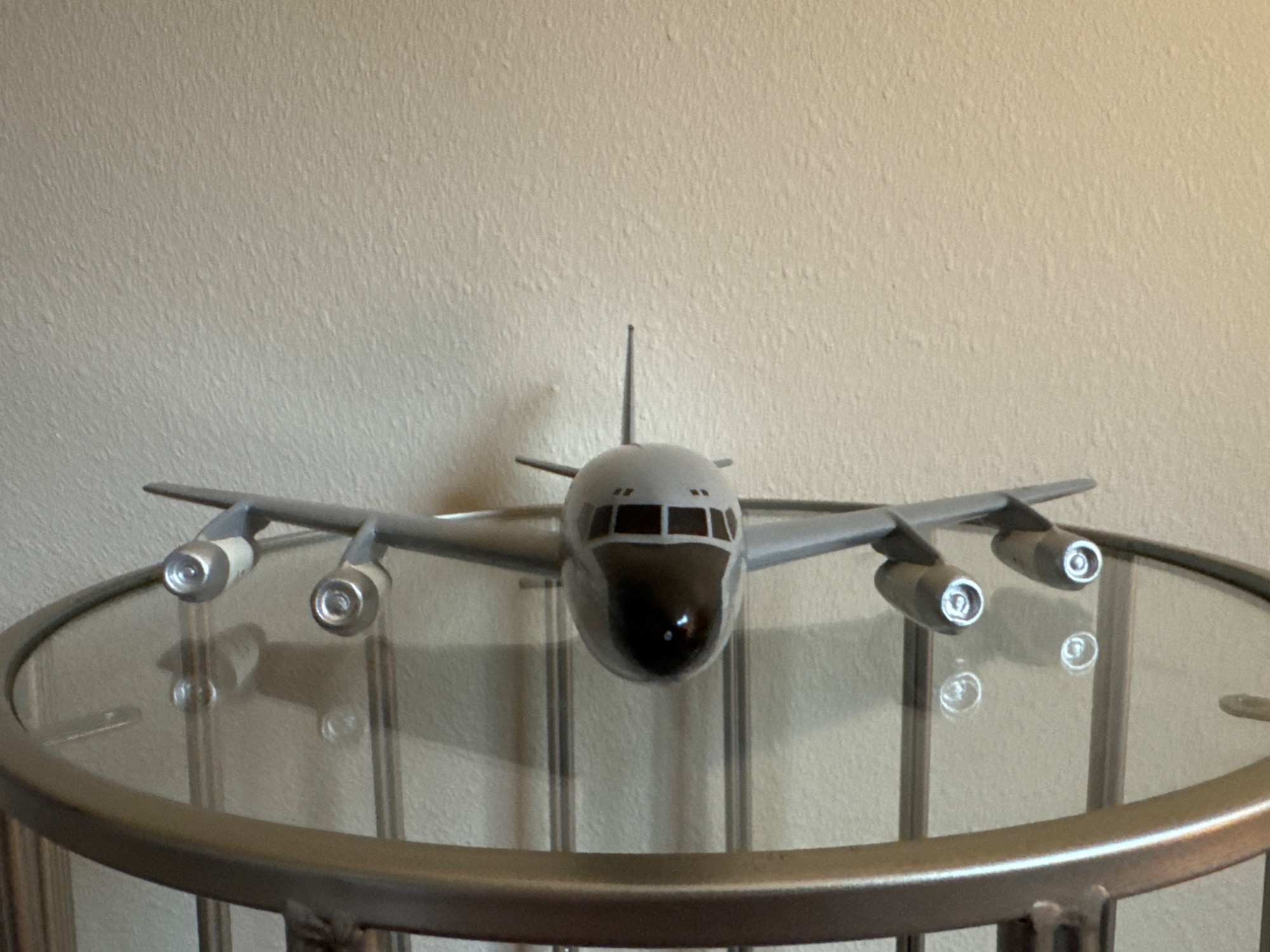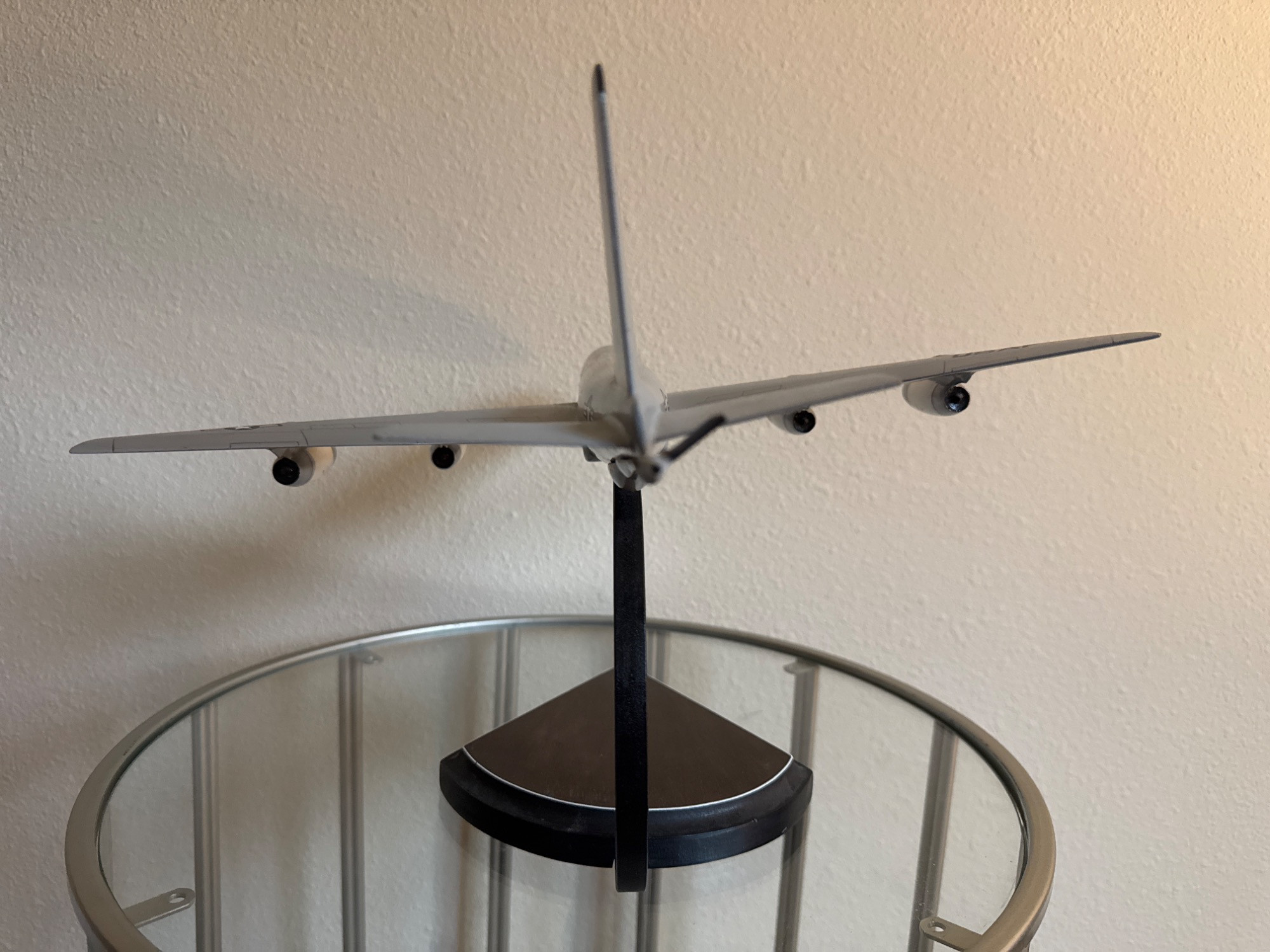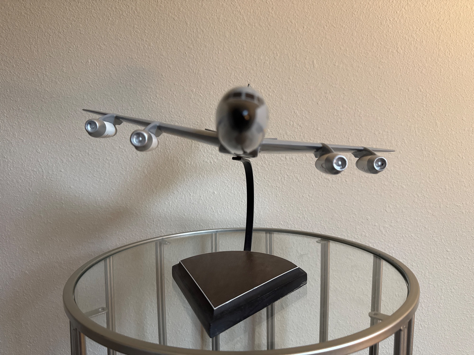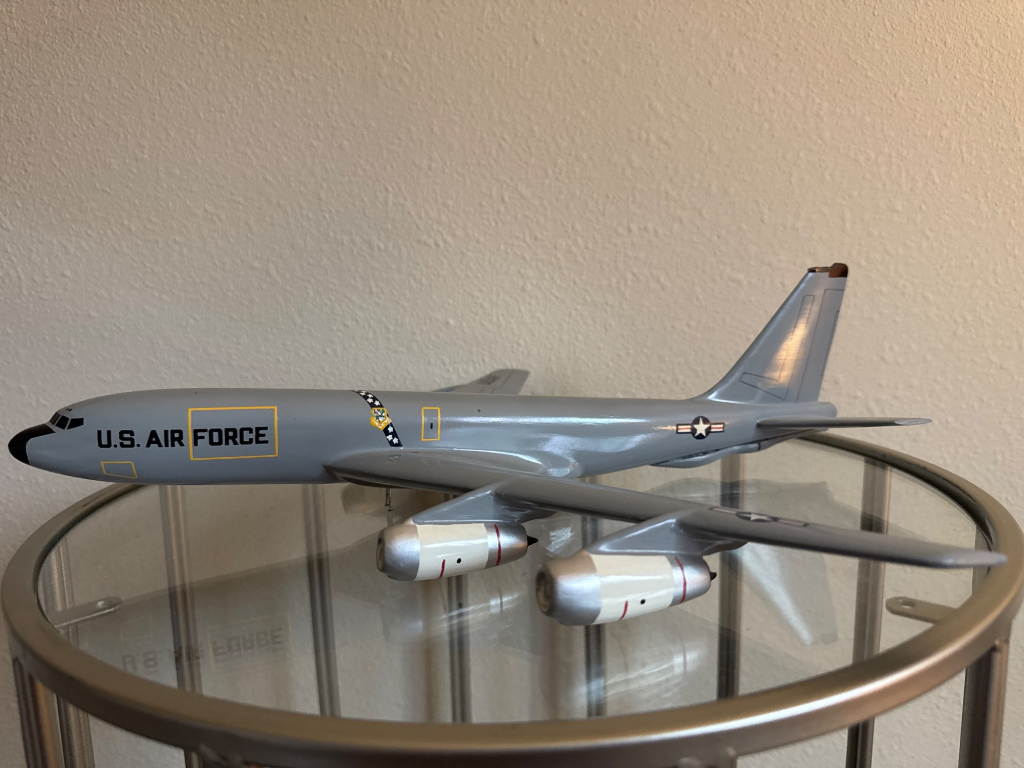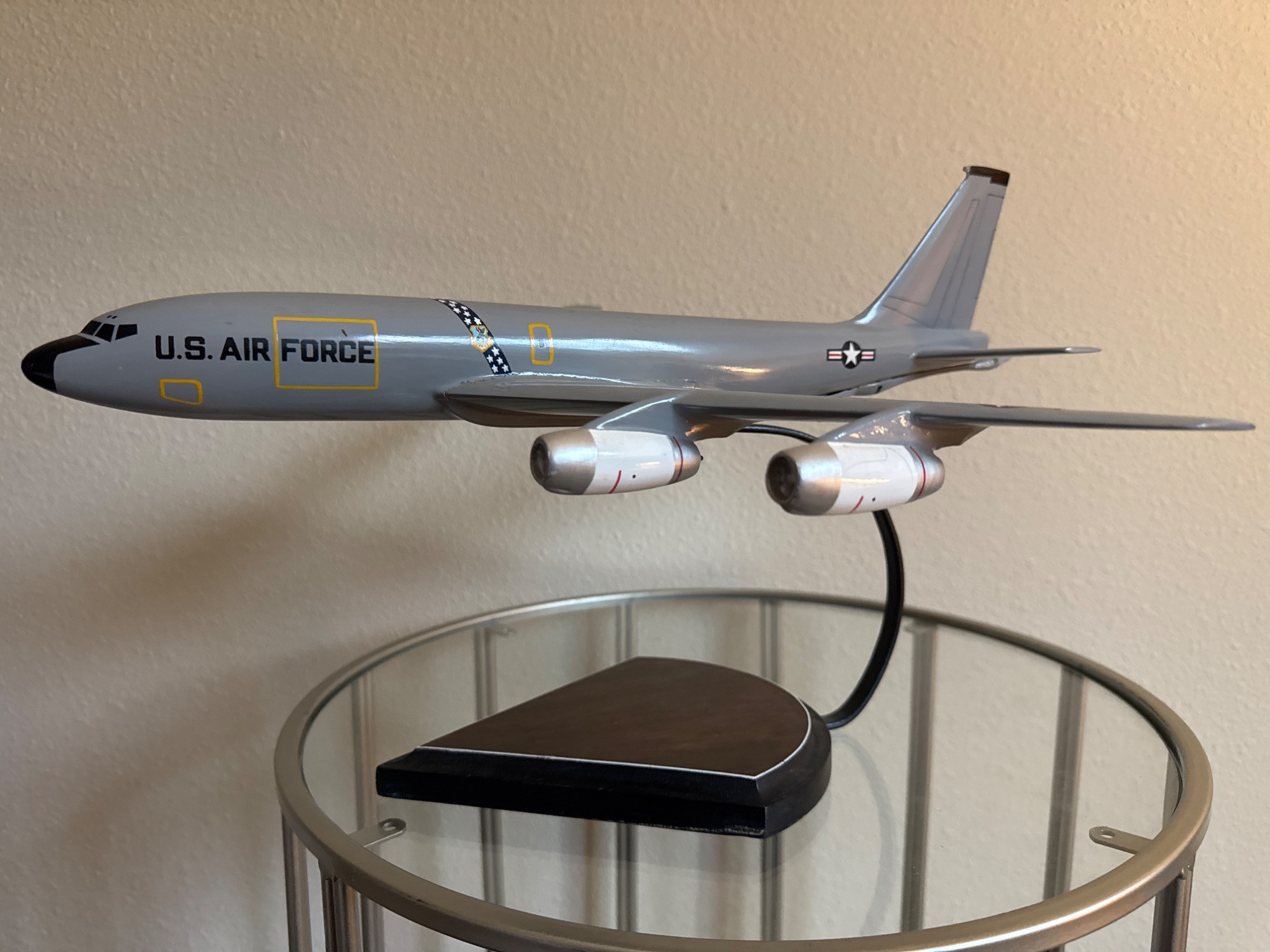 These are models of U.S. Air Force KC-135 Stratotankers, a military aerial refueling aircraft. These are displayed on stands, giving them a dynamic in-flight appearance. One has minor damage - See picture