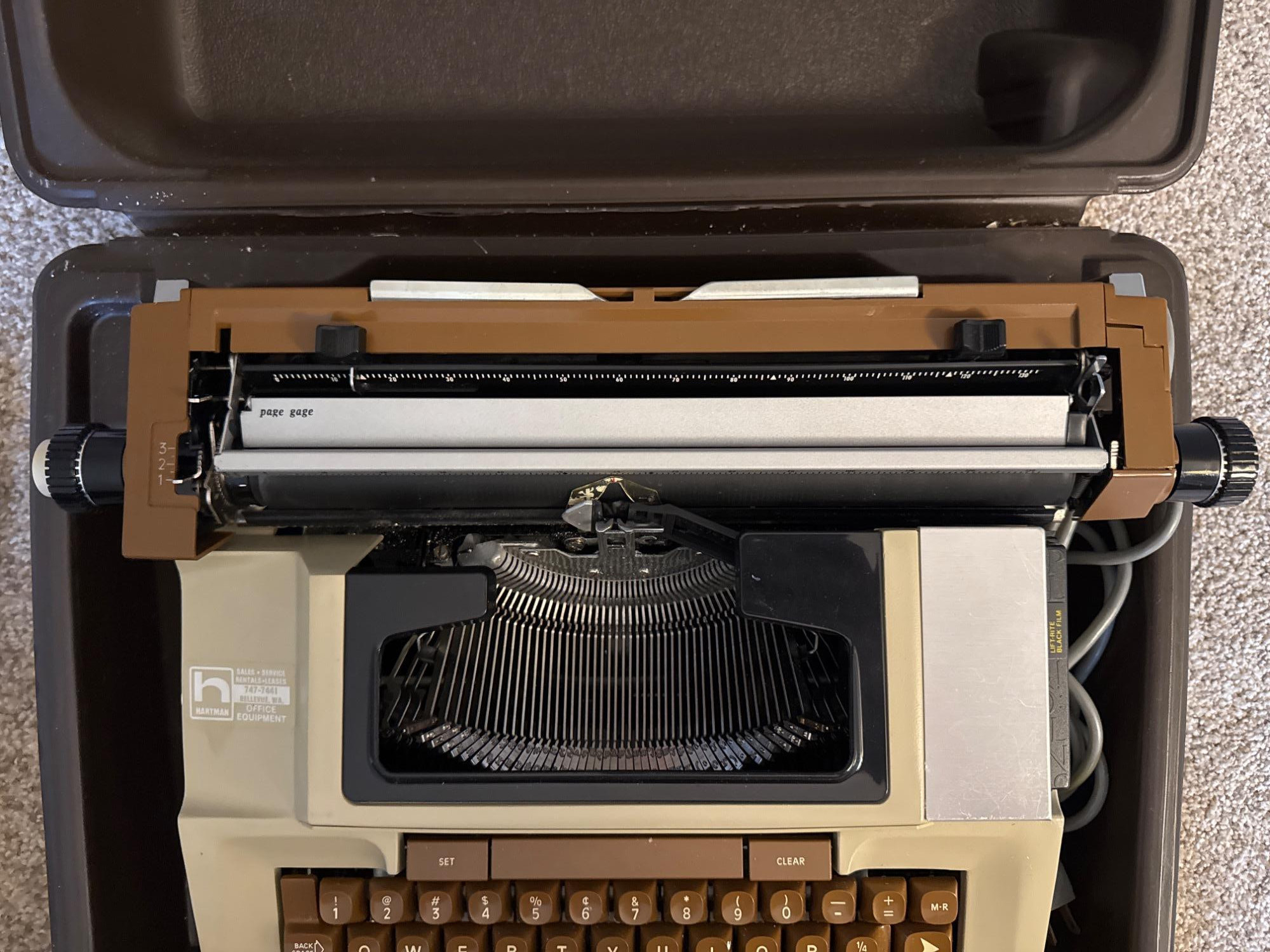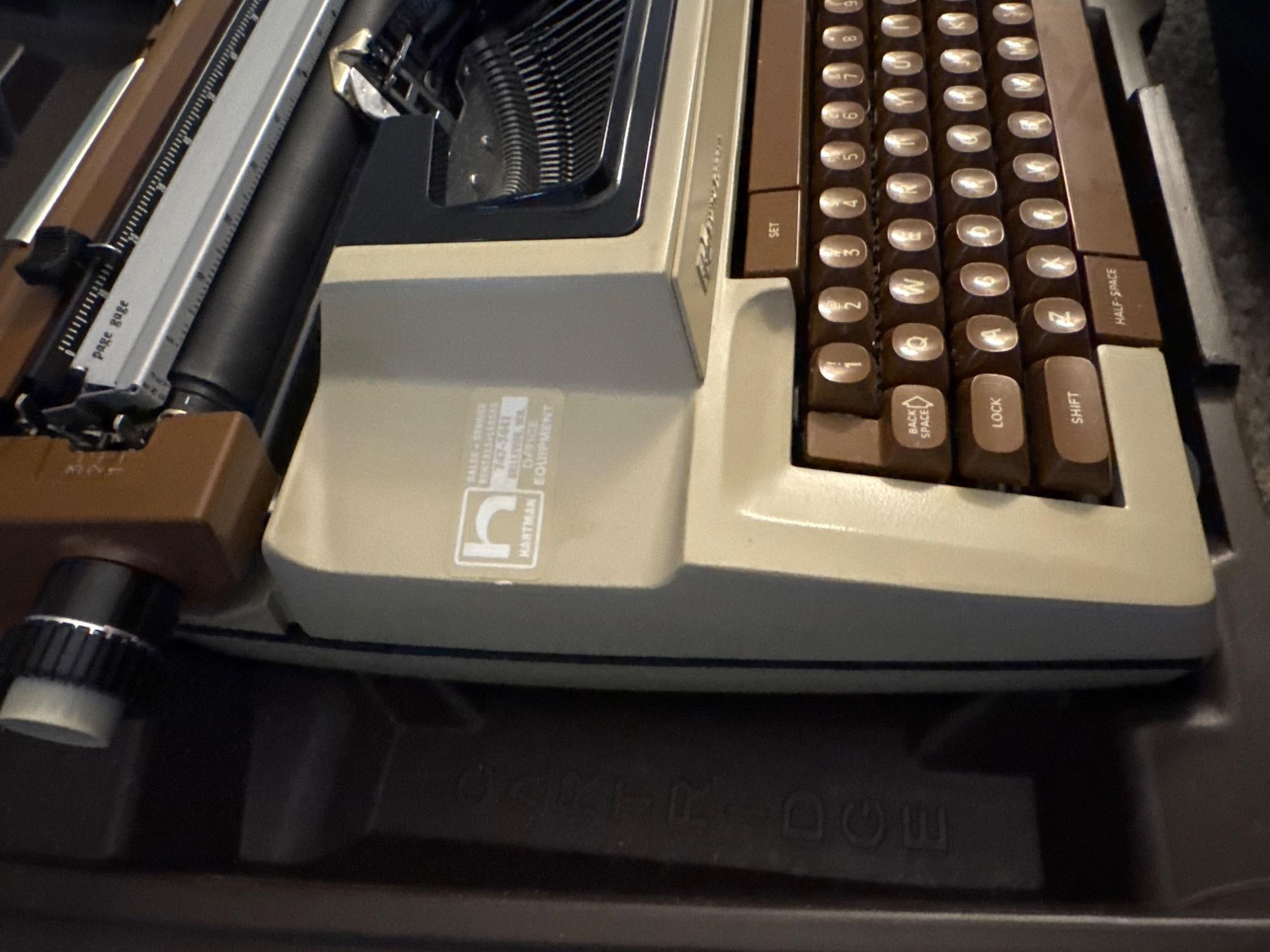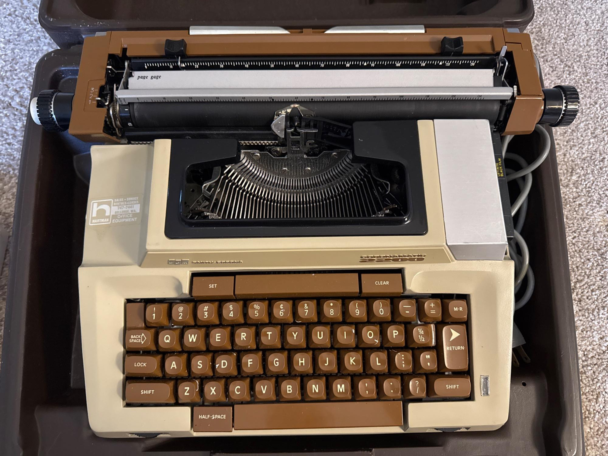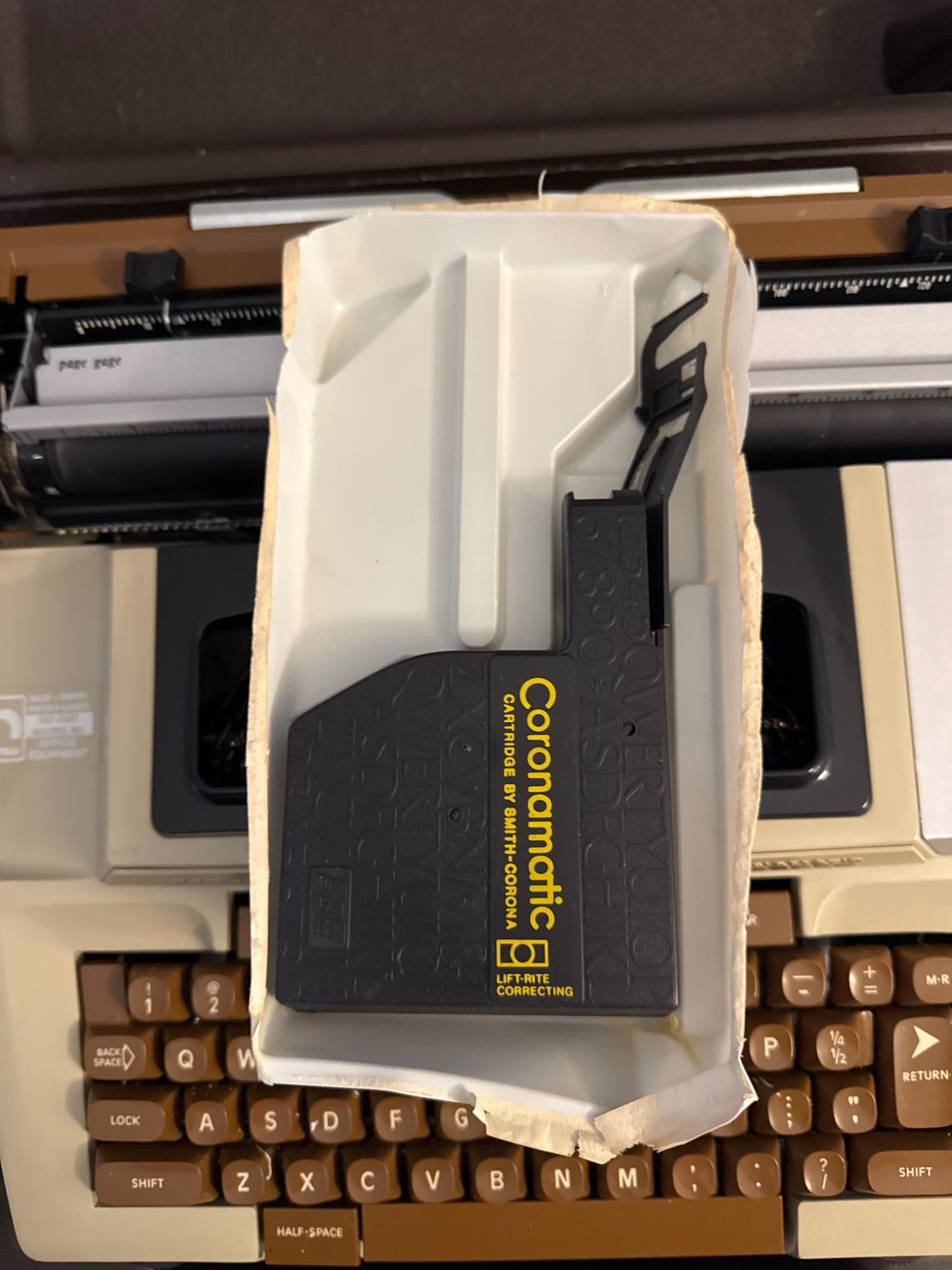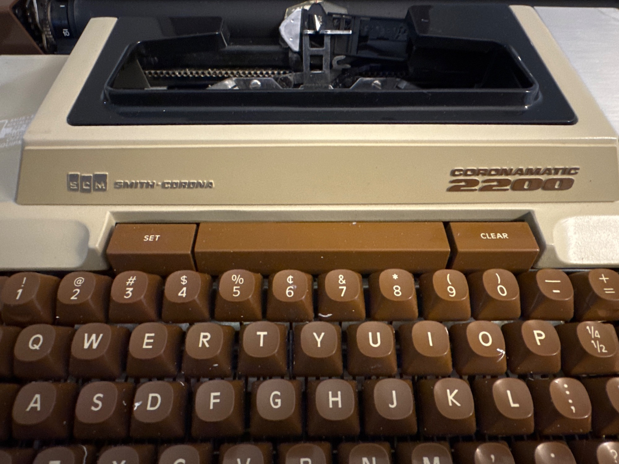 The Smith-Corona Coronamatic 2200 is an electric typewriter from the 1970s, known for its Coronamatic cartridge system, which made ribbon changes easier compared to traditional spools. Typewriter turns on but has not been tested.