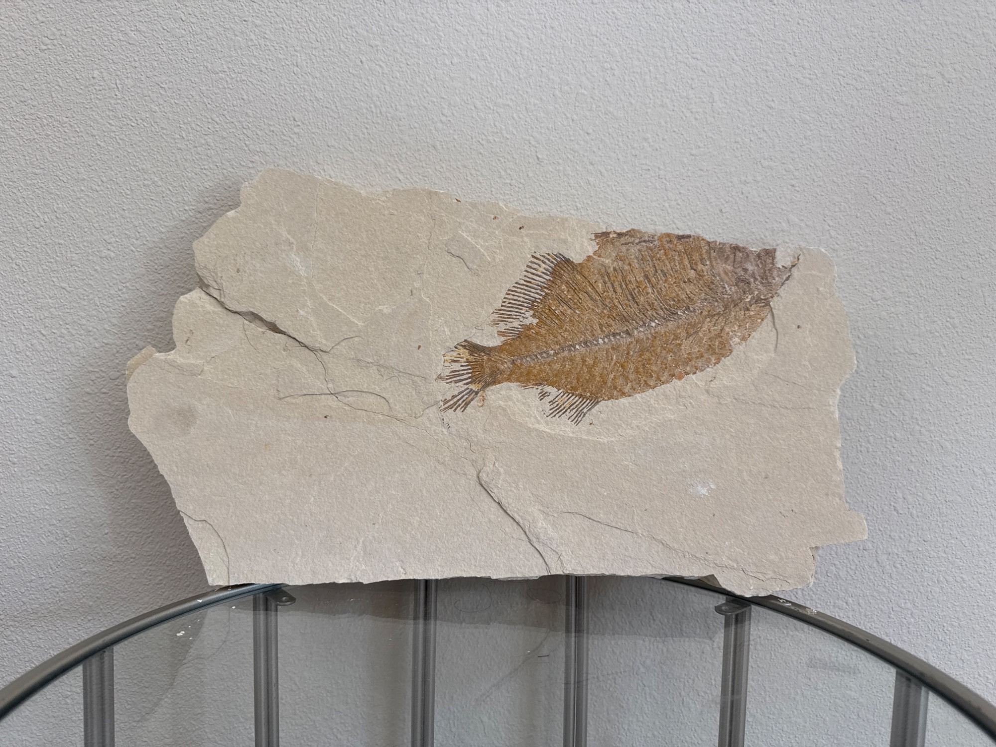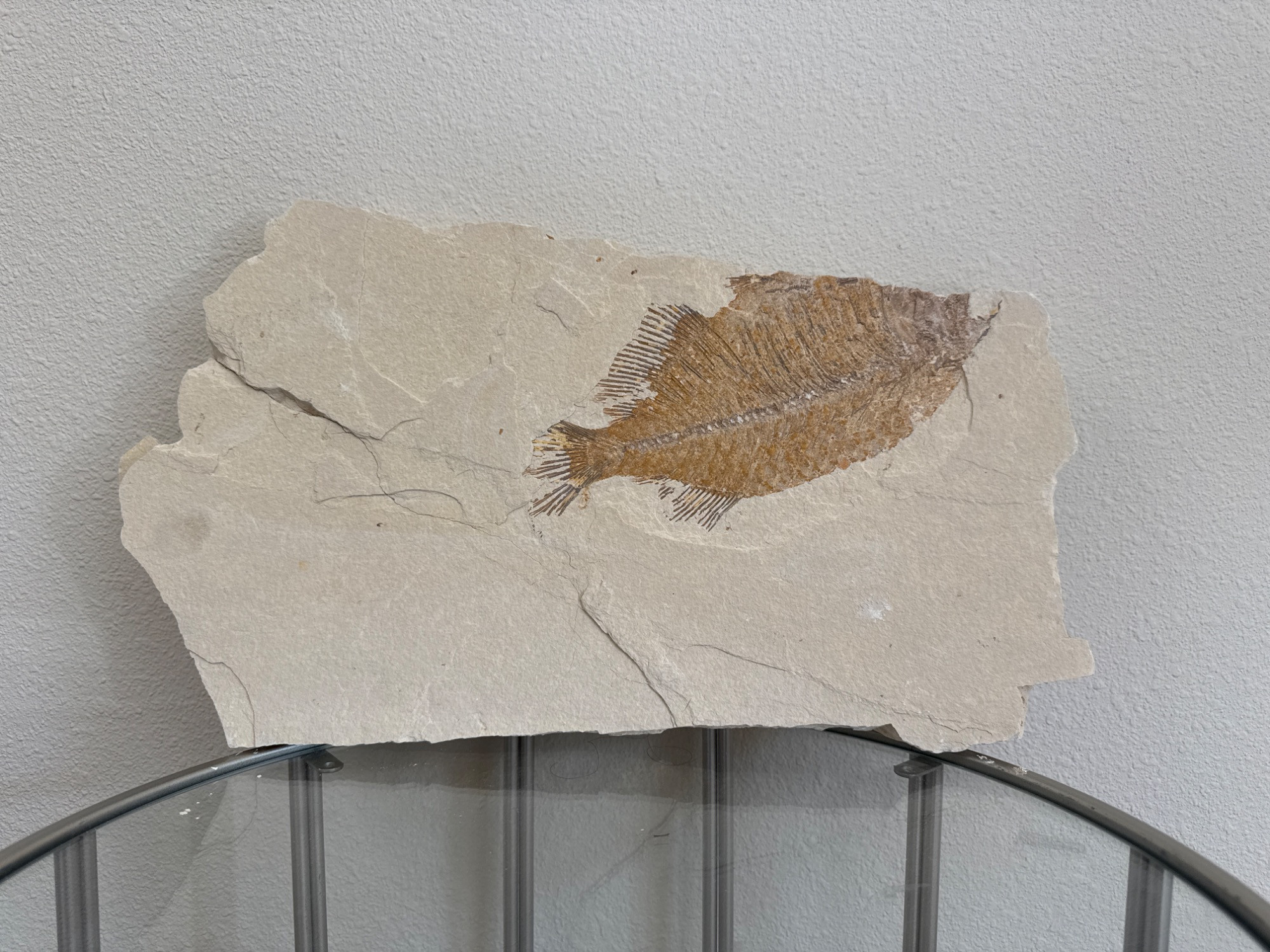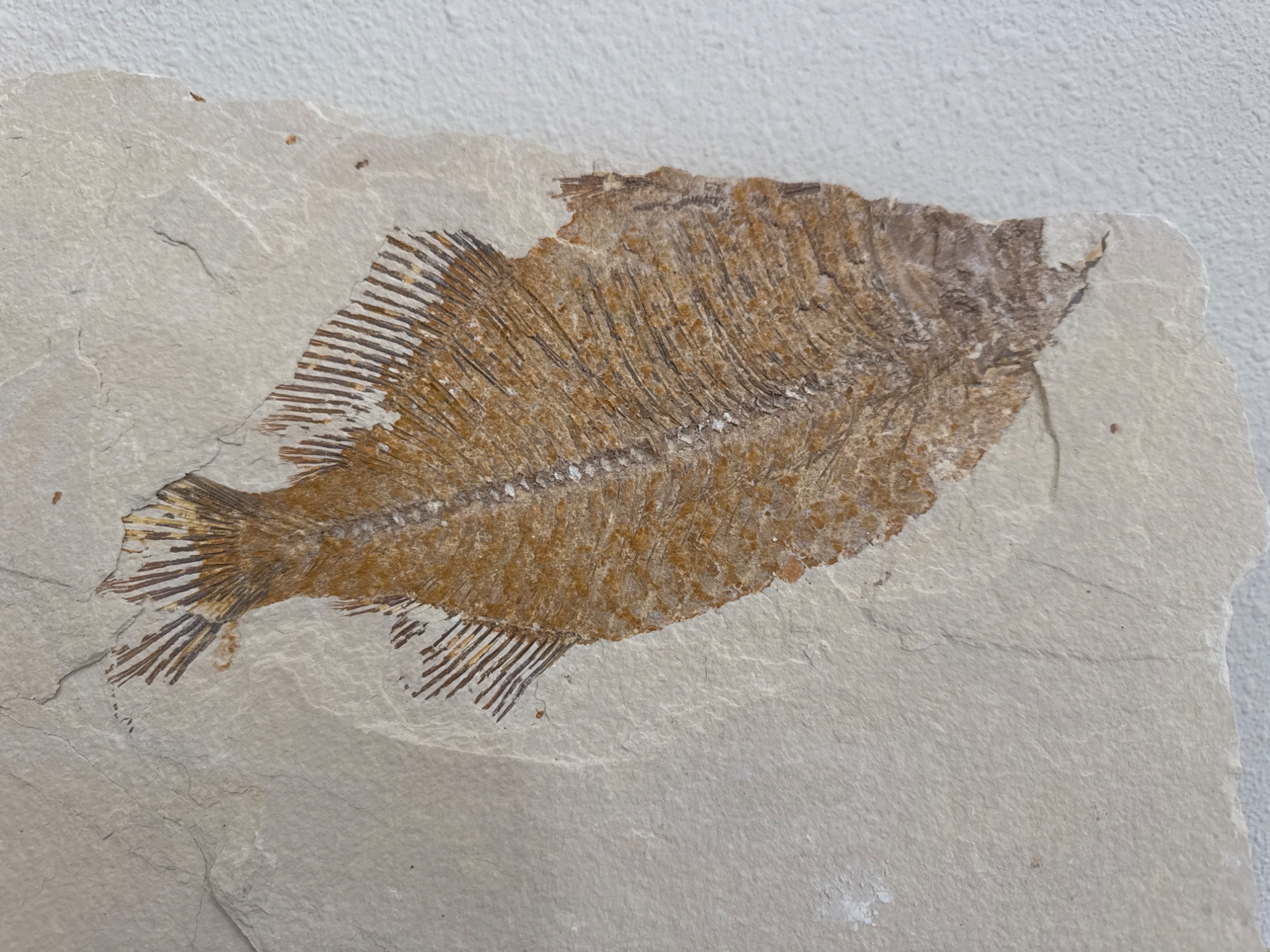 This is a Knightia fossil, a well-preserved fish fossil likely from the Green River Formation in Wyoming. The details in the fins, scales, and overall structure are impressive, making it a desirable specimen for collectors or display.