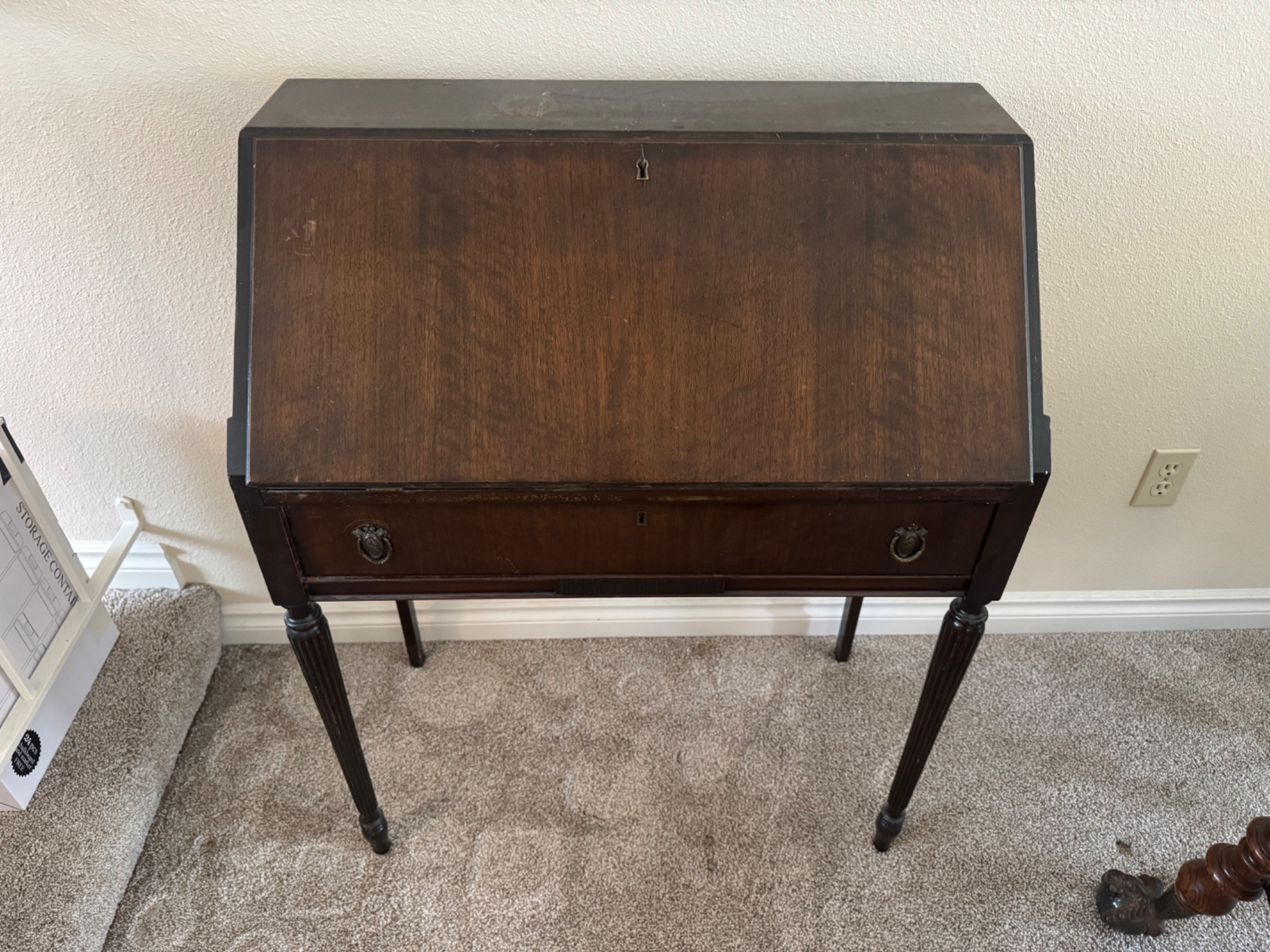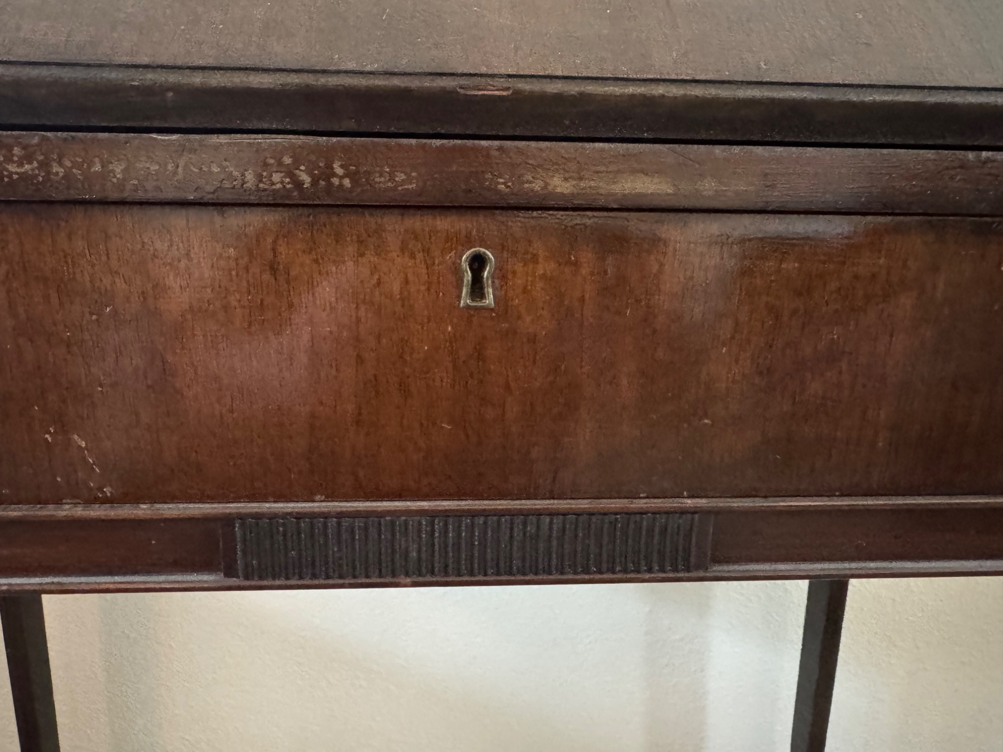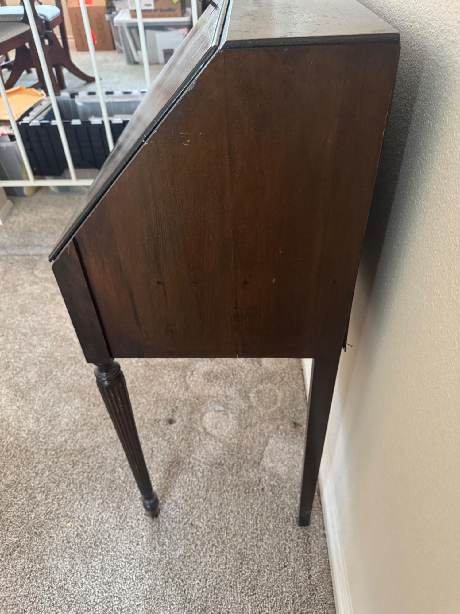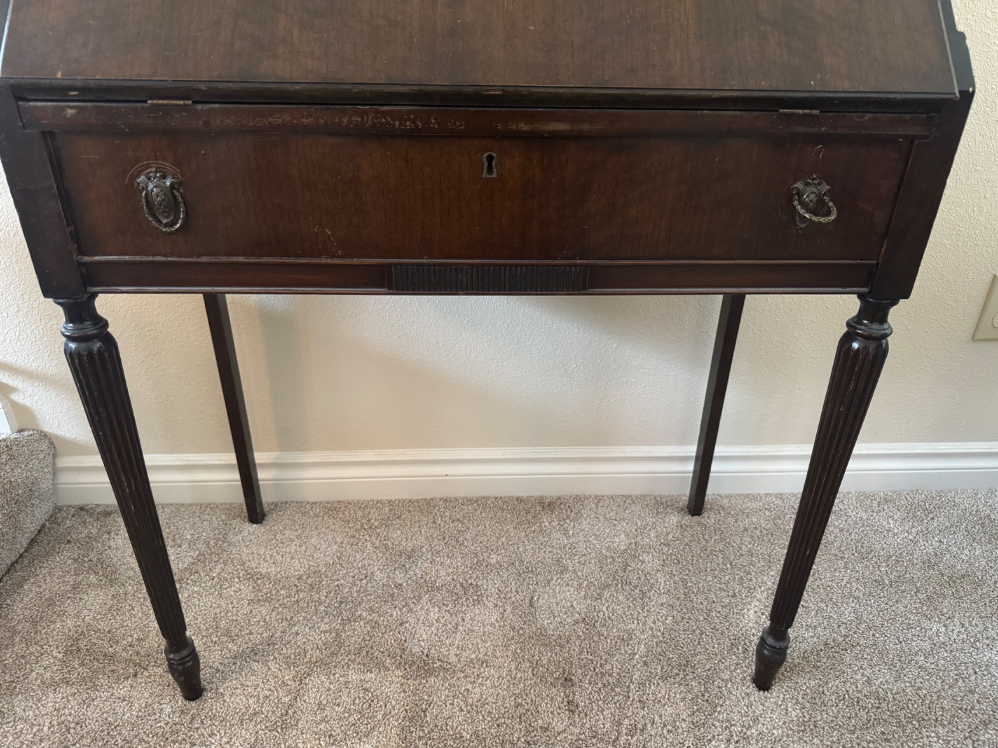 This is an antique drop-front secretary desk, likely from the early to mid-20th century. These types of desks feature a hinged writing surface that folds down to reveal storage compartments and cubbies inside. The fluted, tapered legs and dark wood finish give it an elegant, vintage appeal. This desk has some wear, as seen by the pictures, and is a great project for restoration. This desk has the key with it.