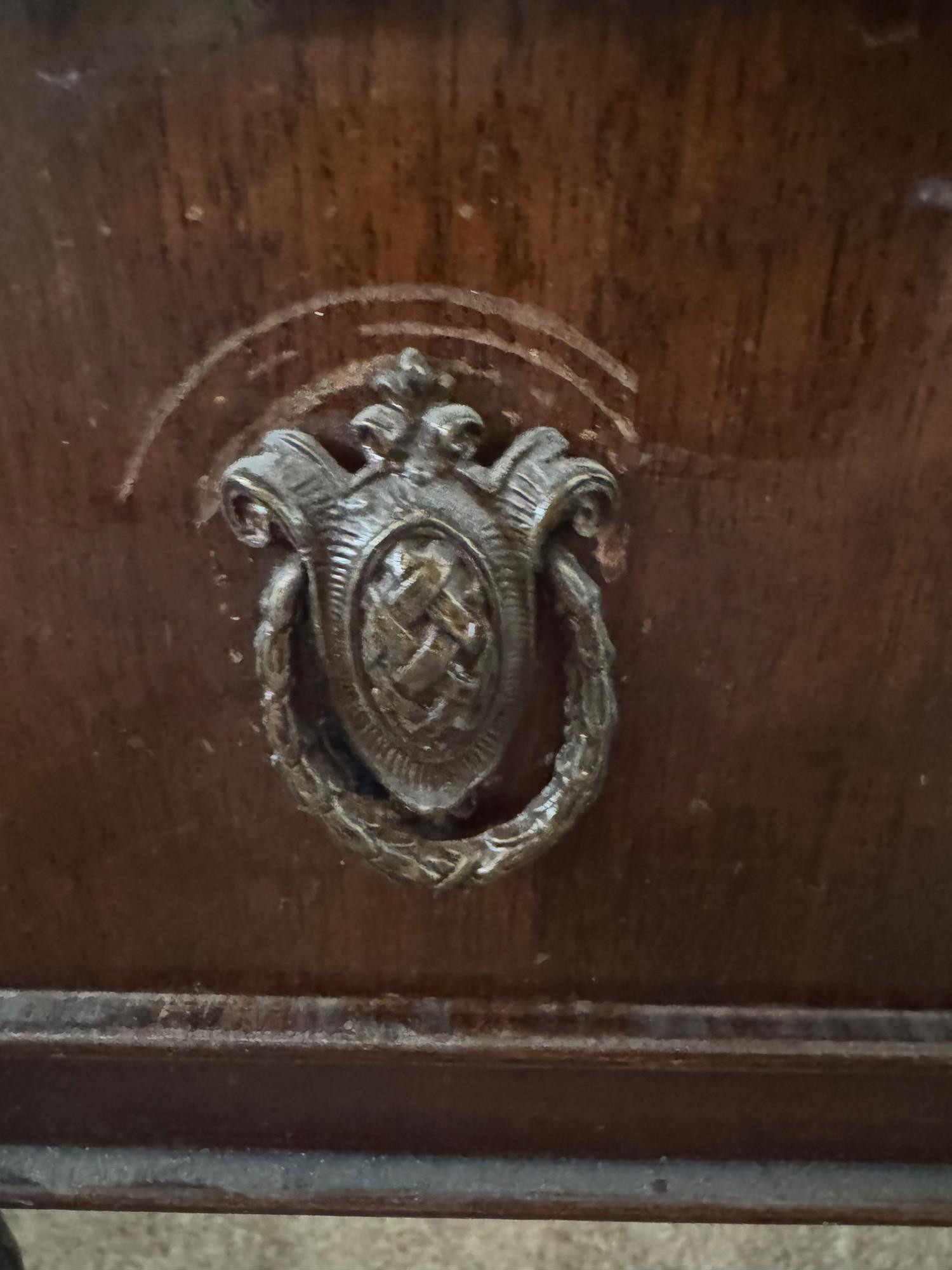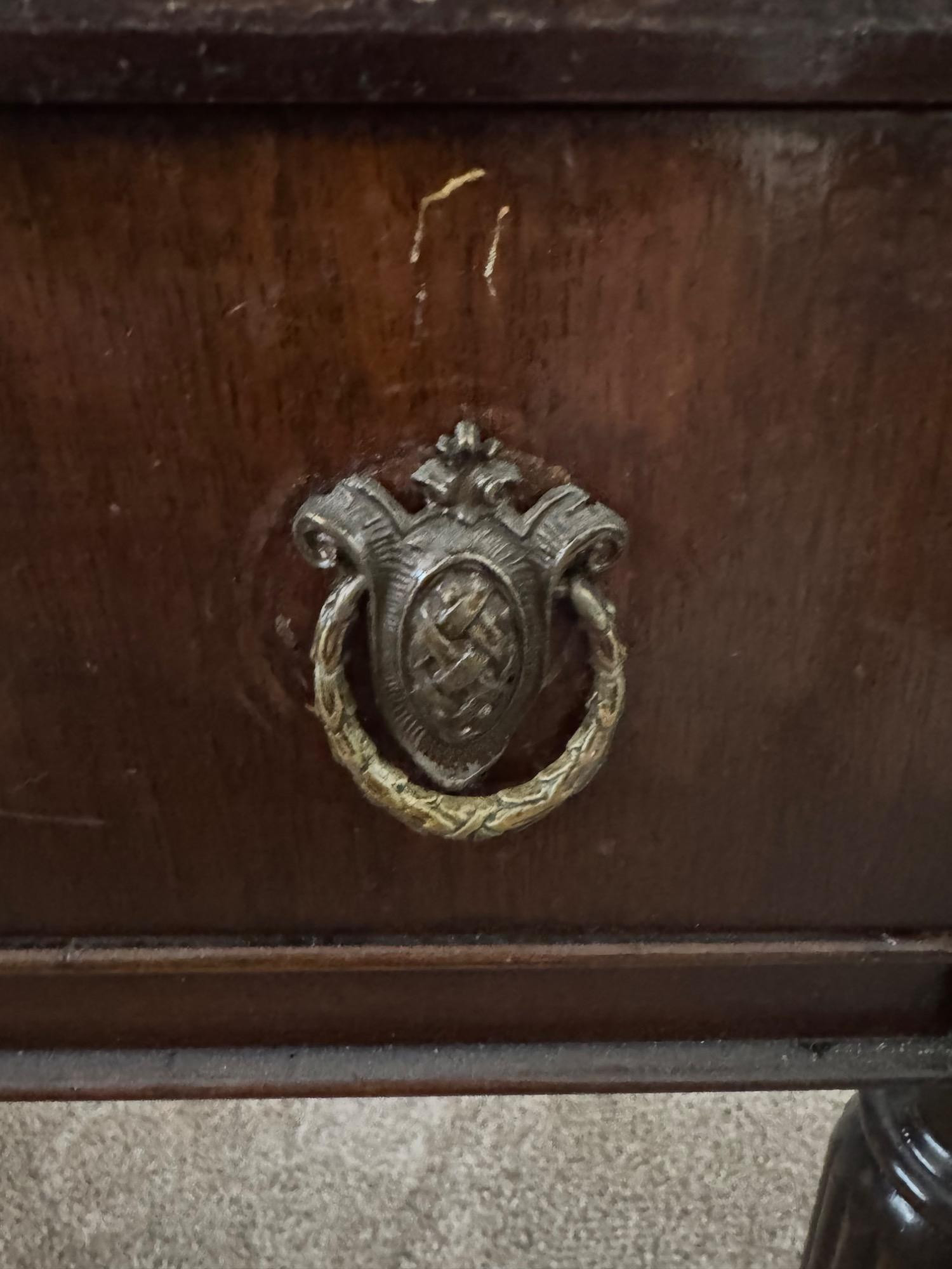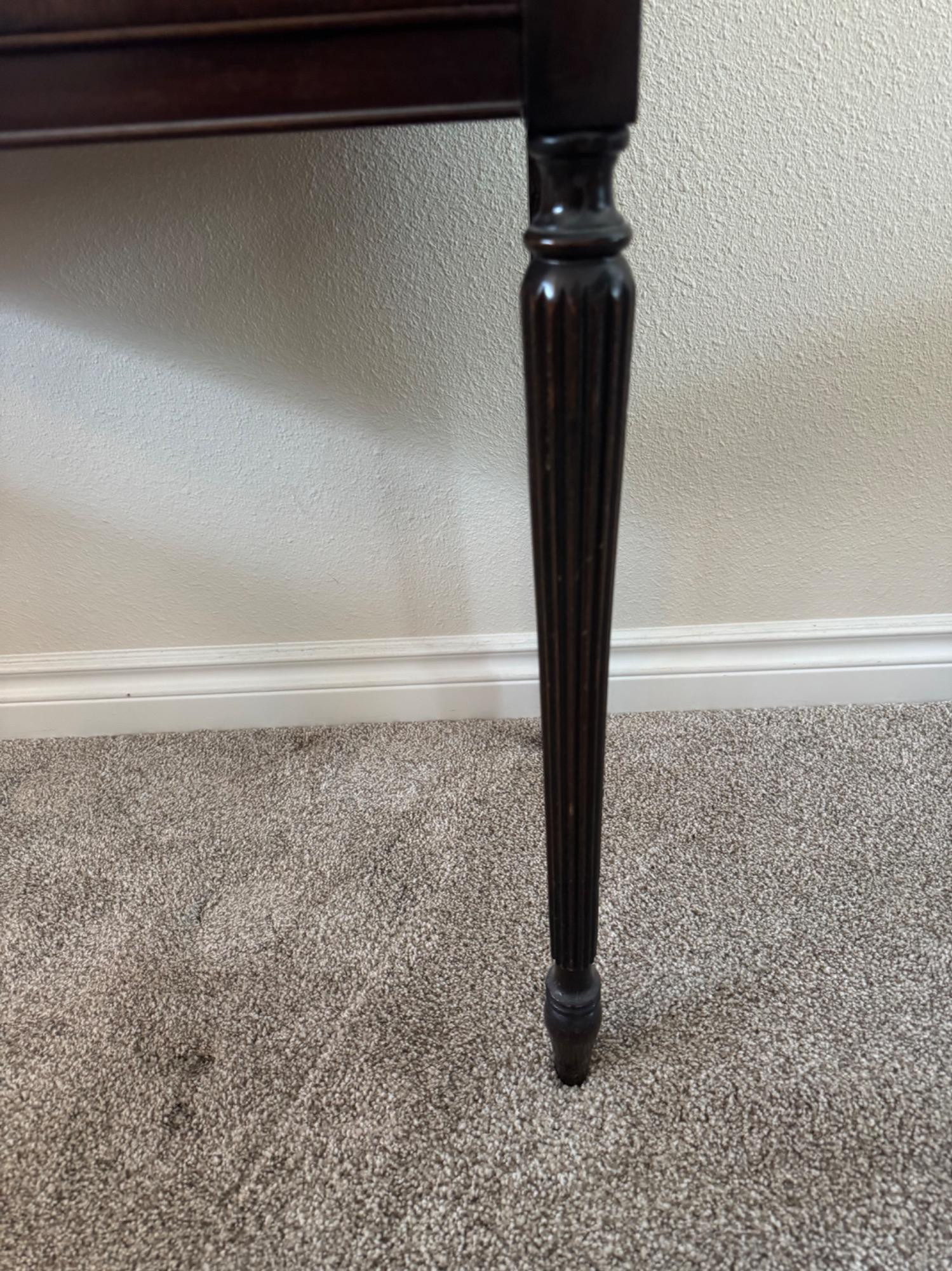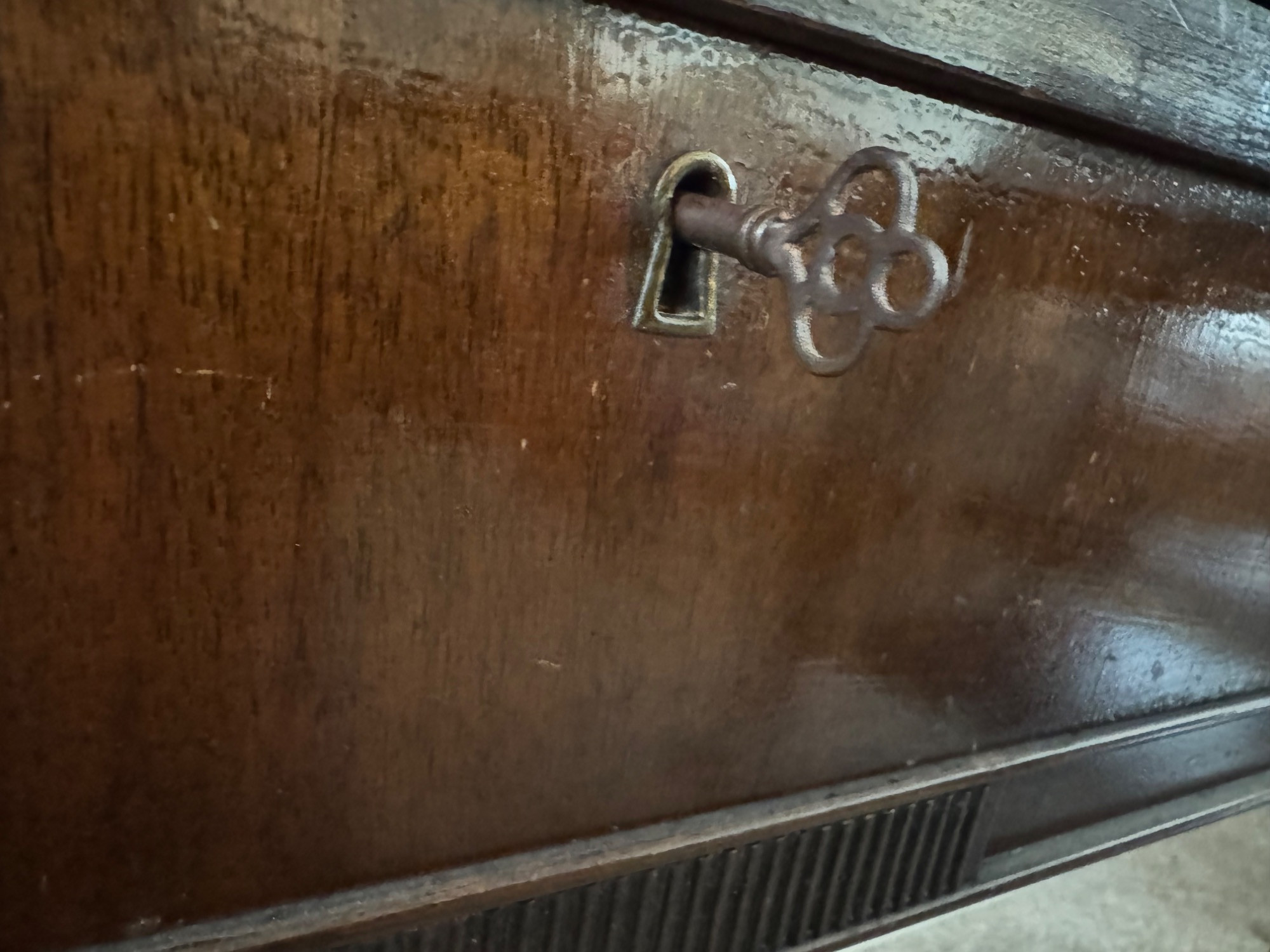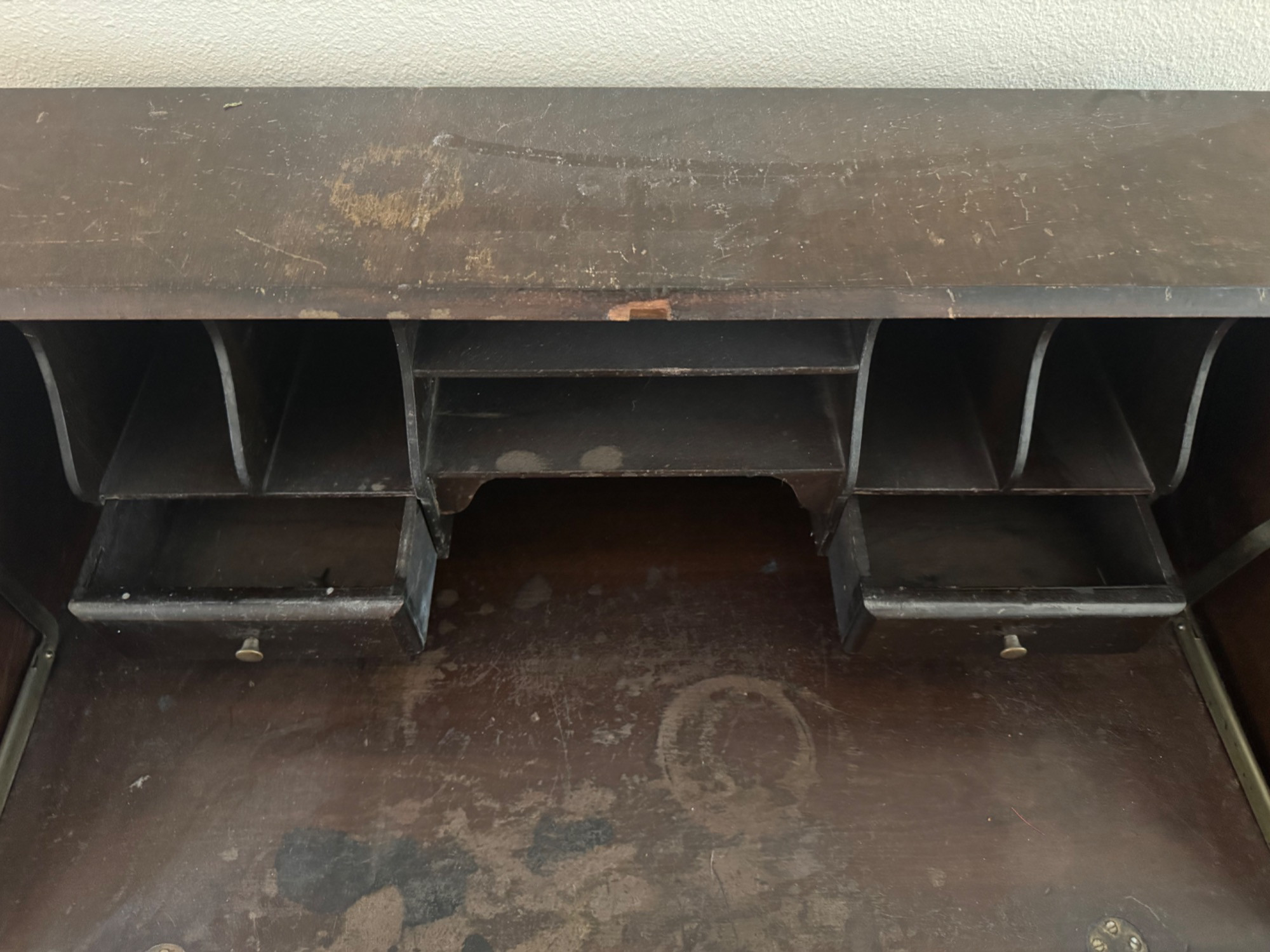 This is an antique drop-front secretary desk, likely from the early to mid-20th century. These types of desks feature a hinged writing surface that folds down to reveal storage compartments and cubbies inside. The fluted, tapered legs and dark wood finish give it an elegant, vintage appeal. This desk has some wear, as seen by the pictures, and is a great project for restoration. This desk has the key with it.