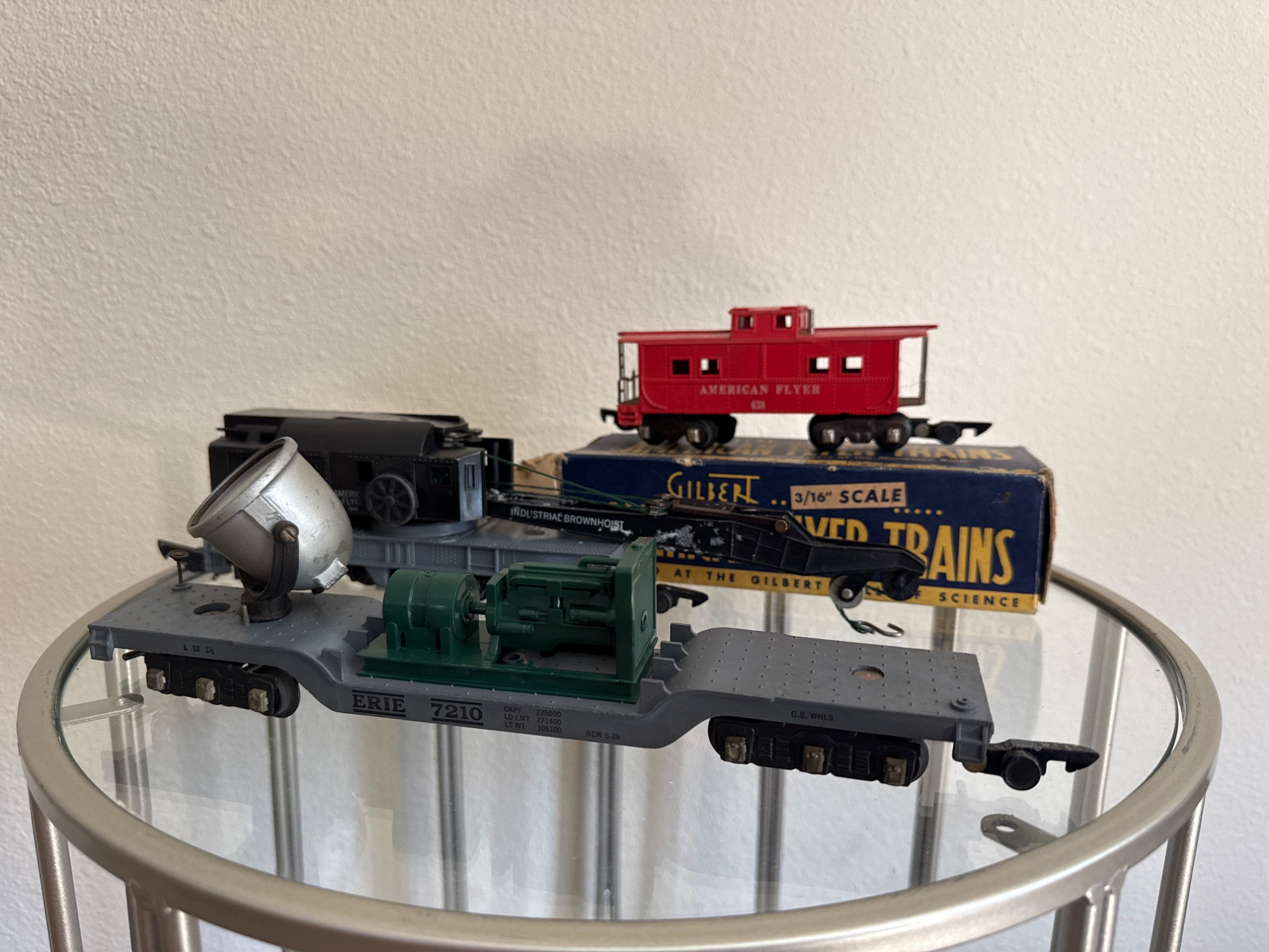 Lot # 40 - Qty 3 -American Flyer 638 Caboose, 7210 Searchlight, 644 Crane Car