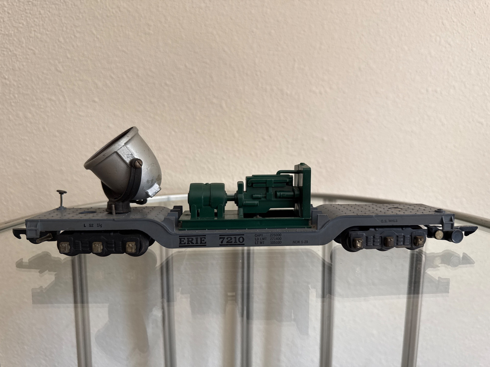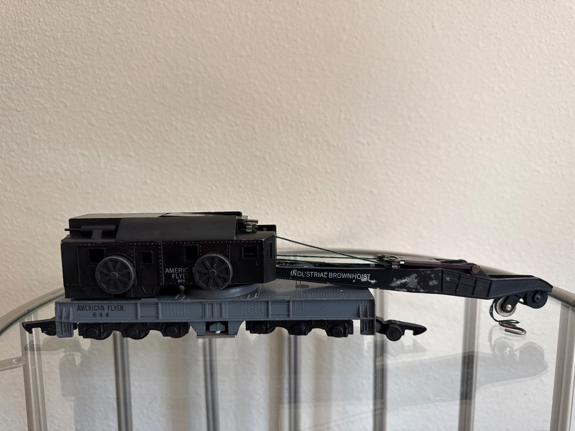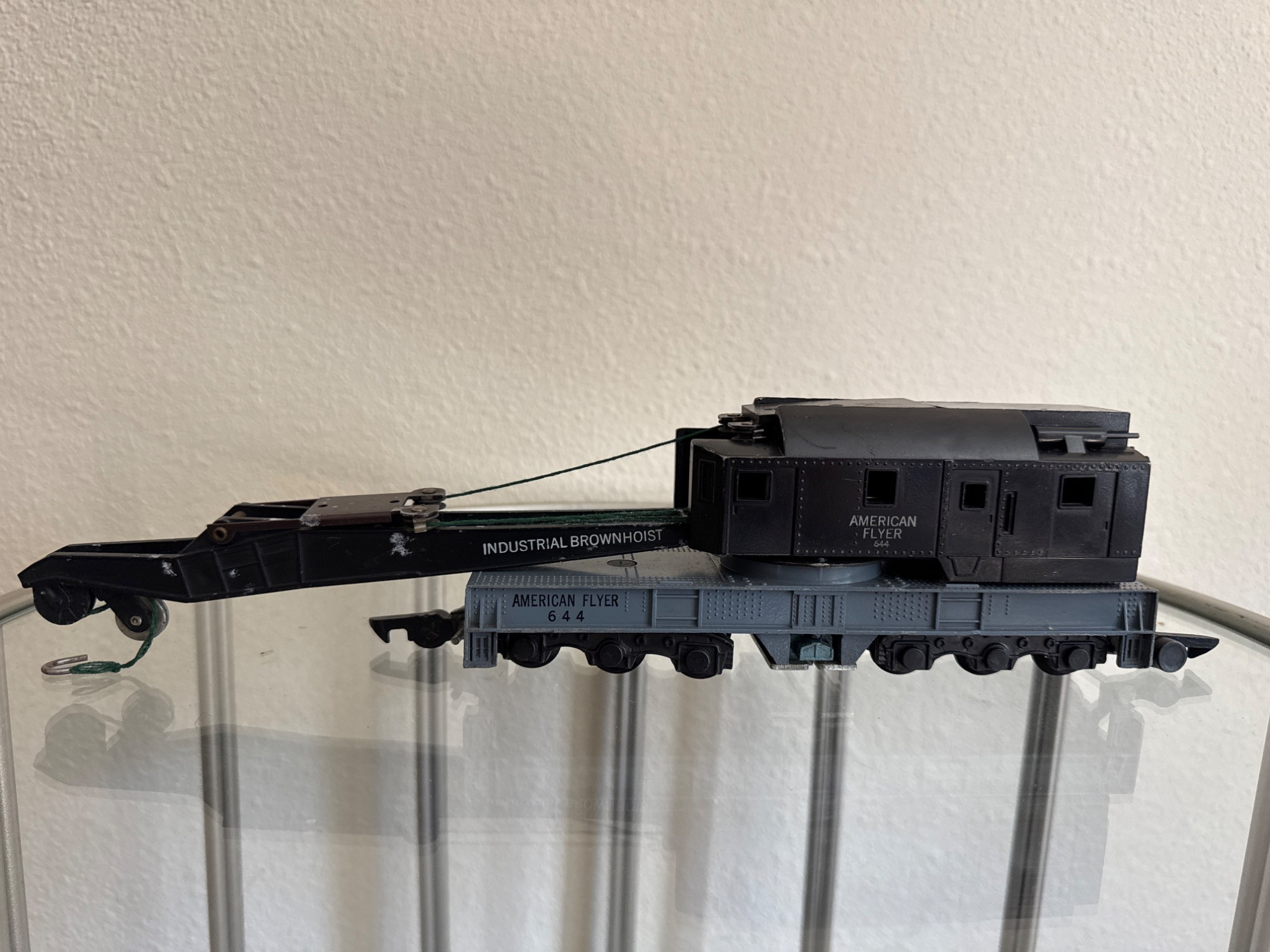 The American Flyer 638 Caboose is a classic S-Gauge train car produced by A.C. Gilbert Co. under the American Flyer brand, primarily during the 1940s and 1950s. The American Flyer 7210 Erie Searchlight is a vintage S-Gauge freight car produced under the American Flyer brand, likely in the postwar era by A.C. Gilbert Co. The American Flyer 644 Crane Car is a classic S-Gauge accessory produced by A.C. Gilbert Co. under the American Flyer brand. It is a highly sought-after piece for collectors and model railroaders.
