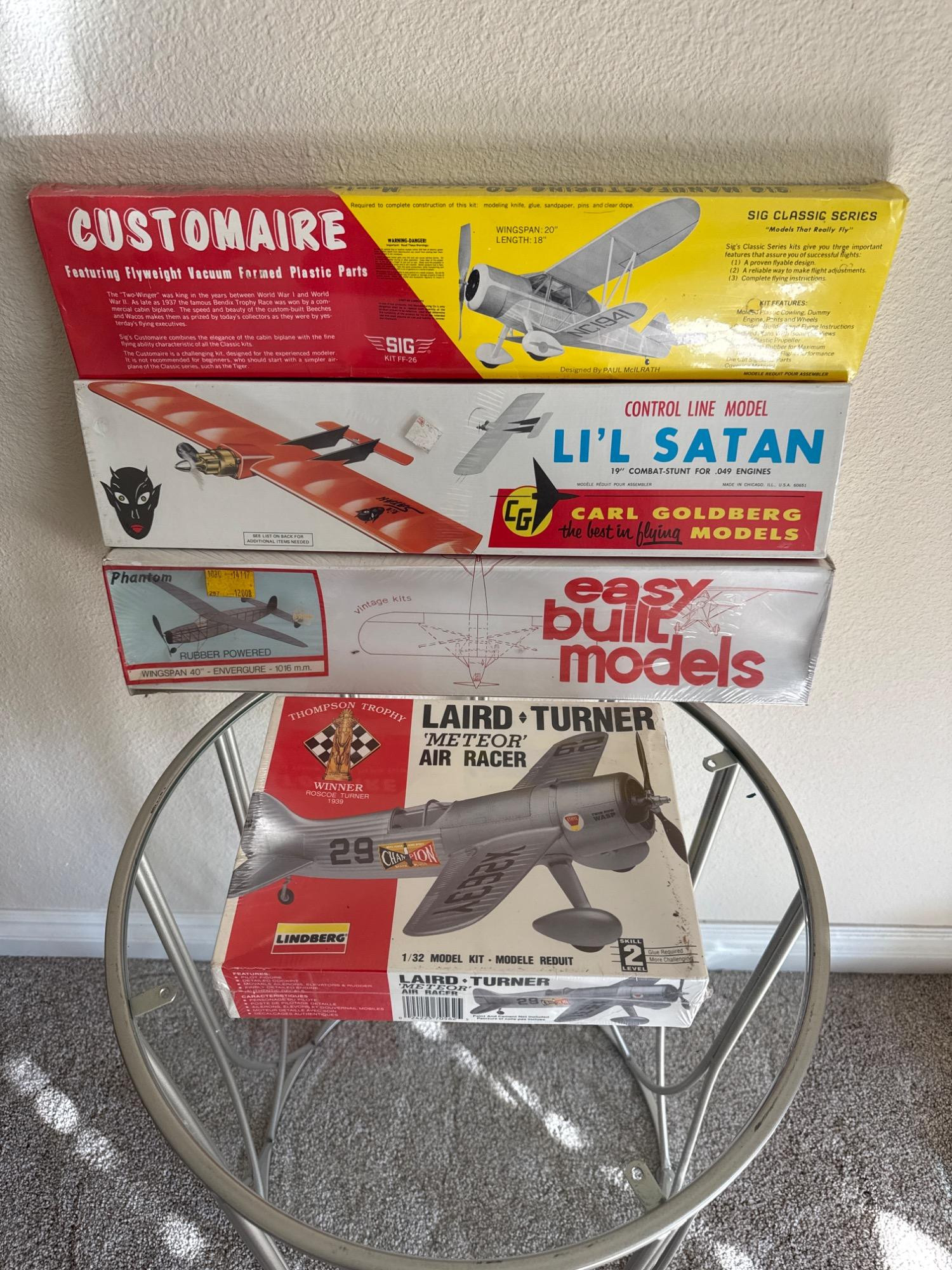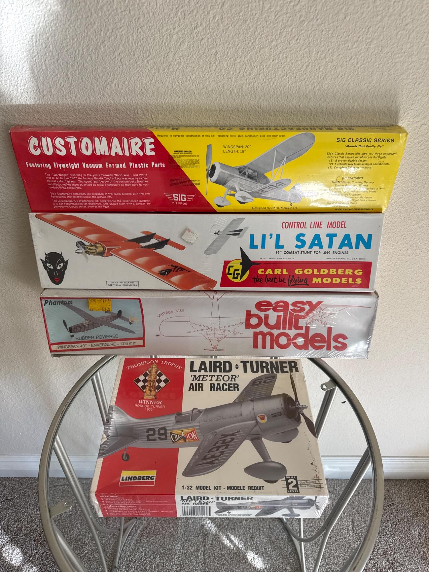 Lindberg 1992 70562 Laird Turner Meteor Air Racer 1:32 Scale Vintage SIG Classic Series Customaire Balsa Model Airplane Kit FF-26 Carl Goldberg Li'l Satan G12-195 Combat Stunt 19" CL Model Airplane Kit Easy Built Models "Phantom" Flying Scale Model