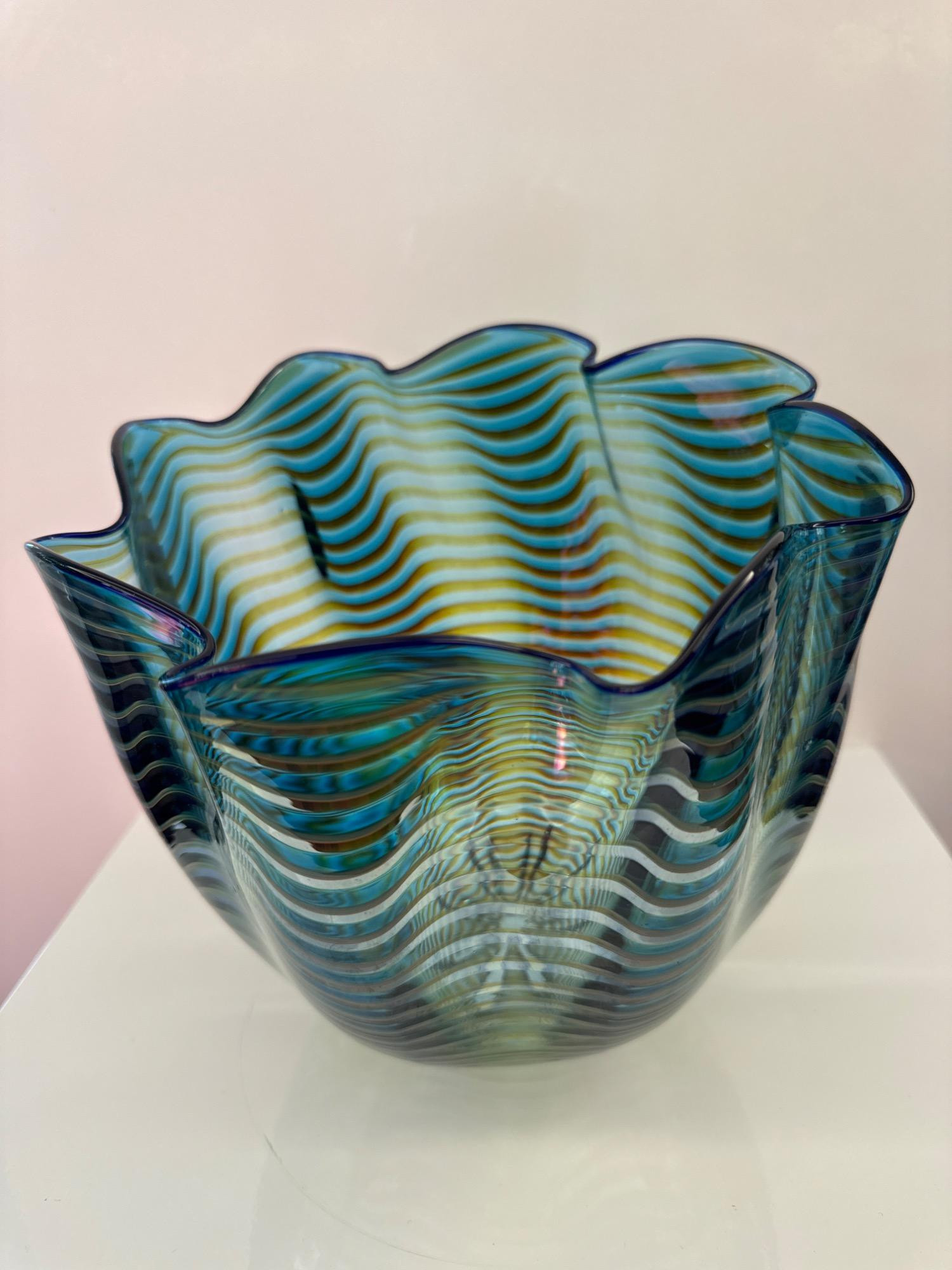 Dale Chihuly is an internationally renowned American glass artist known for his innovative and large-scale glass sculptures. His work is characterized by vibrant colors, organic forms, and intricate patterns. Chihuly revolutionized the art of glassblowing by pushing the boundaries of what was traditionally possible with glass, often creating massive installations that resemble natural forms like sea creatures, flowers, or flowing water. You are bidding on a signed Dale Chihuly - Teal Blue Seaform Persian Basket The case seen in the photos is included.