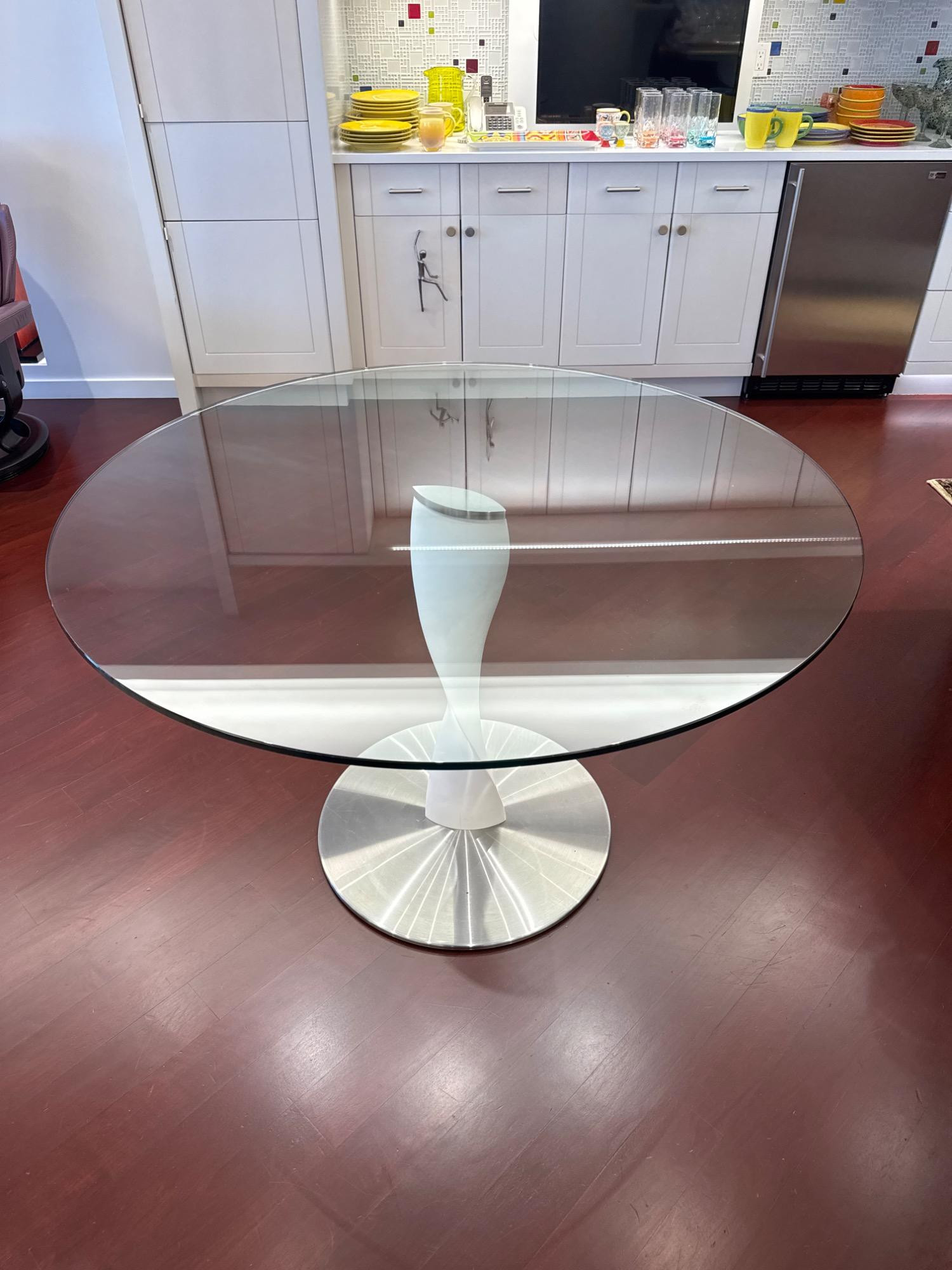 Aptly named, the Spin dining table by Porada offers a fun, inviting style to a modern home. The sculptural metal base spins around for a geometric touch, and the intricacies showcase the manufacture's incredible craftsmanship. The smaller round base plate and larger round top's mirrored look bring a chic, balanced look that you'll love. The transparent glass top gives you a fantastic aerial view of the base, while the ceramic offers outstanding scratch resistance. Not only is this table aesthetically pleasing, but practical as well. There is plenty of room for the whole family during meals and dinner parties. Manufactured in Italy to ensure quality. Retail - $3700.00 https://www.roomservice360.com/porada-spin-dining-table.html# https://www.porada.it/en/product/spin/