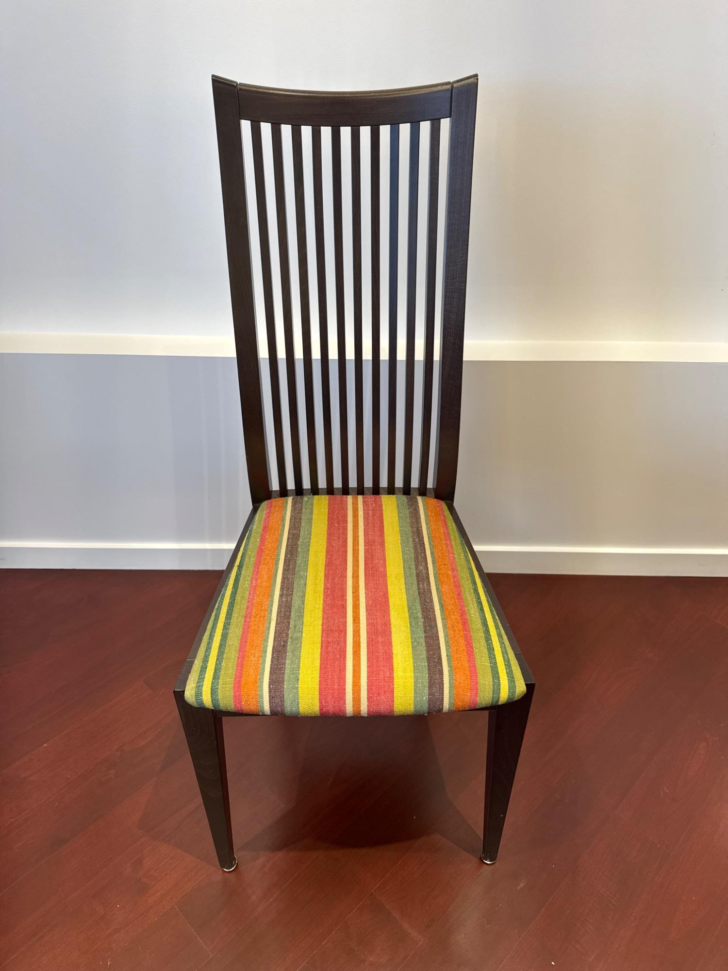 You are bidding on 6 chairs. No makers mark. These chairs have a contemporary design with a high slatted backrest, a dark wood frame, and a colorful striped upholstered seat. The style is reminiscent of modern or Art Deco-inspired dining chairs.