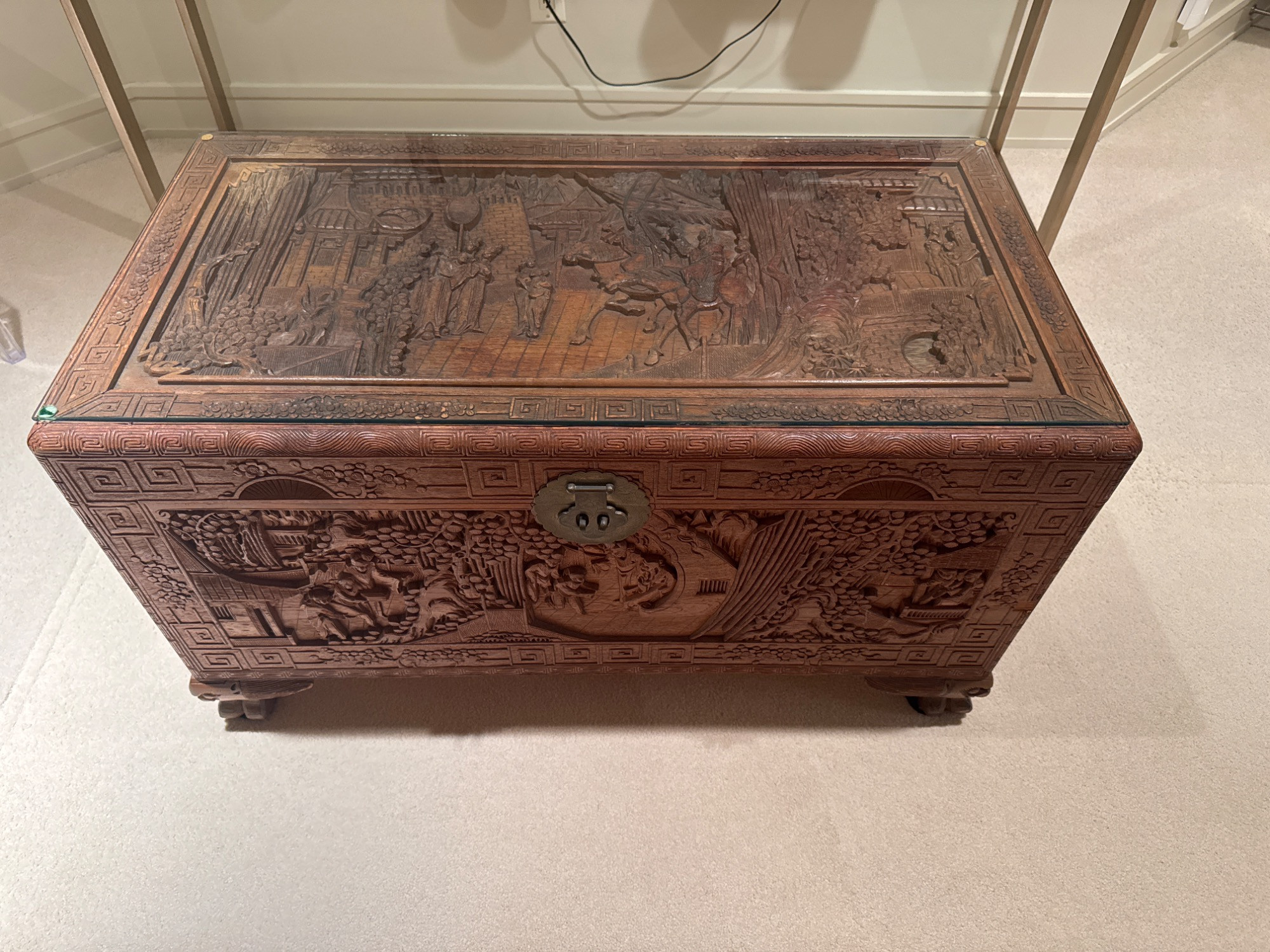 Vtg Chinese Decorative Carved Chest w/ Lock from Bullocks Los Angeles The story represented by the carving on this chest is entitled; - "Chao Chun" who was an exceedingly beautiful noblewoman. In order that there might be peace between China and Mongolia who were warring against each other at the time, She was compelled by the Chinese people to marry the King of Mongolia and in so doing peace between the two countries was restored.