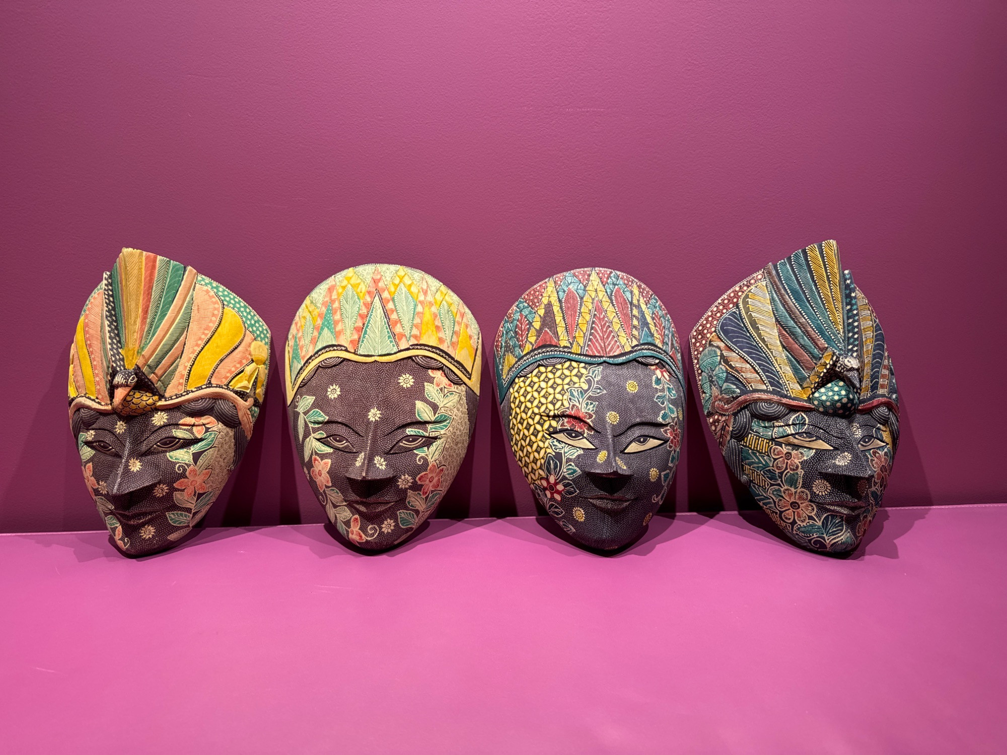 Folk art at its finest. These hand-carved wooden masks are adorned with batik designs formed by applying vegetable dyes one color at a time. Each mask is about 14” tall x 9" wide. Batik patterns is a textile art form popular in Indonesia, Malaysia, and other Southeast Asian cultures. These masks are often used for decorative purposes, cultural performances, or ceremonial events. Features of a Batik Mask