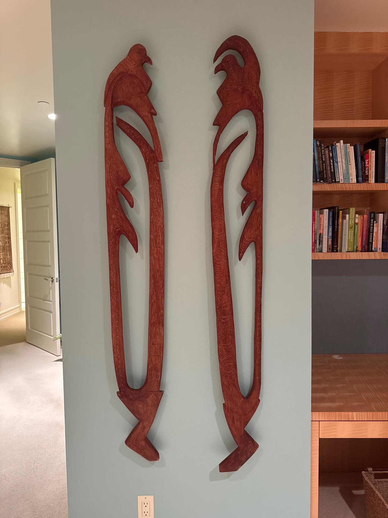 Papua New Guinea has one of the richest and most diverse artistic traditions in the world, with each region and tribe contributing unique styles, materials, and meanings to their art. Their art is deeply connected to spiritual beliefs, rituals, and daily life, often reflecting ancestral stories, nature, and mythology. Here we have two (2) hand carved figures both with birds on their heads. These each measure about 65 inches tall and 9 inches wide. These were purchased while in Papua New Guinea, in 2009, and done by a local artist. Picture included shows the artist with their creations.